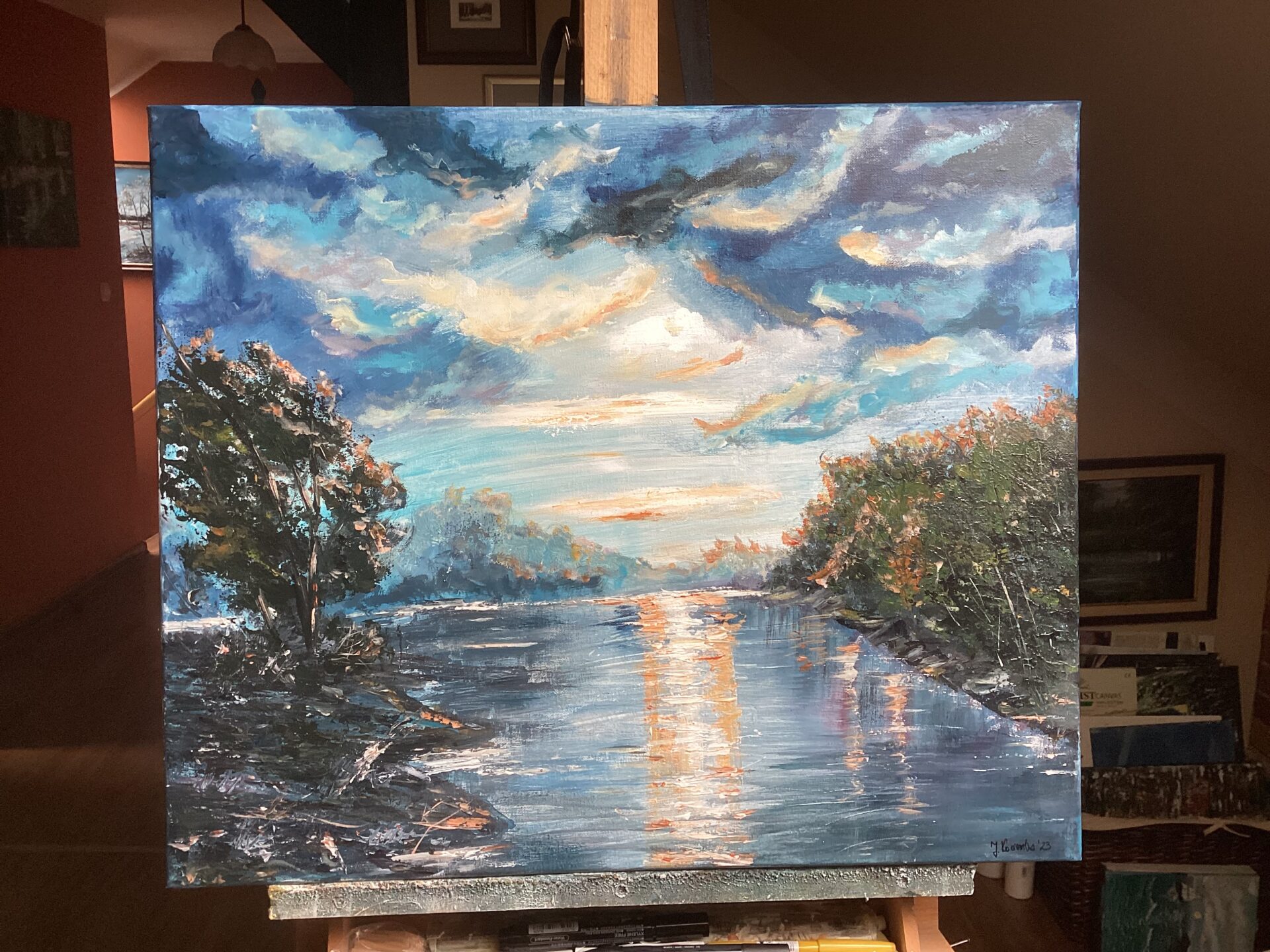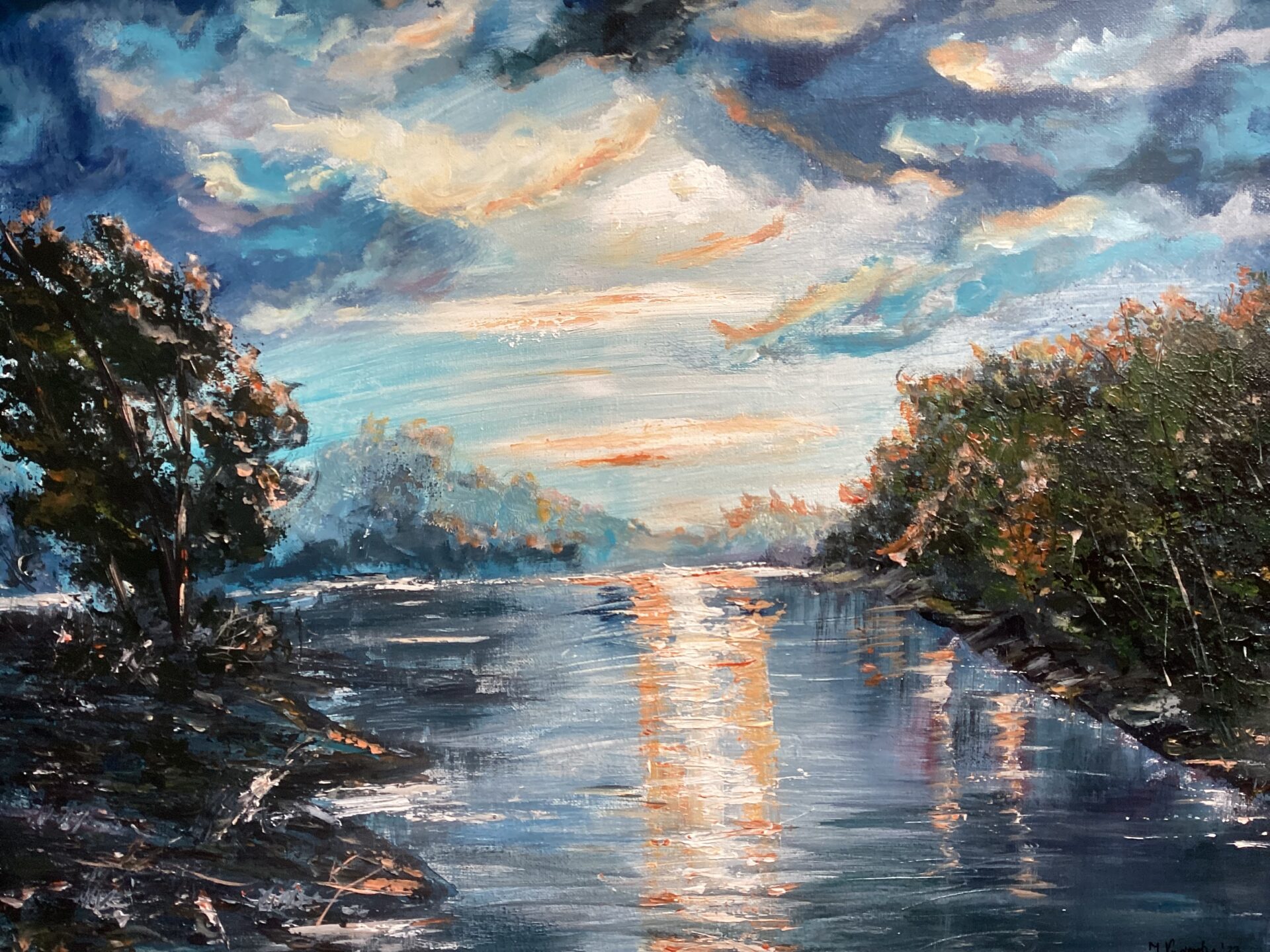 Pejzaż z motywem wody. Dominujące barwy to ciepłe ,stonowane odcienie ultramaryny ,błękitu, urozmaicone kontrastujacymi barwami pomarańczu, żółcieni i beżu na chmurach podświetlanych przez promienie chylącego się ku zachodowi słońca.Każdy zachód słońca jest magicznym przeżyciem, tworzy bowiem na niebie niepowtarzalne obrazy. Ktoś kiedyś powiedział:” ten ,kto nie dostrzega wokół nas, tak naprawdę nie żyje. ”