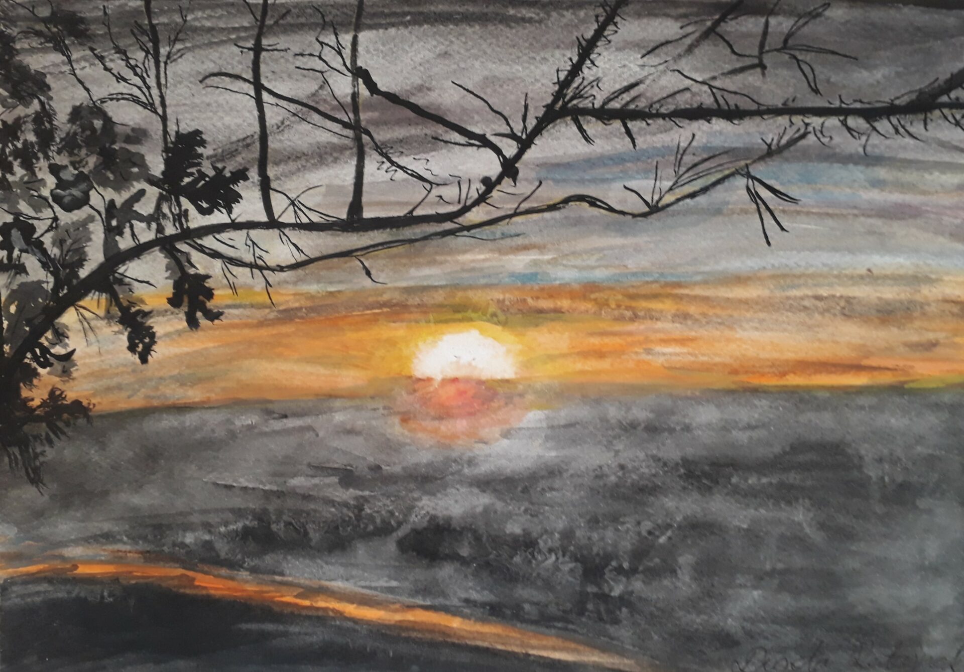 Obraz Doroty Ratajczak. Wykonany techniką akwareli na papierze. Posiada metalową ramkę w kolorze czarnym.