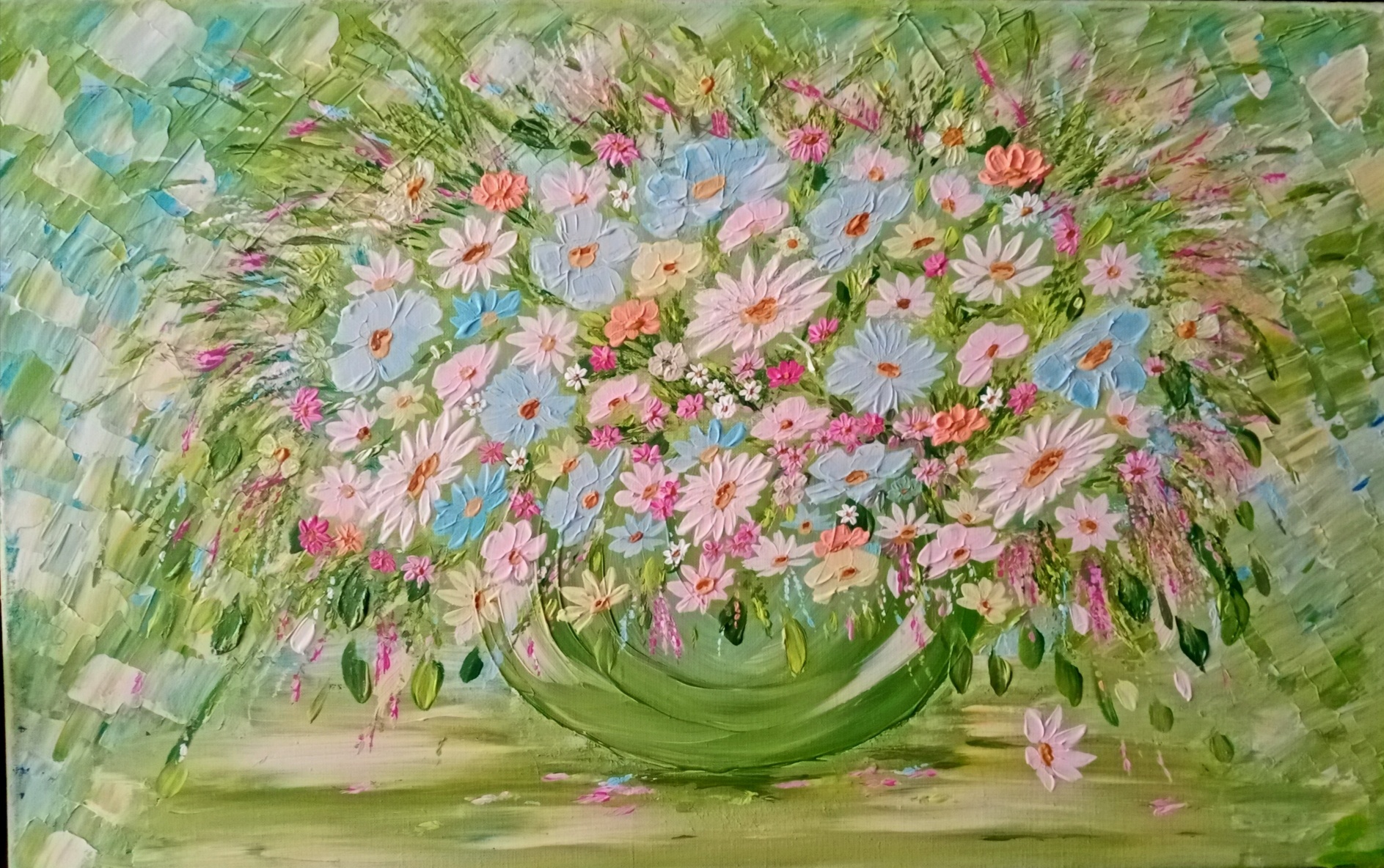 Obraz namalowany na profesjonalnym podobraziu . Płótno nabite na sosnowe krosno. Podobrazie posiada kołki rozporowe. Gramatura płótna 380 gr/m2. Grubość listwy 2 cm.Użyte zostały wysokiej jakości farby akrylowe. Gruba faktura farby.Wymiary 50 x 80.Do pracy dołączam certyfikat. Jest to moja pracaObraz jest sygnowany i zawerniksowany.Boki zamalowane w tonacji obrazu.Do obrazu dołączam certyfikat. Na innej aukcji wystawiony jest podobny obraz w niebieskiej tonacji. Zdjęcie w ogłoszeniu.