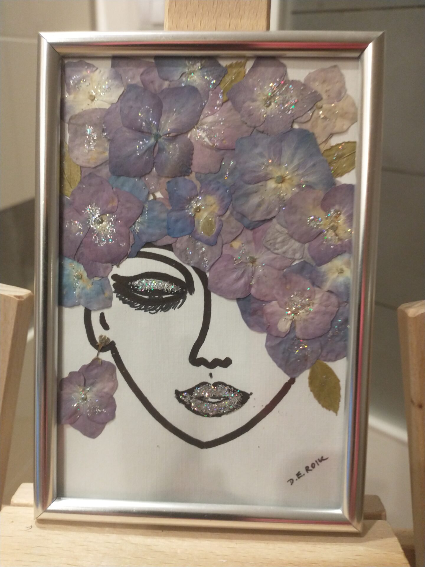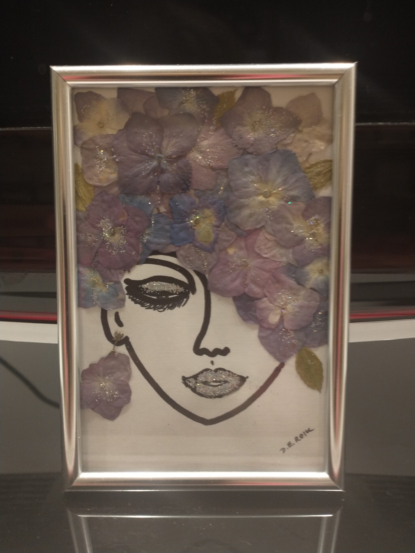 Abstrakcja w pocztówkowym formacie, „włosy” wykonane z suszonych kwiatów hortensji, całość oprawiona w ramki w kolorze srebra. Mały obrazek komponujący się w każdym wnętrzu / w biurze, w kuchni, sypialni, na salonach/ nadając otoczeniu klimatu i subtelności. Można postawić lub powiesić /ramka zaopatrzona w podpórkę/.