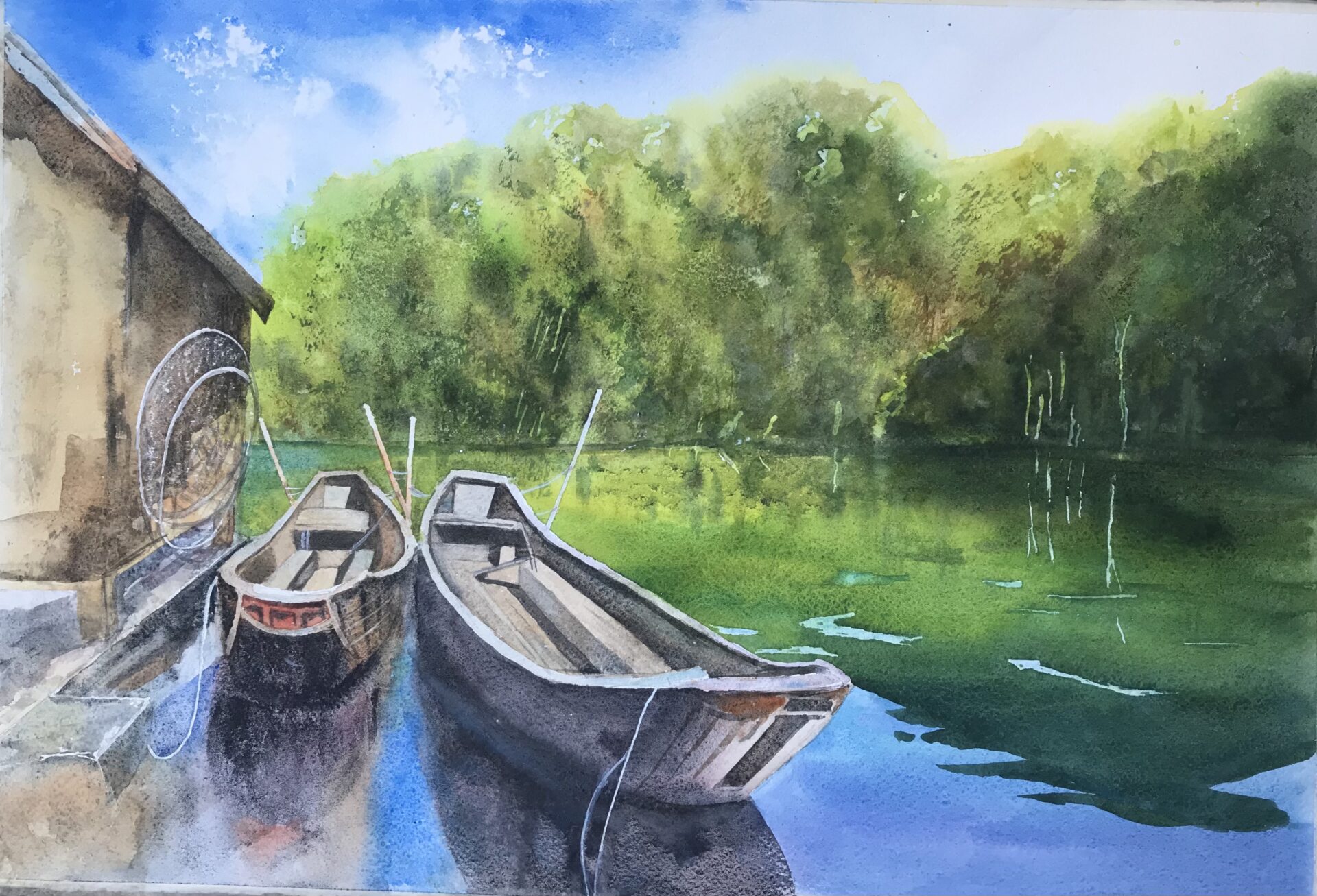 Akwarela namalowana na papierze bawełnianym Fabriano farbami amerykańskiej firmy Daniel Smith. Sama akwarela ma wymiar 56×38 cm, w podwójnym biało szarym passepartout 70×50 cm. Aluminiowa lub drewniana rama z plastikową szybą antyrefleksyjną. Obraz gotowy do zawieszenia. Wysyłka kurierska w cenie.