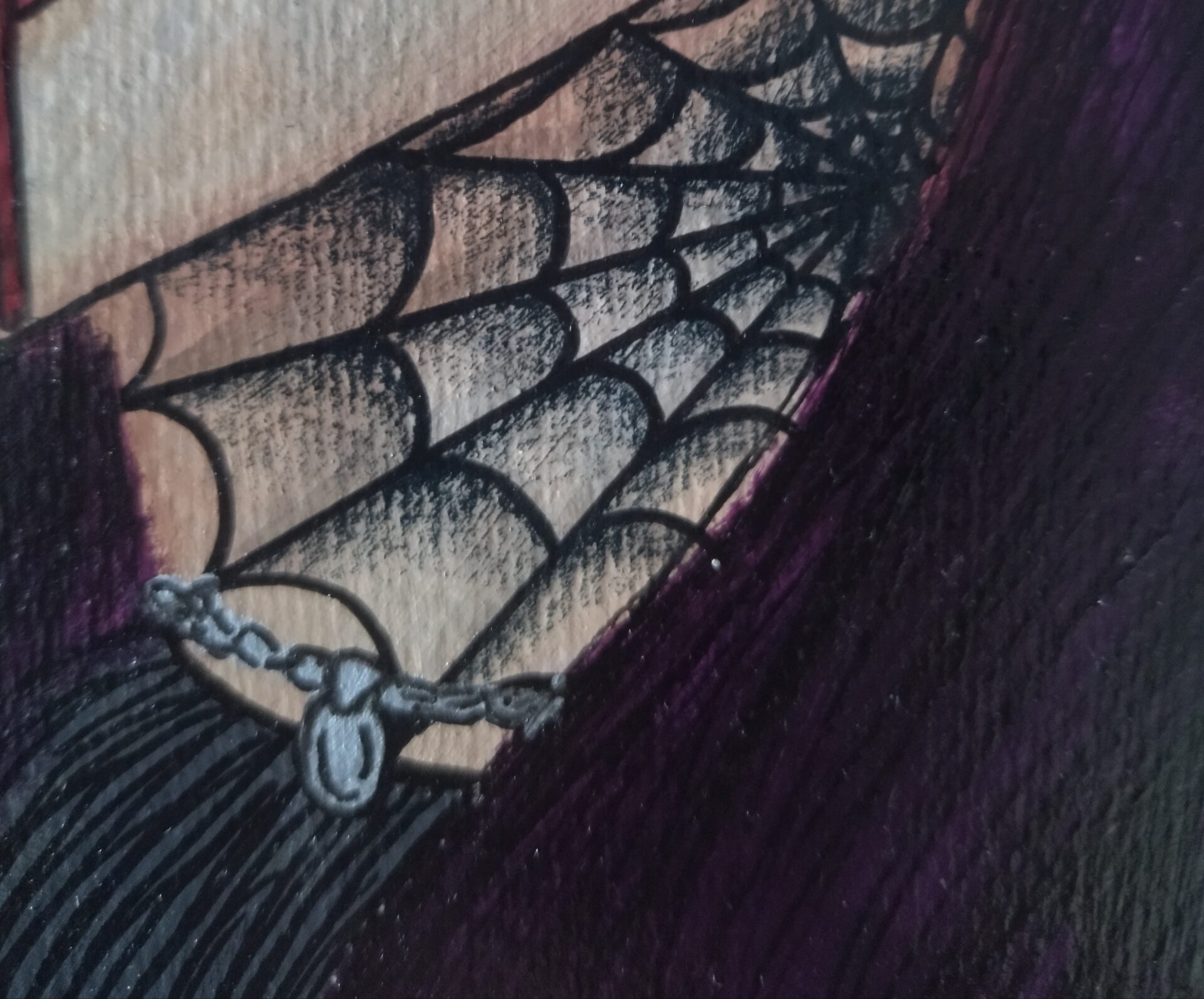 Wykonany techniką mieszaną (akryl, kredki, cienkopis)