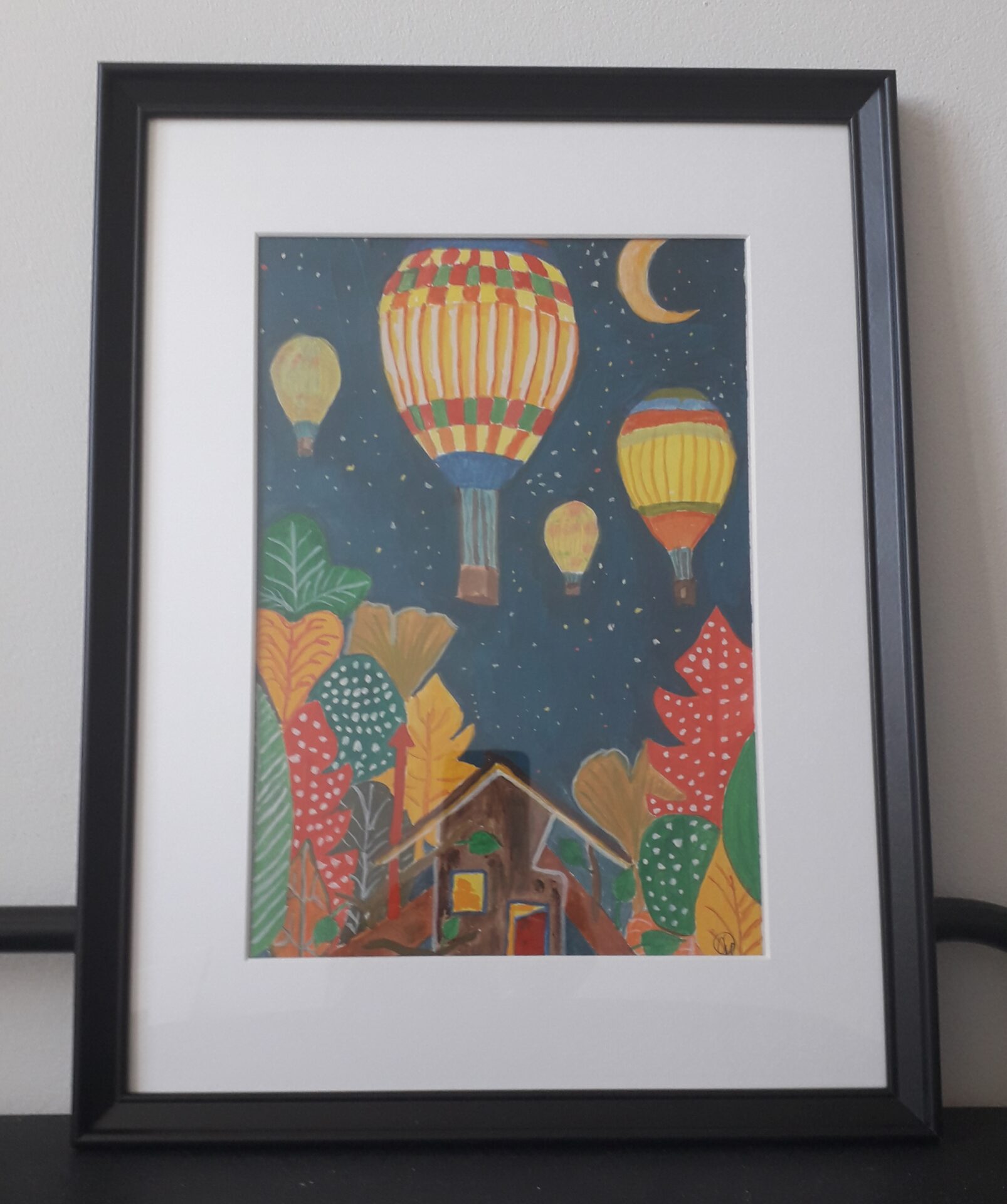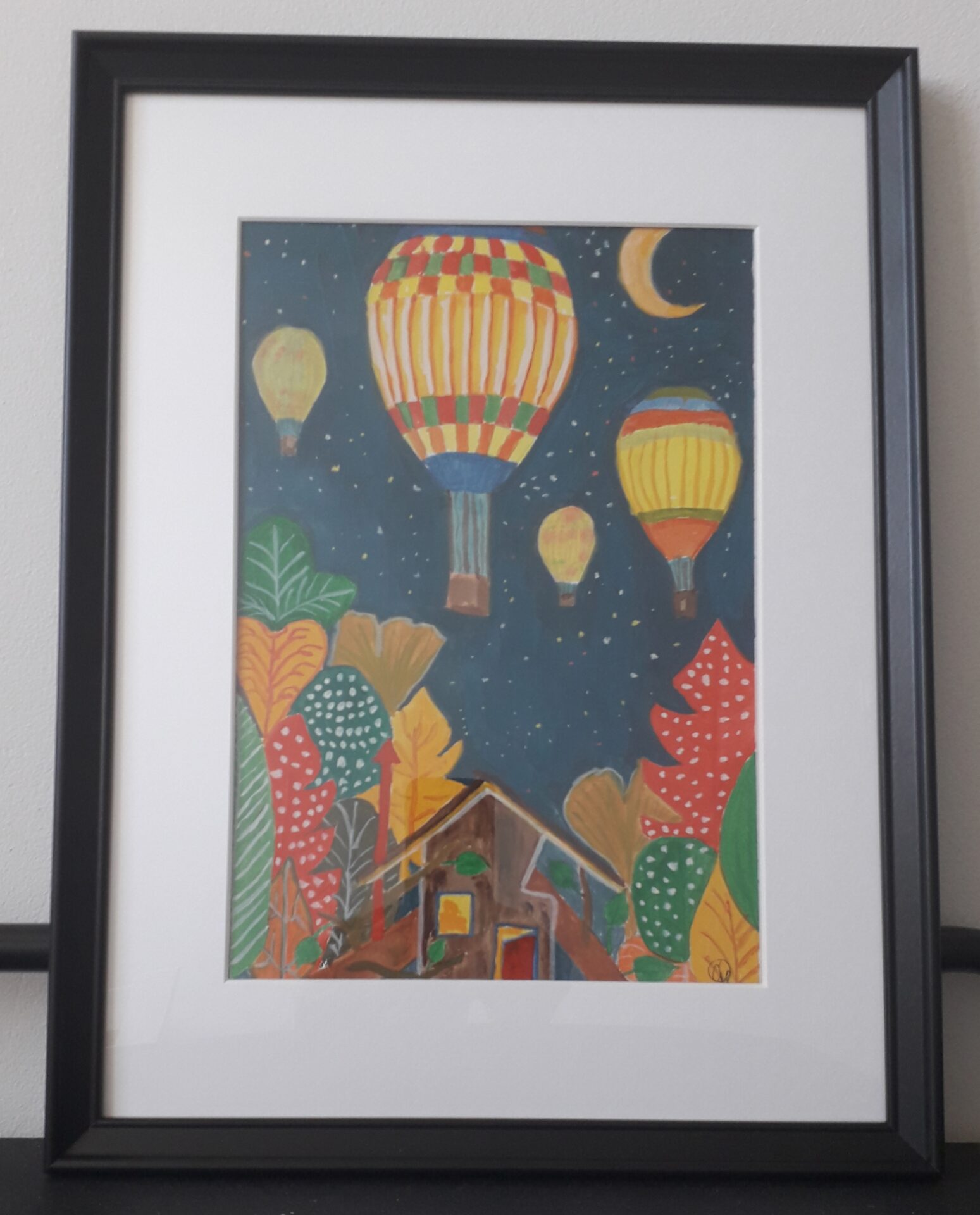 „Lot balonem” – obraz ręcznie malowany gwaszem na kartonie introligatorskim. Wymiary obrazu 21 cm x 30 cm. Sygnowany. Idealny do pokoju dziecka. Sprzedaję bez ramy i passpartout. Wysyłka kurierem lub do paczkomatu 20 zł