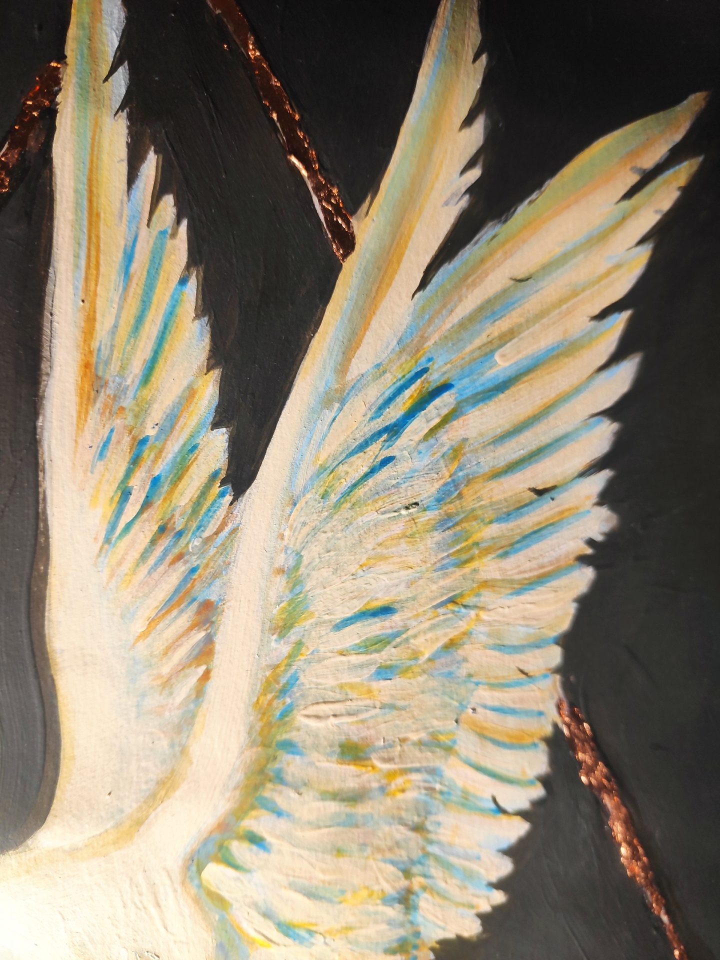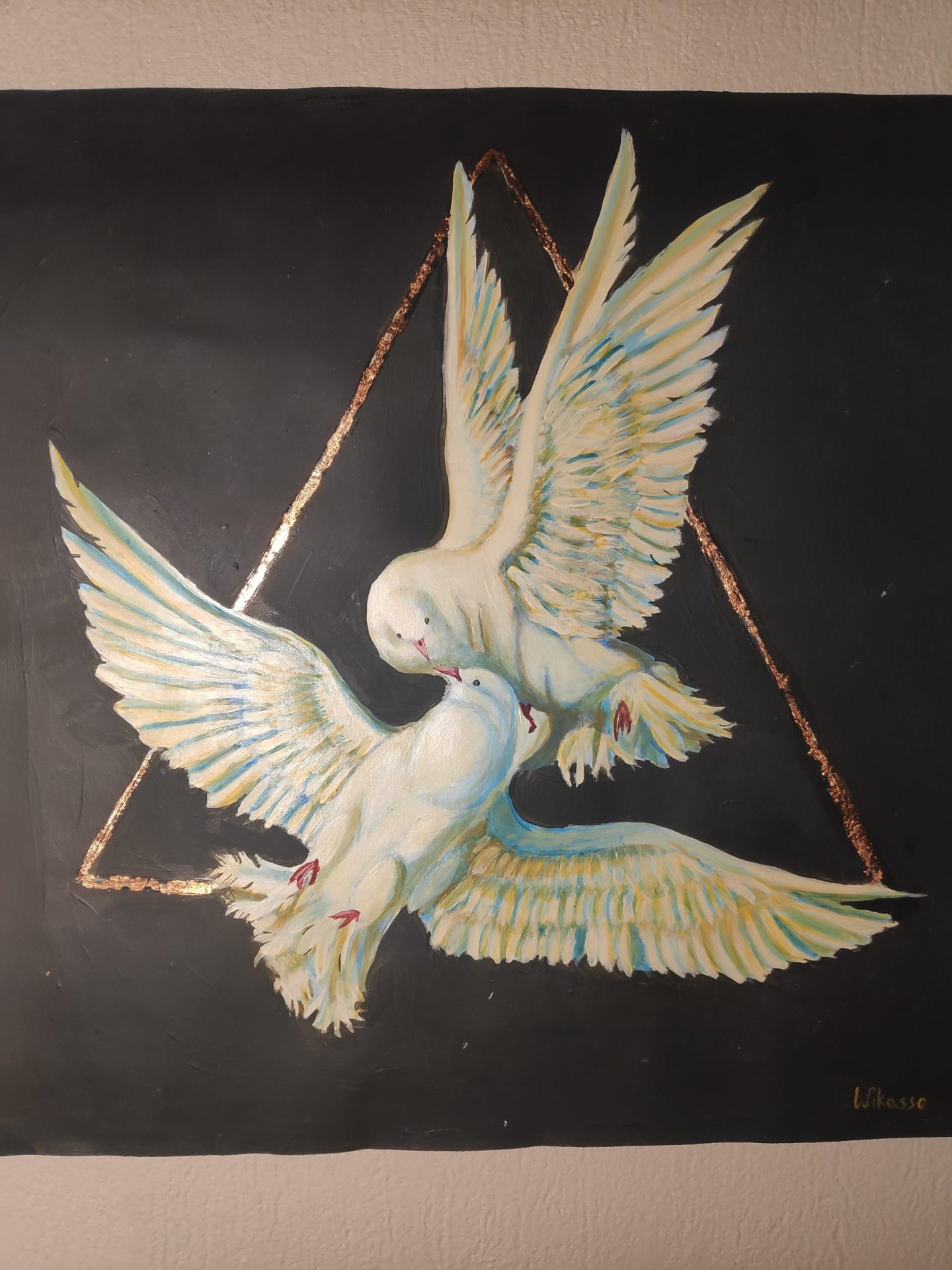Malarstwo akrylowe, papier, abstrakcja, przedstawia dwa gołębie w złotym trójkącie, bez oprawy