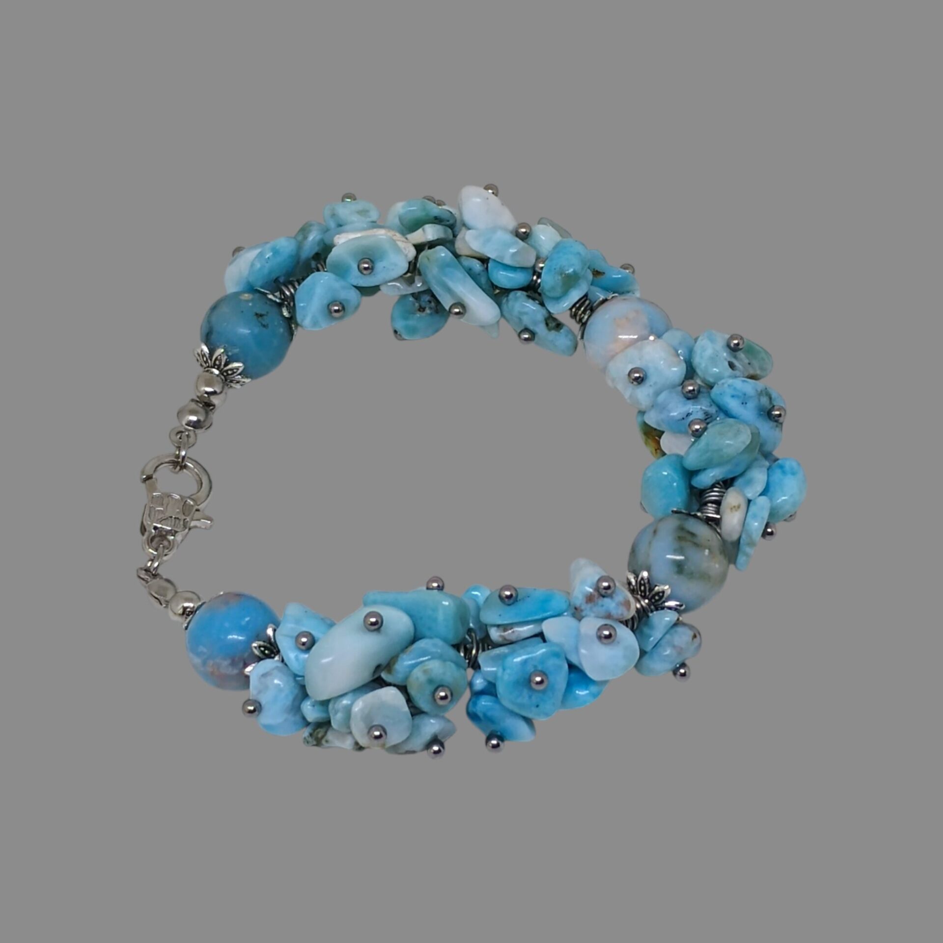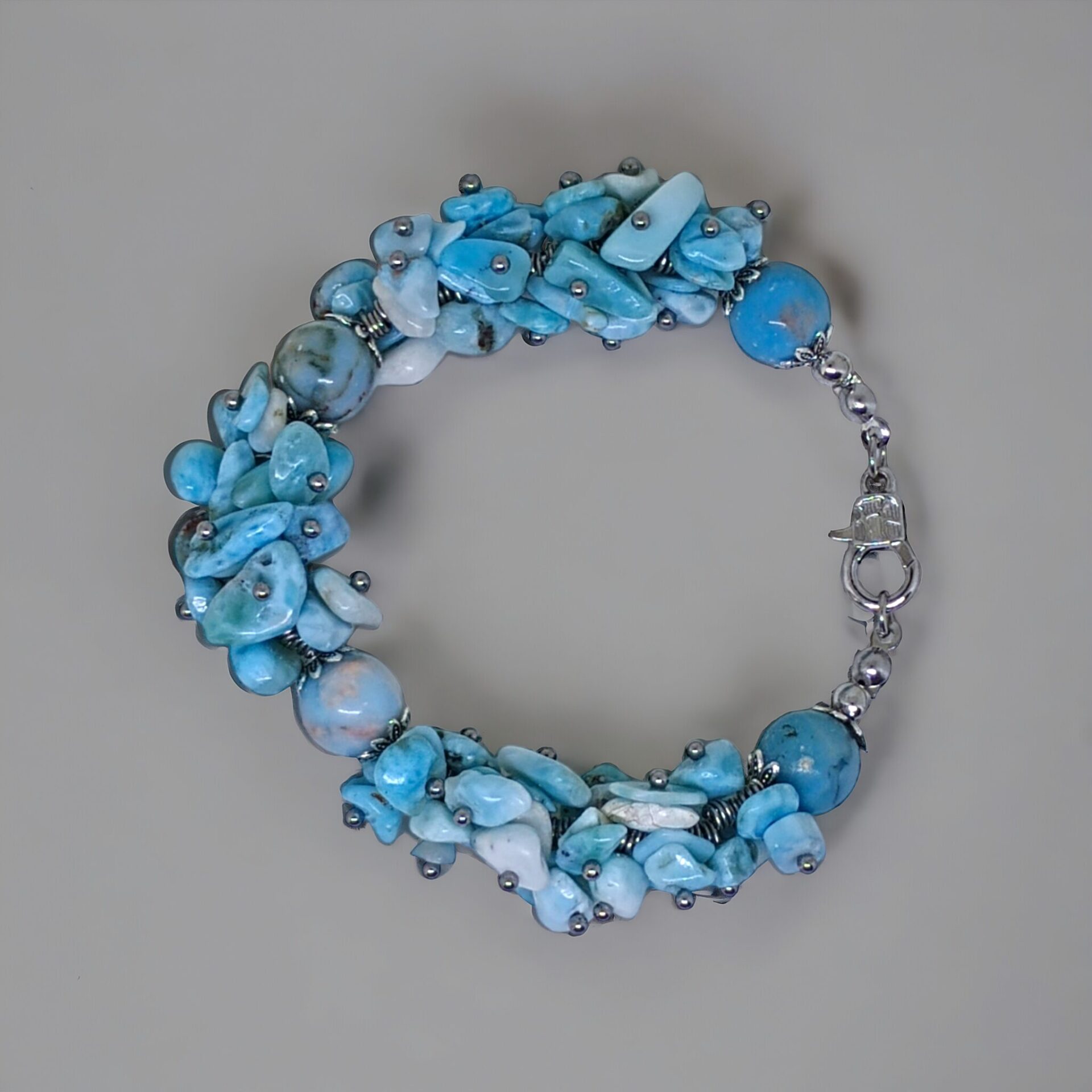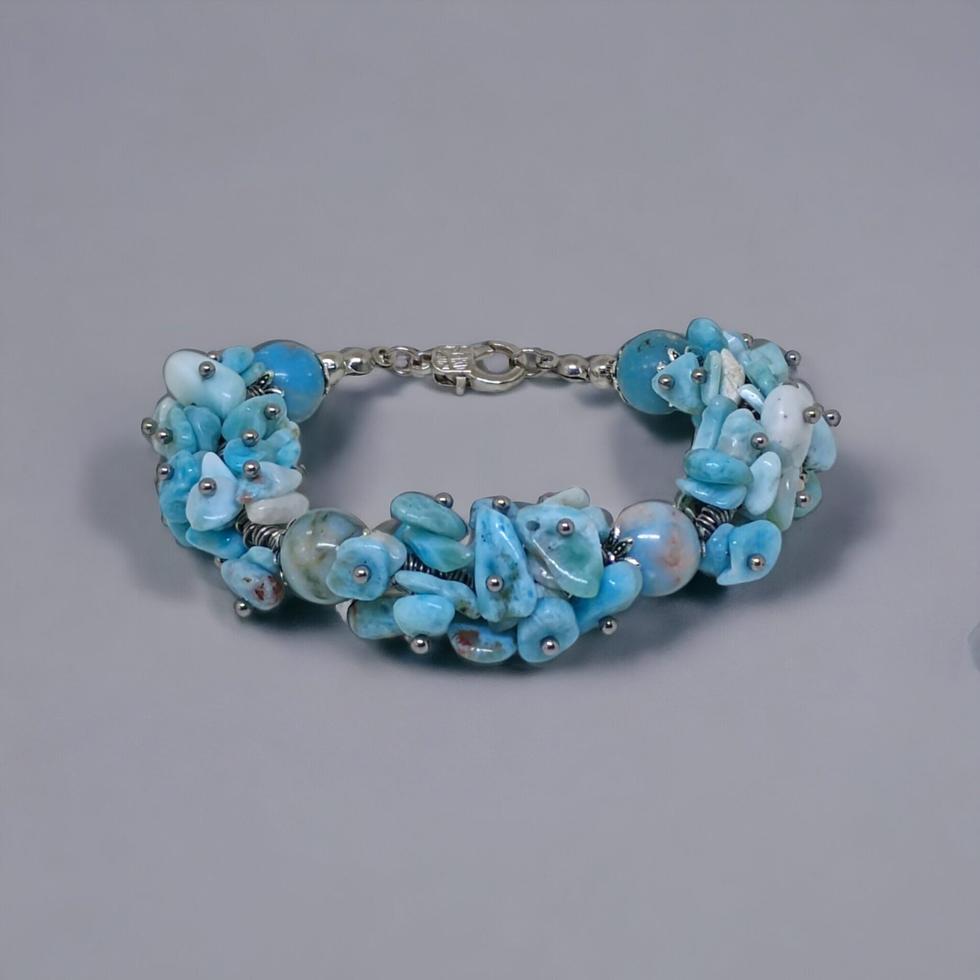 Luksusowa bransoletka z Larimaru pochodzącego z Dominikany wykonana na podwójnej lince jubilerskiej z solidnym zapięciem.Długość 18 cm, szerokość ok.2 cm.Na życzenie bezpłatnie dopasuję ją do potrzebnego rozmiaru.Wystarczy napisać na czacie lub w uwagach o zamówieniu.