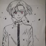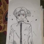 Na rysunku jest przedstawiona postać wysokiego chłopaka z czerwonymi oczami I długimi kolczykami użyłam czarny ,biały I czerwony ??❤.