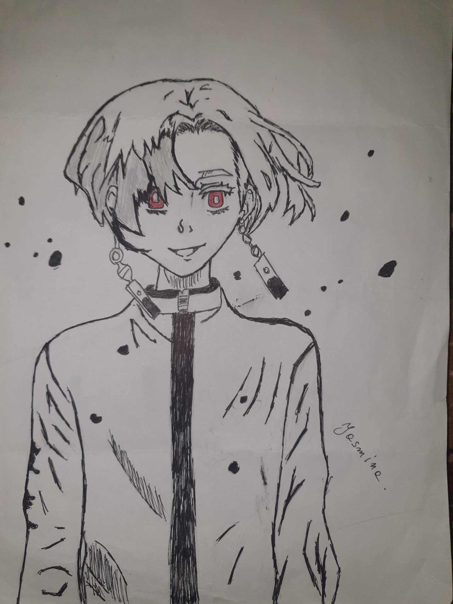 Na rysunku jest przedstawiona postać wysokiego chłopaka z czerwonymi oczami I długimi kolczykami użyłam czarny ,biały I czerwony ??❤.