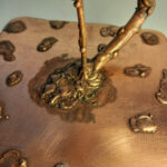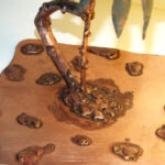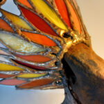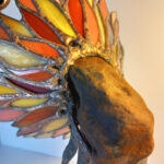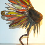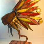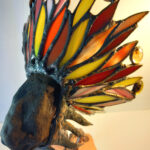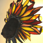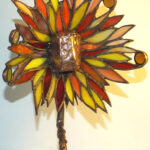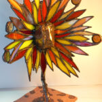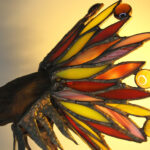 Kompozycja przestrzenna w technikach mieszanych (cięcie, szlifowanie, lutowanie, gięcie, patynowanie) wykonana ze szkła witrażowego, metali i kamienia pozyskanego z natury. “Magic Lion” to autorski projekt z Pracowni Cahaya w sercu Gór Świętokrzyskich (certyfikat autentyczności pracy).