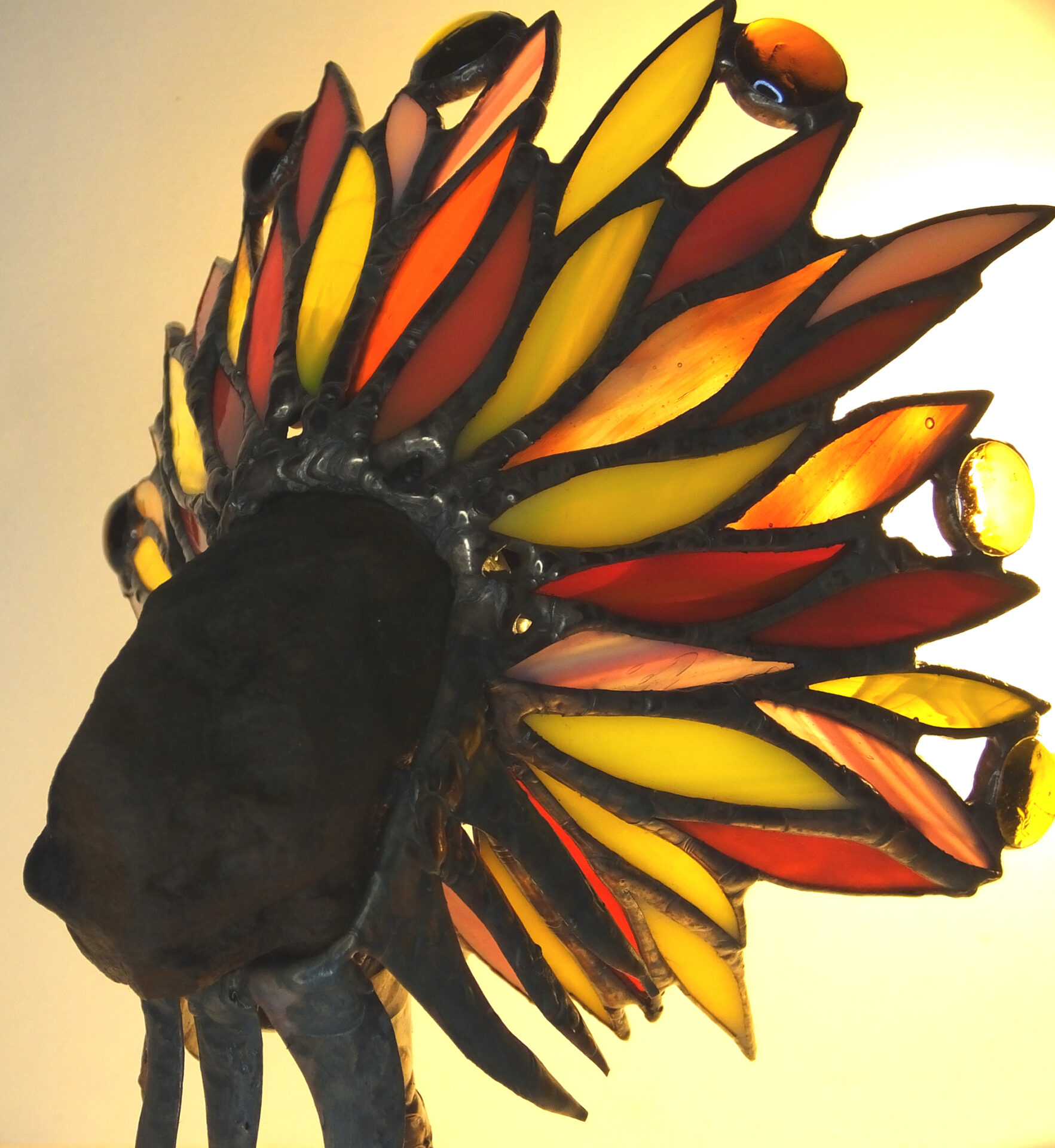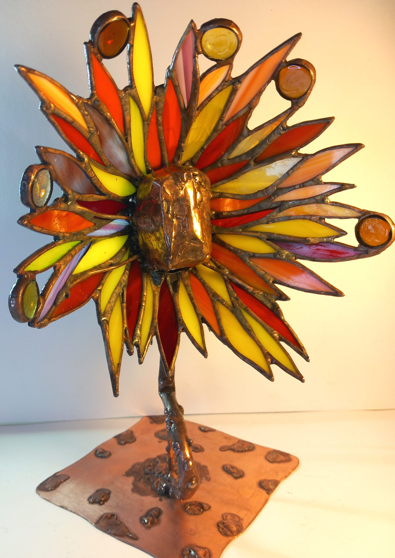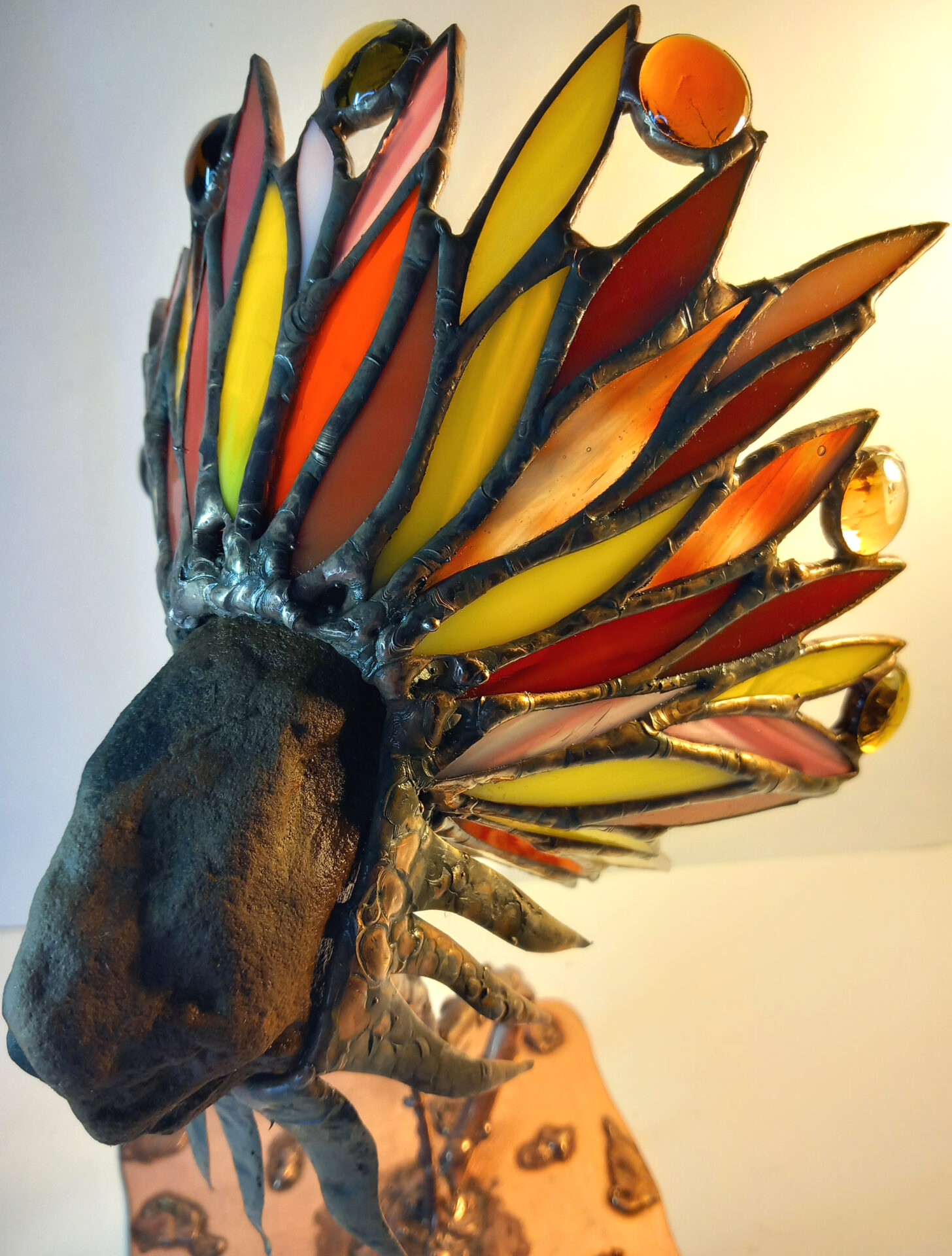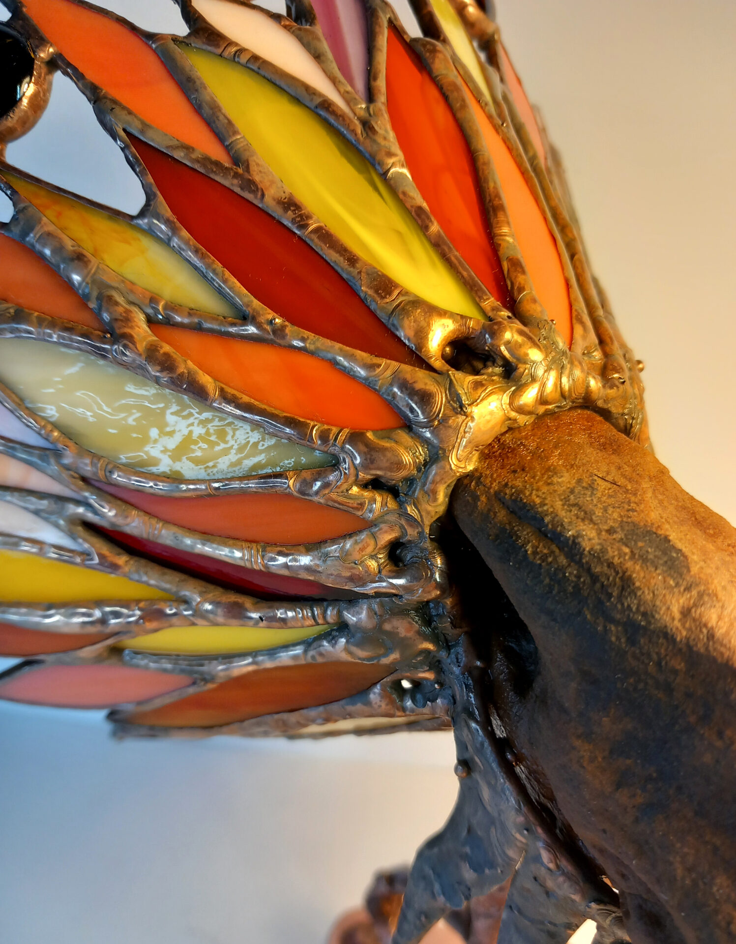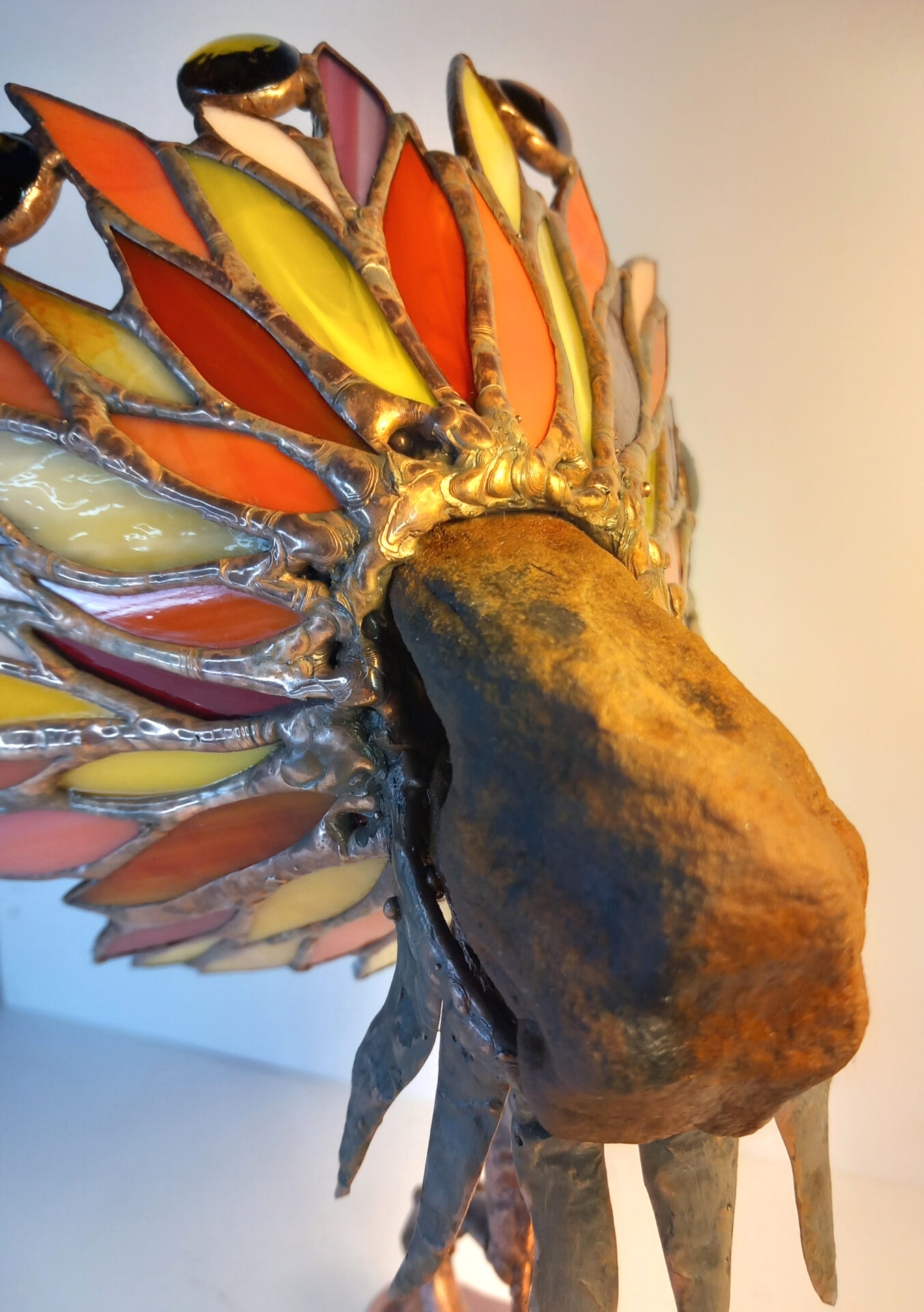 Kompozycja przestrzenna w technikach mieszanych (cięcie, szlifowanie, lutowanie, gięcie, patynowanie) wykonana ze szkła witrażowego, metali i kamienia pozyskanego z natury. “Magic Lion” to autorski projekt z Pracowni Cahaya w sercu Gór Świętokrzyskich (certyfikat autentyczności pracy).