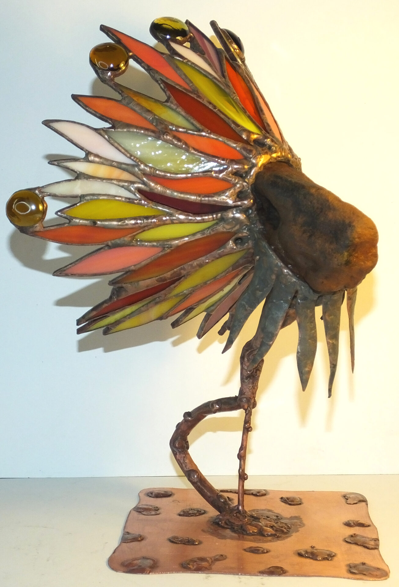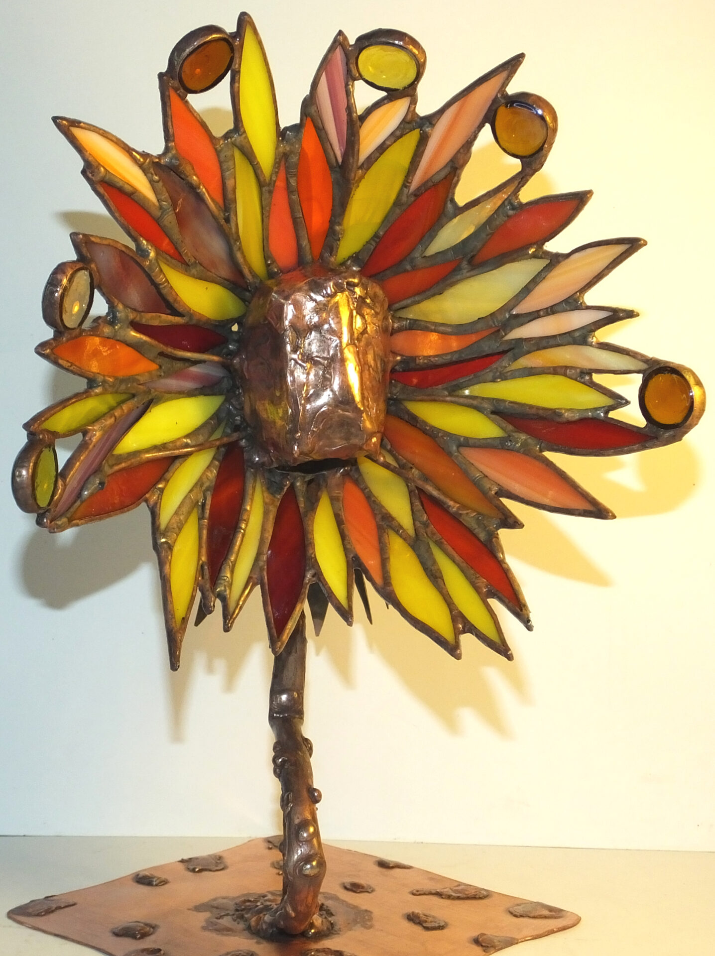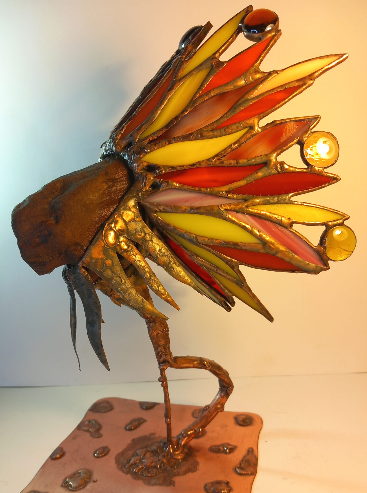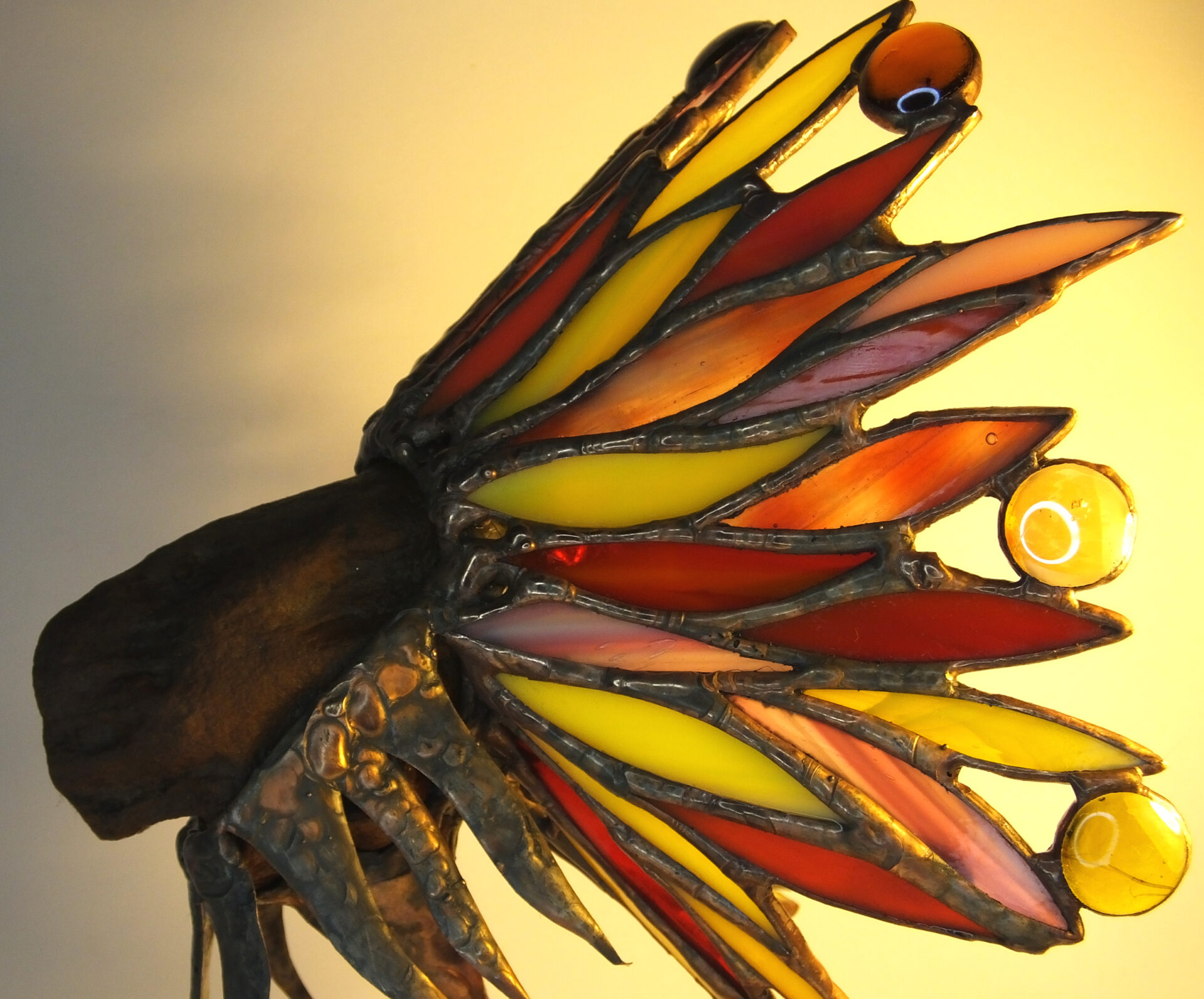 Kompozycja przestrzenna w technikach mieszanych (cięcie, szlifowanie, lutowanie, gięcie, patynowanie) wykonana ze szkła witrażowego, metali i kamienia pozyskanego z natury. “Magic Lion” to autorski projekt z Pracowni Cahaya w sercu Gór Świętokrzyskich (certyfikat autentyczności pracy).