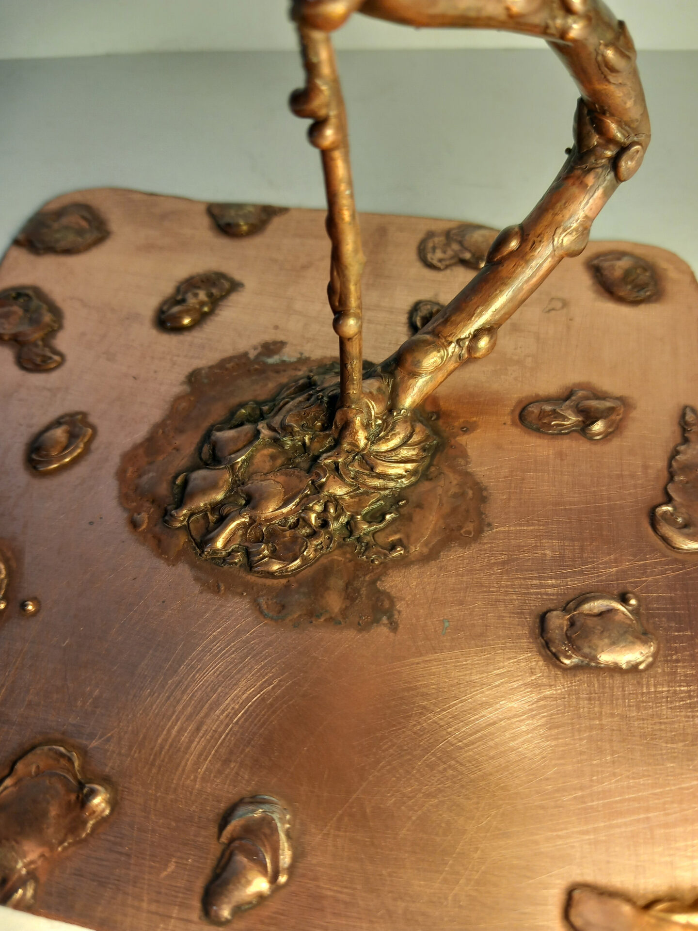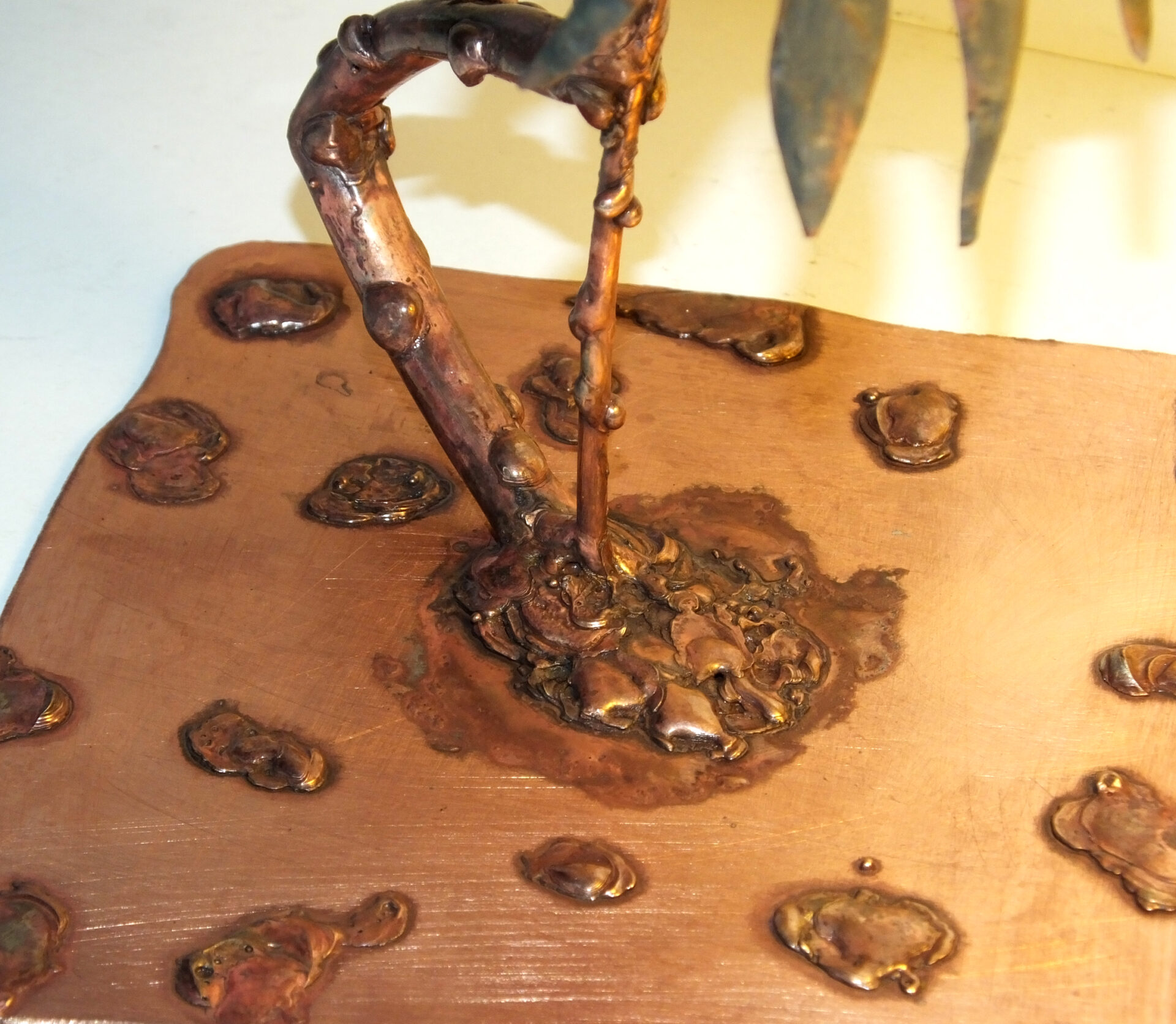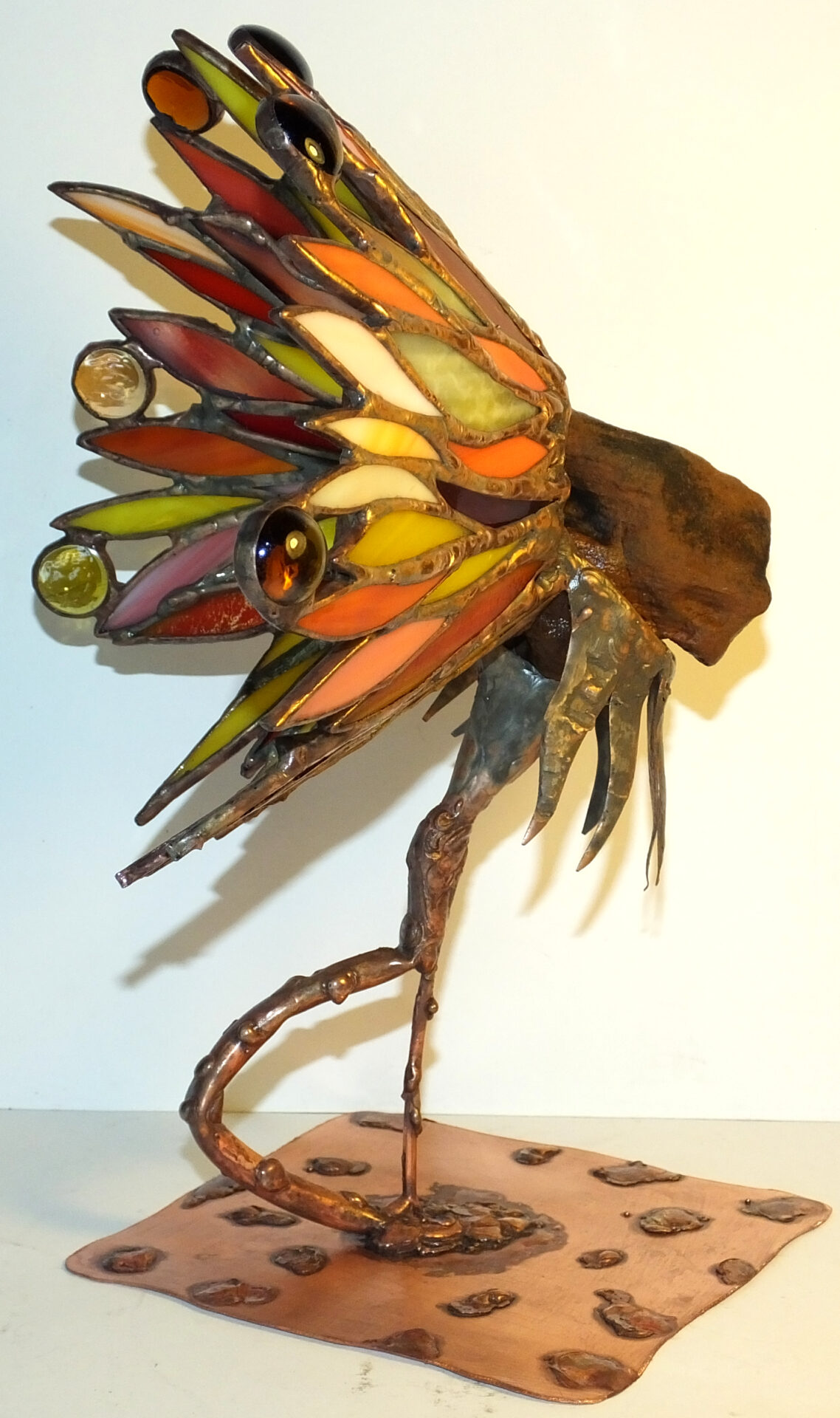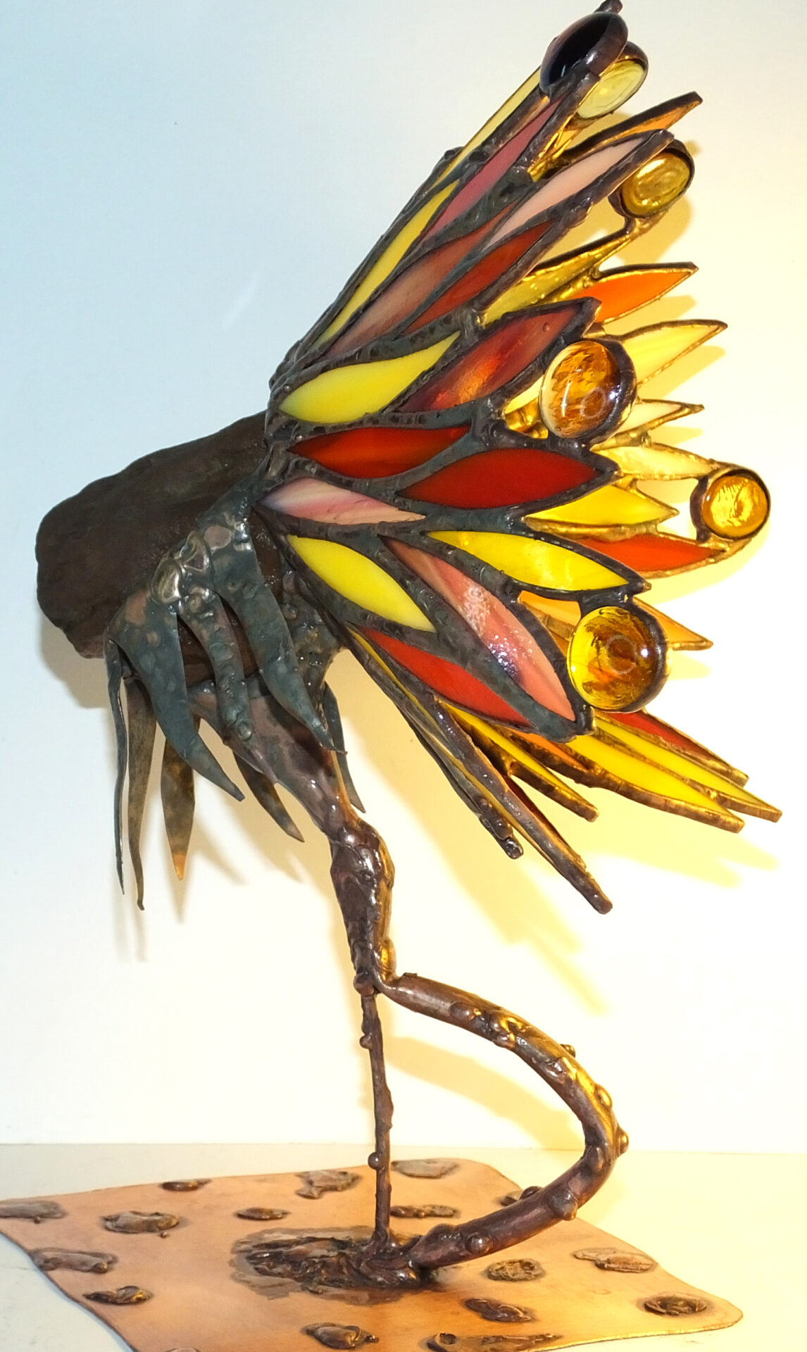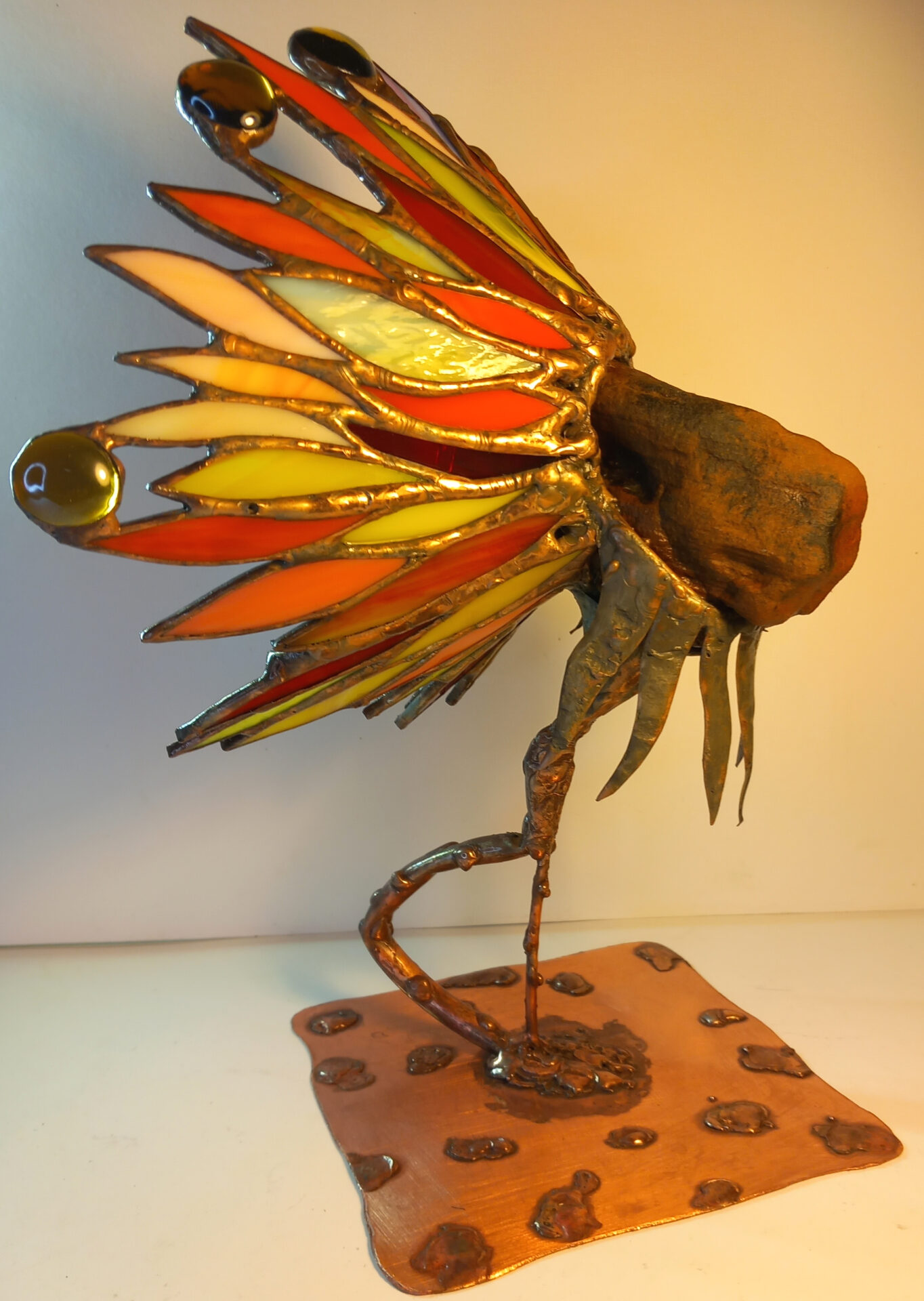 Kompozycja przestrzenna w technikach mieszanych (cięcie, szlifowanie, lutowanie, gięcie, patynowanie) wykonana ze szkła witrażowego, metali i kamienia pozyskanego z natury. “Magic Lion” to autorski projekt z Pracowni Cahaya w sercu Gór Świętokrzyskich (certyfikat autentyczności pracy).