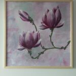 Różowe kwiaty magnolii na gałęziach. Obraz w ramie. Akryl na desce. Malarstwo akrylami na płótnie/desce jest dość młodą ale najbardziej dziś popularną techniką malarską. Prace w technice akrylowej cechuje wysoka trwałość, a farby akrylowe pozwalają artyście na dużą swobodę w kreowaniu obrazu.