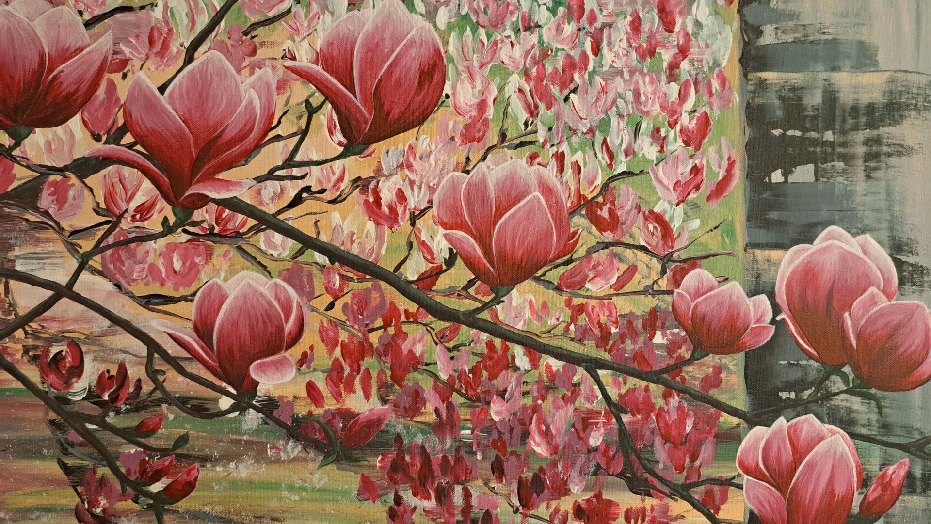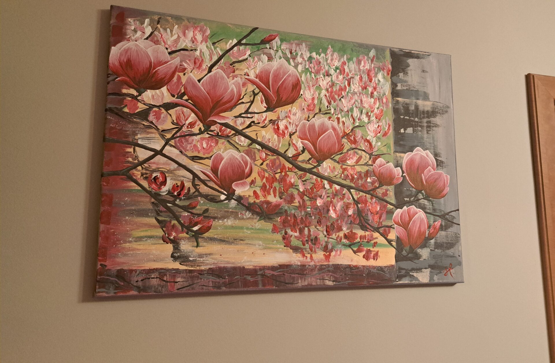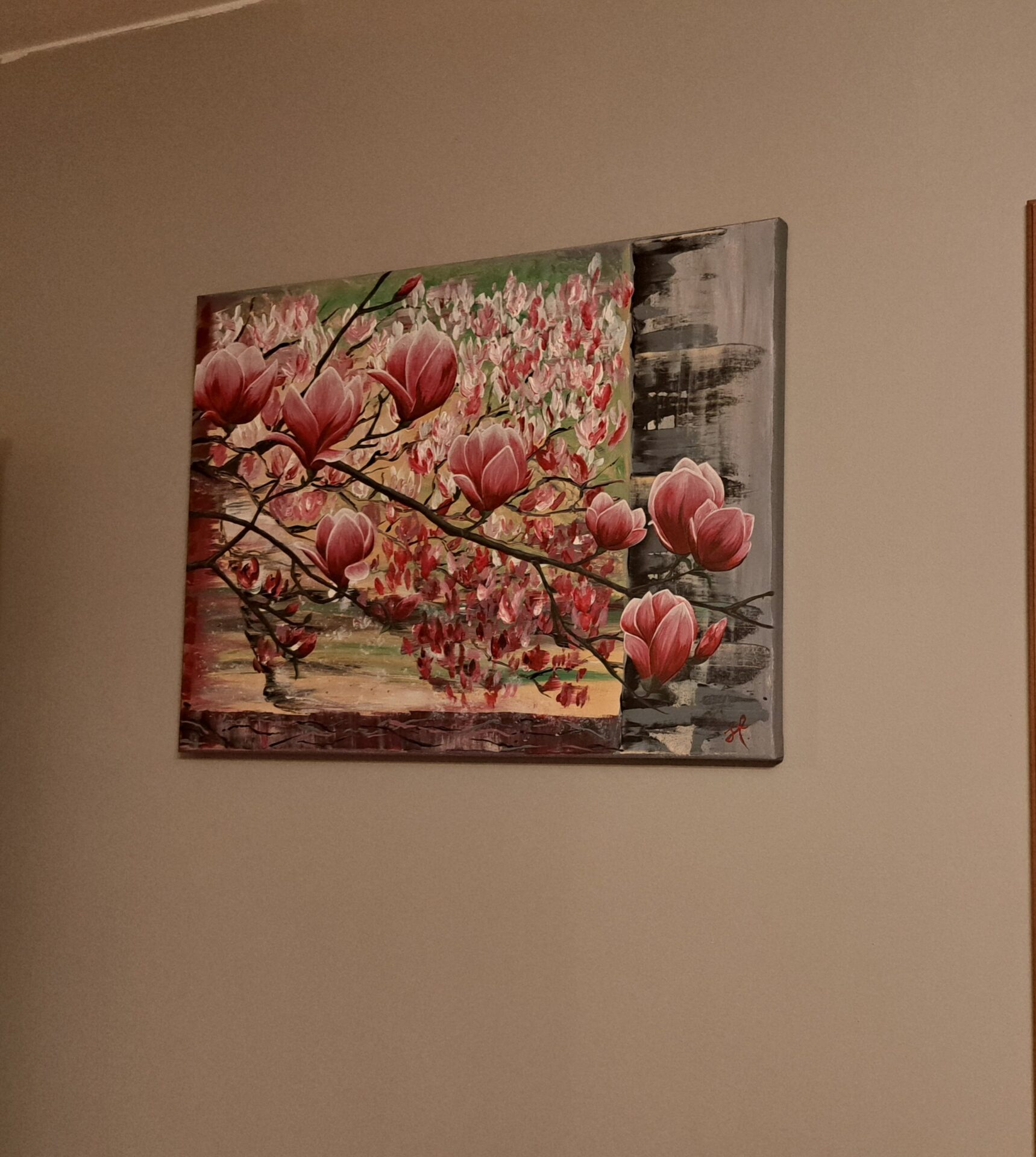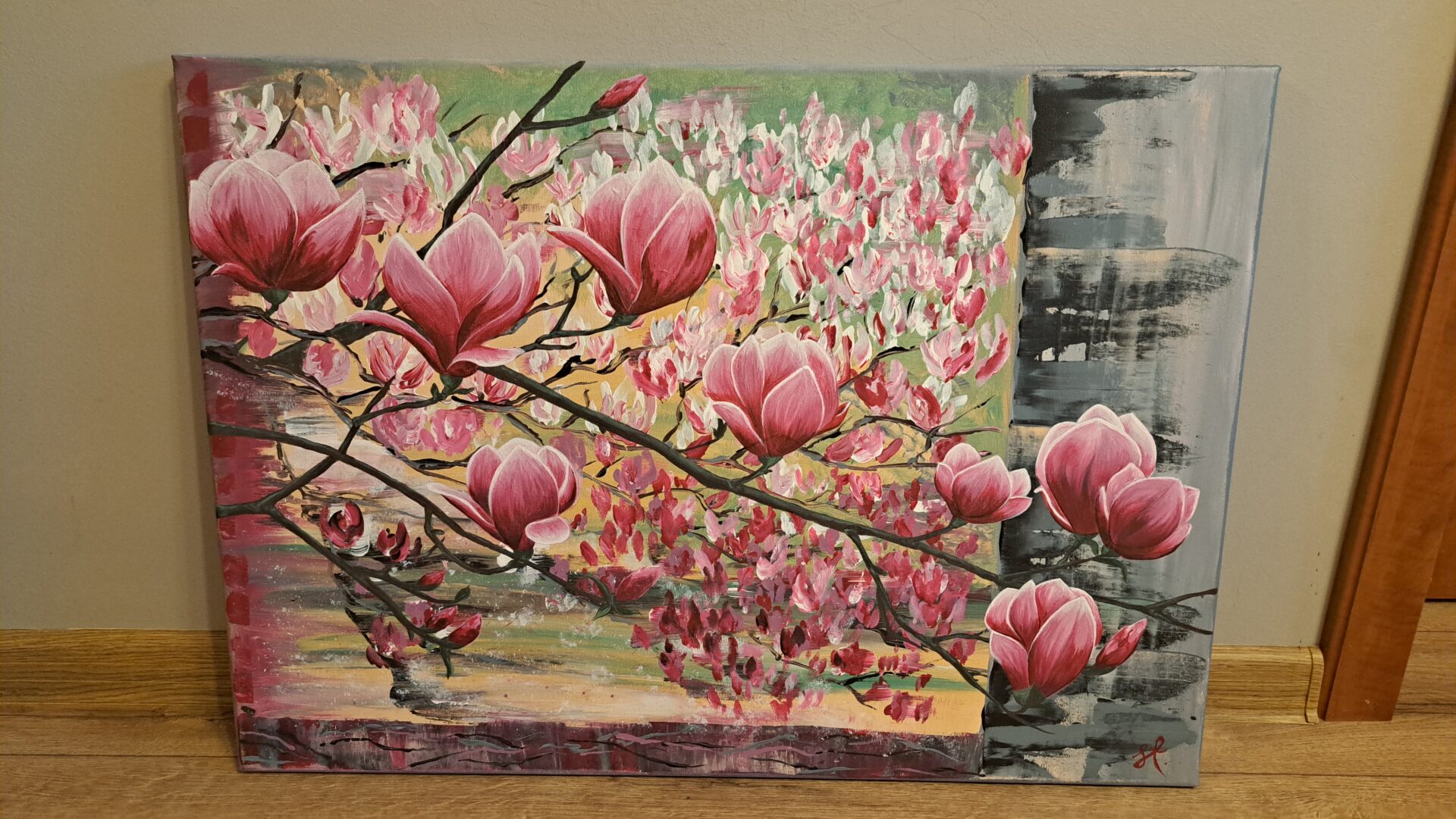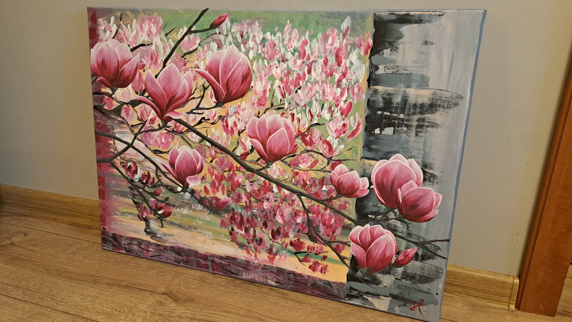 Witam ,mam na sprzedaż obraz na płótnie malowany akrylami. Rozmiar 50/70 boki zamalowane, można powiesić bez ramy. Inspiracją była przepiękna ” królowa kwiatów” Magnolia