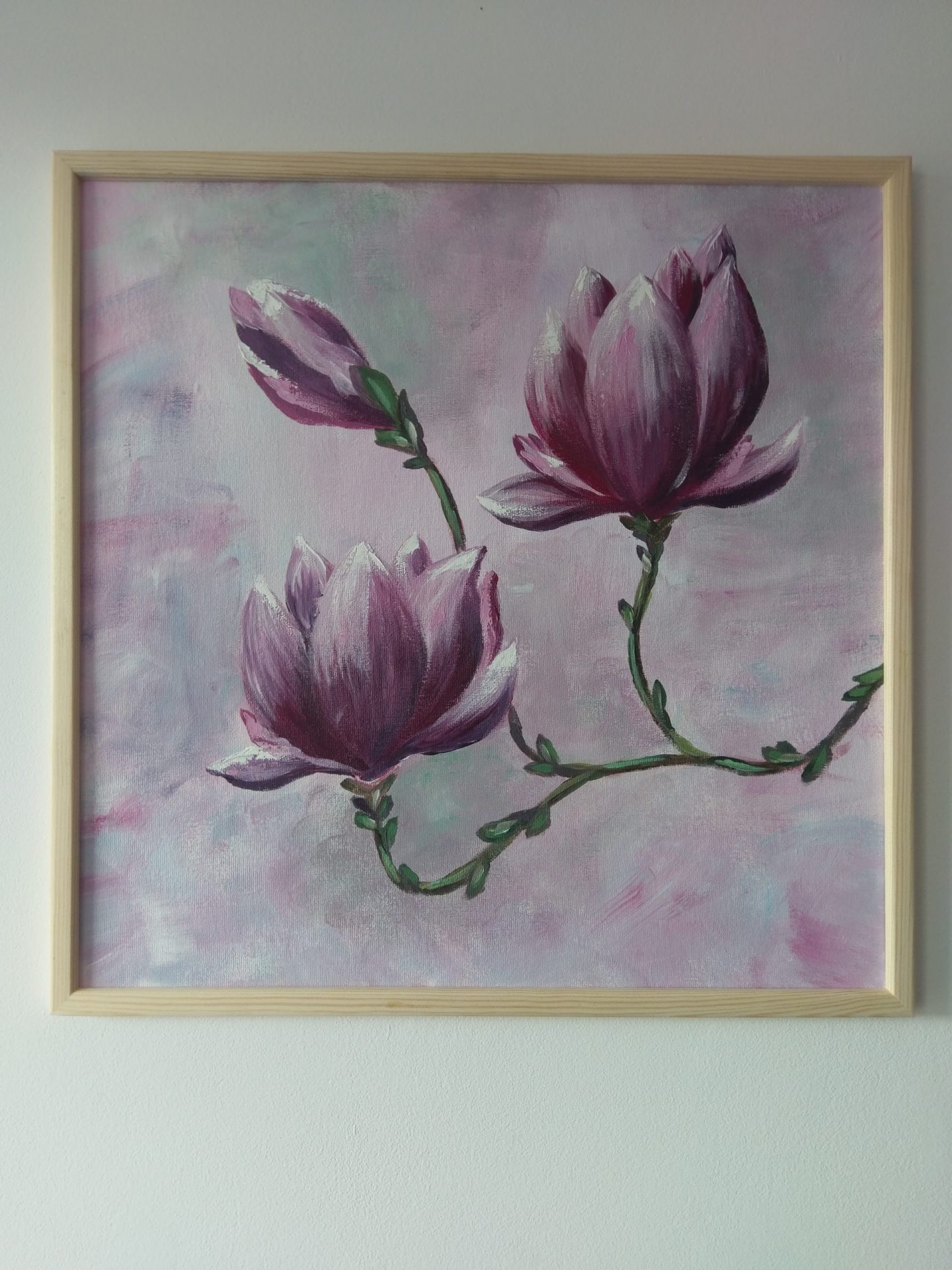 Różowe kwiaty magnolii na gałęziach. Obraz w ramie. Akryl na desce. Malarstwo akrylami na płótnie/desce jest dość młodą ale najbardziej dziś popularną techniką malarską. Prace w technice akrylowej cechuje wysoka trwałość, a farby akrylowe pozwalają artyście na dużą swobodę w kreowaniu obrazu.