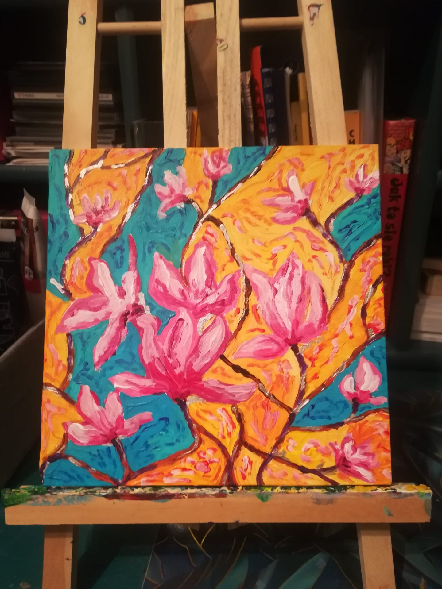 ręcznie malowany mały obrazek, tektura obita oklejona płótnem , farby akrylowe