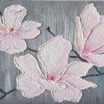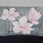 Obraz malowany akrylami, wymiary 30x20cm, wykonany na płycie zagruntowanej. Magnolie wykonane masą szpachlową, pomalowane akrylem. Obraz zabezpieczony werniksem.