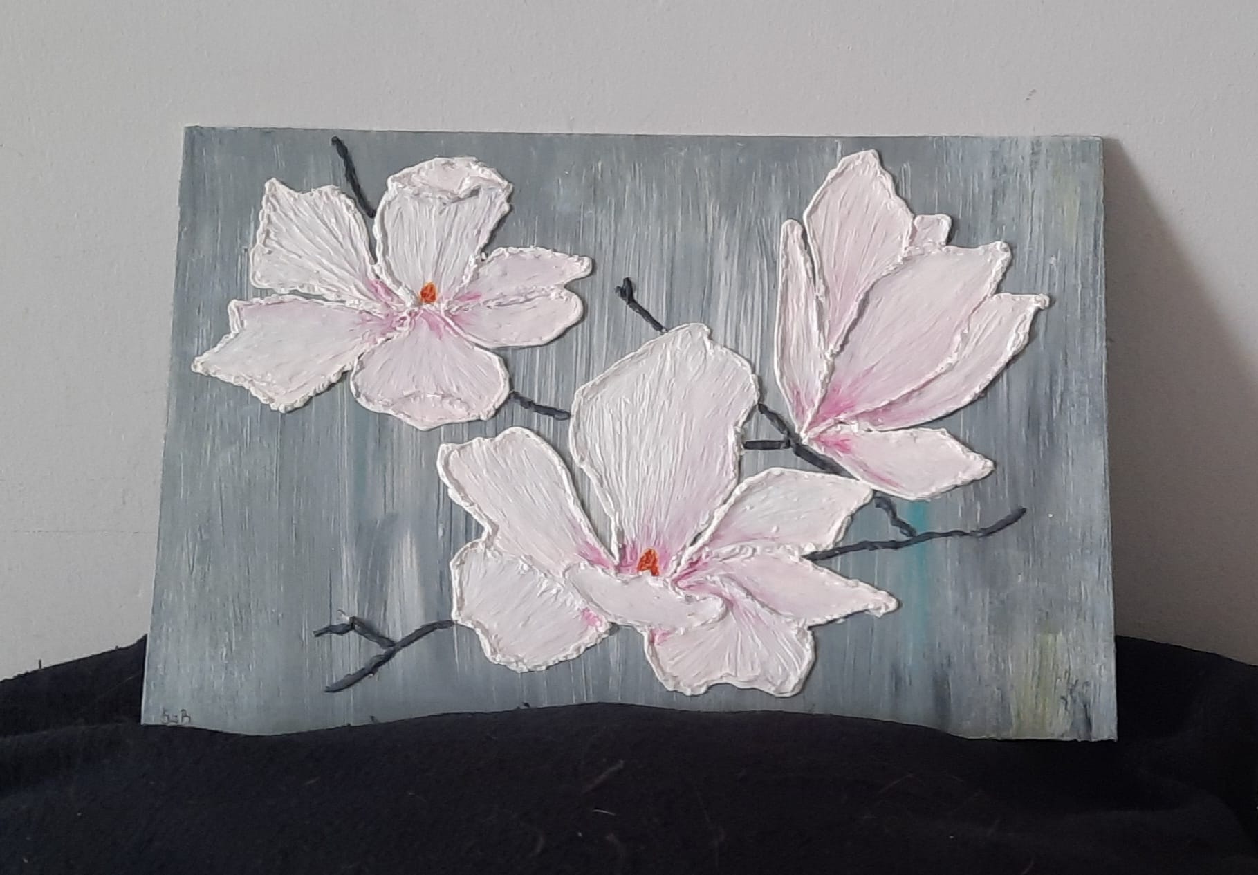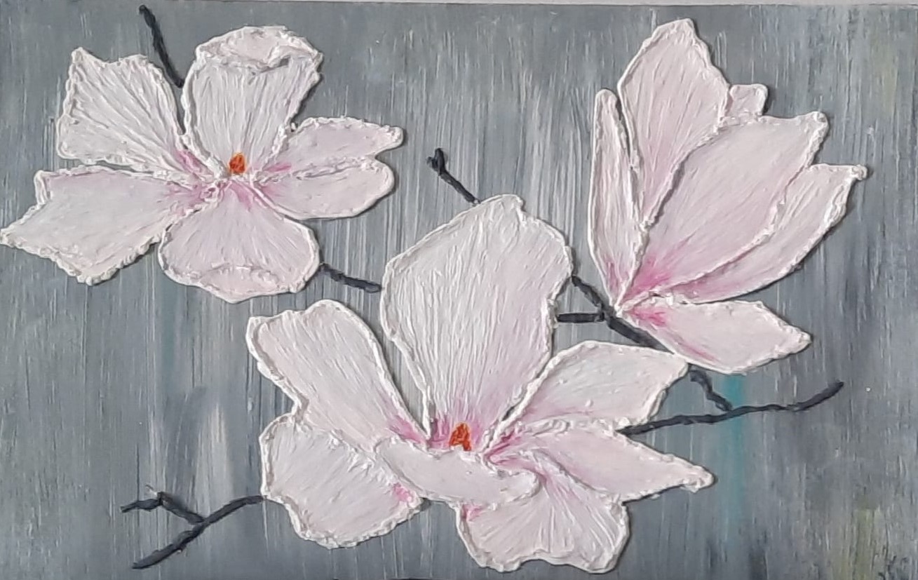 Obraz malowany akrylami, wymiary 30x20cm, wykonany na płycie zagruntowanej. Magnolie wykonane masą szpachlową, pomalowane akrylem. Obraz zabezpieczony werniksem.