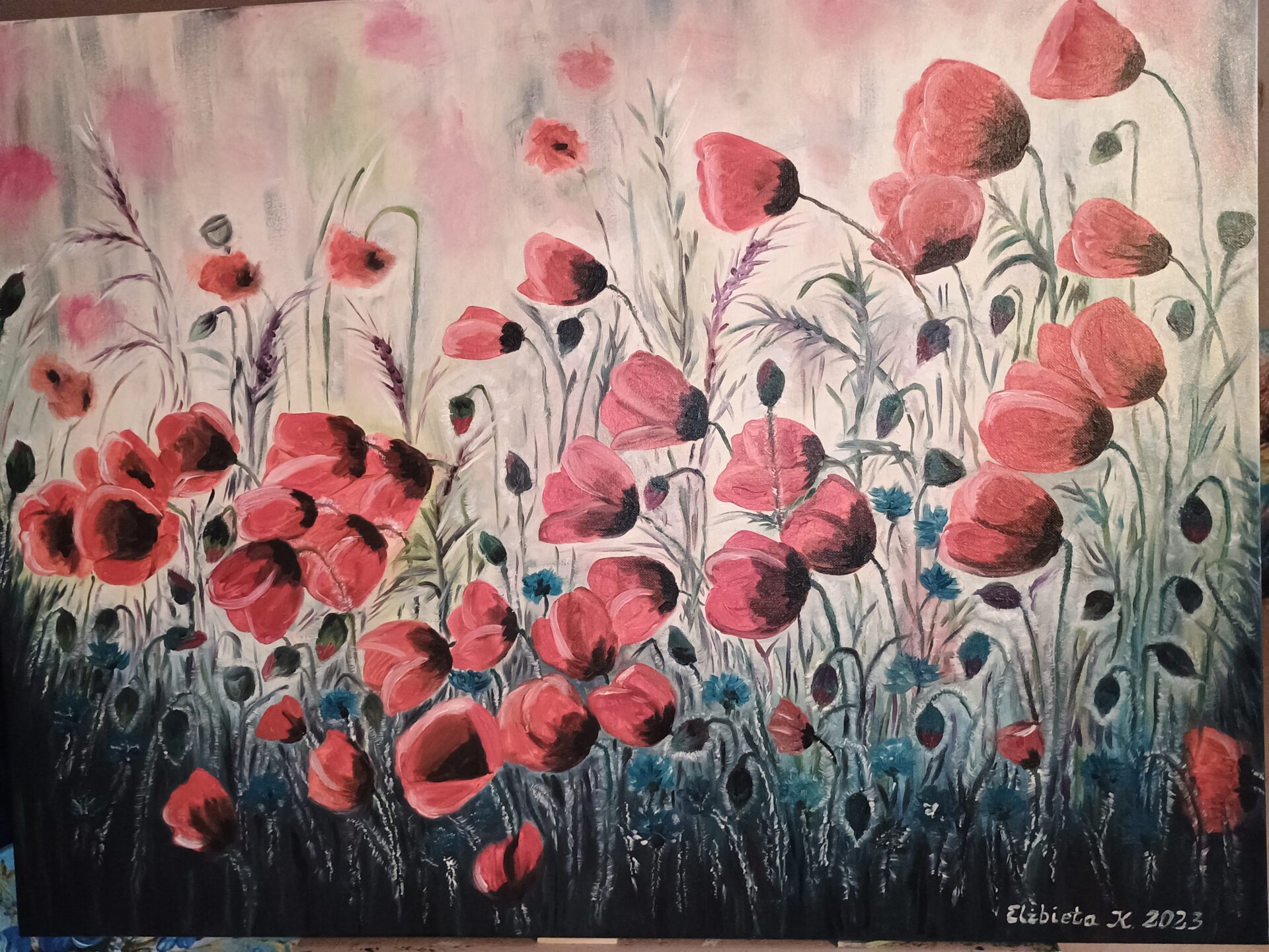 Obraz przedstawia łąkę pełną kwitnących maków. Żywe kolory ożywią każdy pokój. Obraz malowany jest farbami Van Gogh i zabezpieczony werniksem.