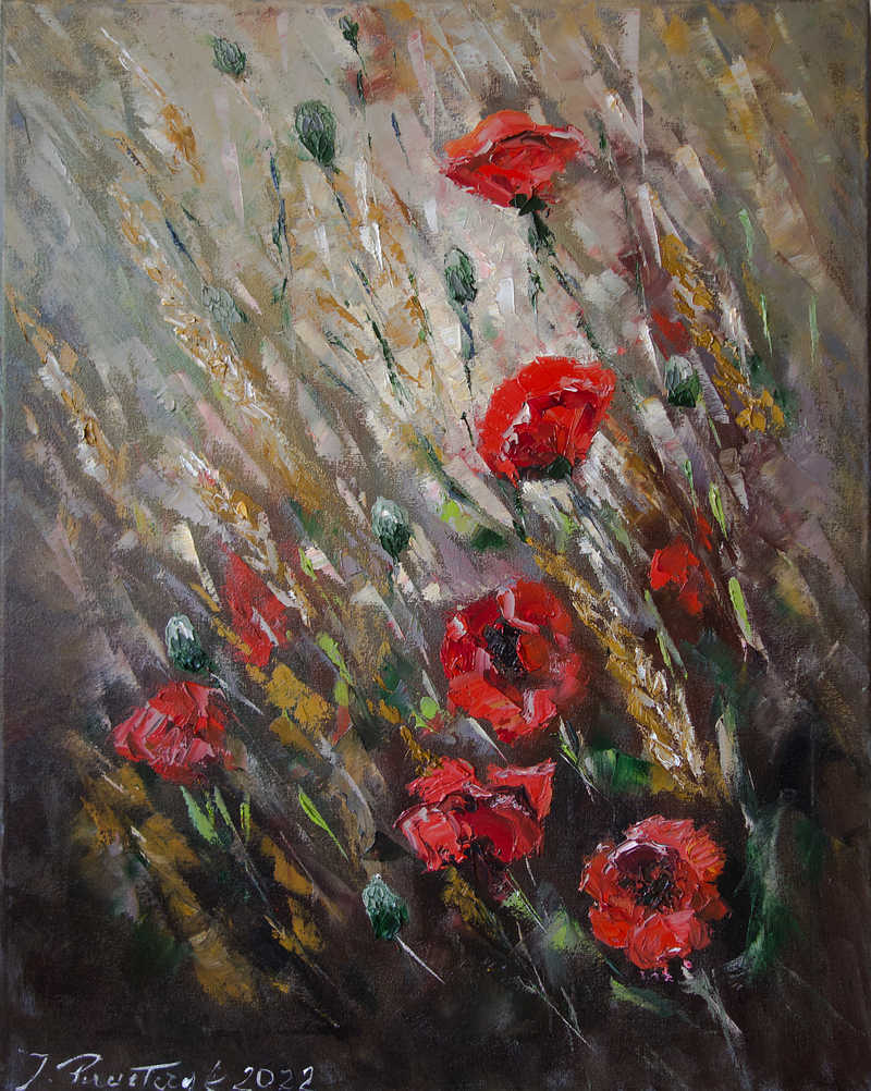 Obraz olejny na podobraziu płóciennym w technice alla prima z widoczną fakturą farby.