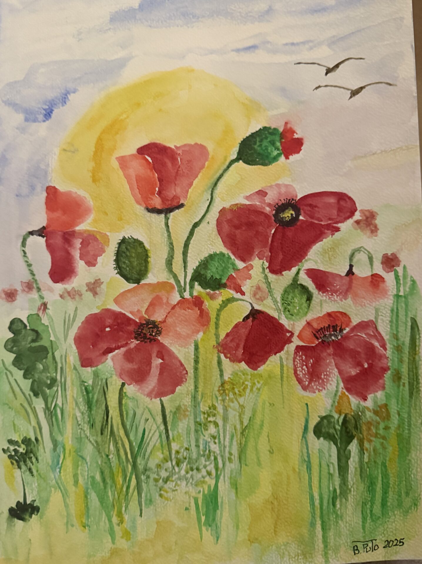 Akwarela Maki w słońcu została namalowana na papierze 300 g , na formacie A4.