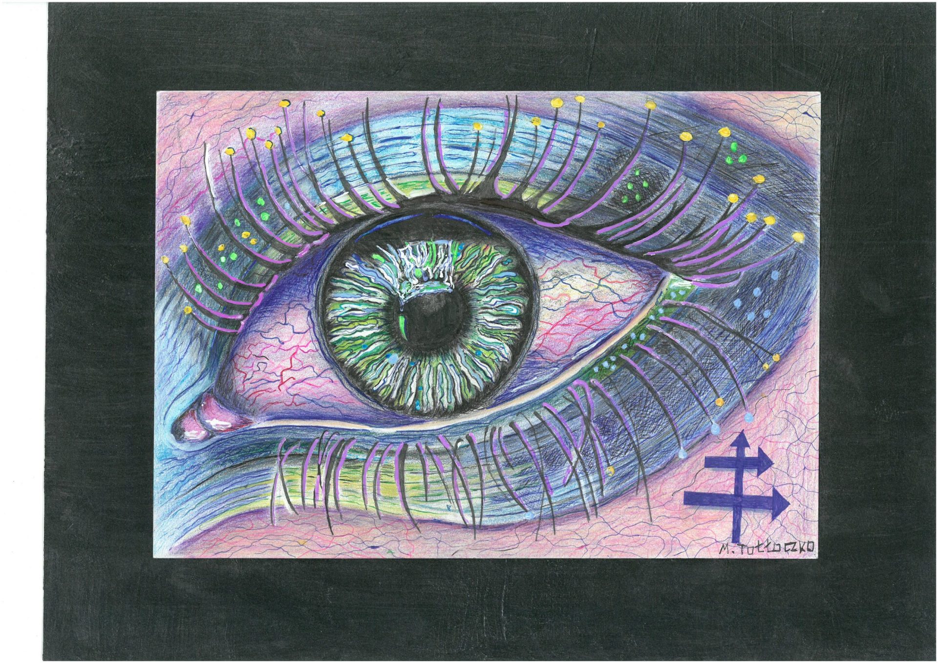 Rysunek jest wykonany kredkami artystycznymi cienkopisami i długopisami żelowymi