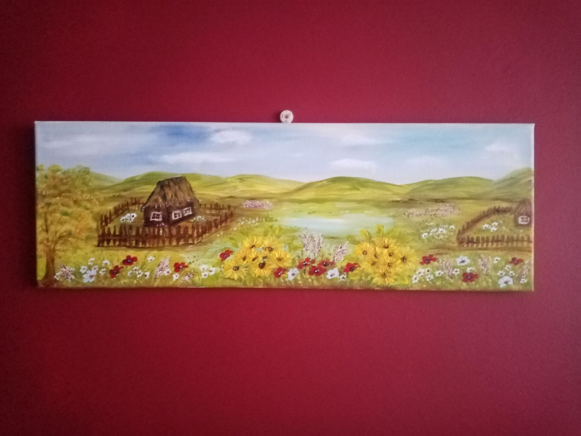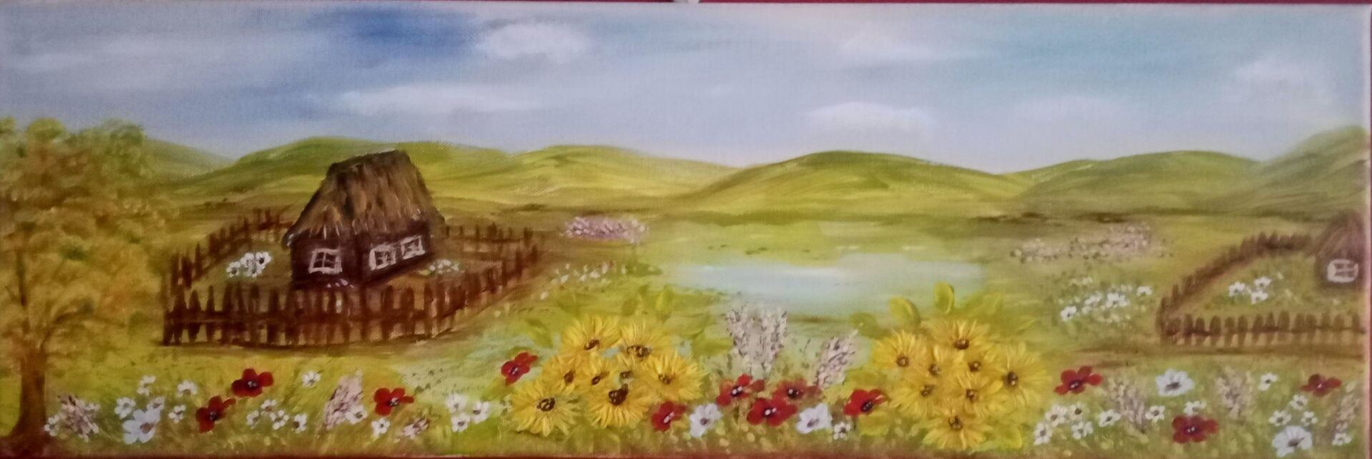 Obraz malowany na bawełnianym podobraziu . Użyte zostały wysokiej jakości farby akrylowe.Wymiary 20 x 60.Do pracy dołączam certyfikat. Obraz jest sygnowany i zawerniksowany. Boki zamalowane w tonacji obrazu.