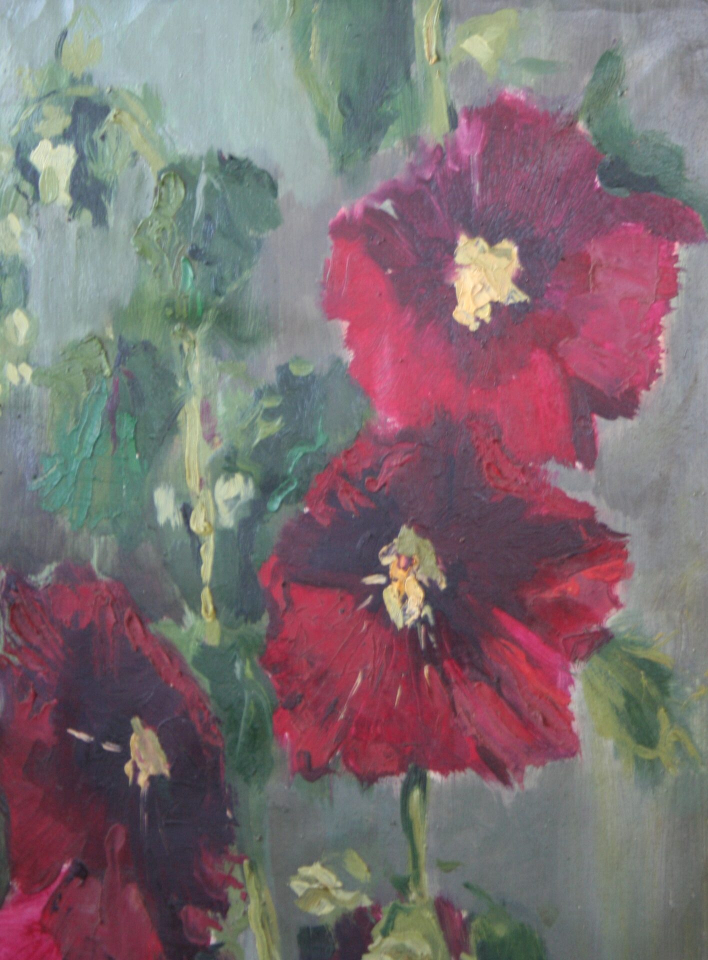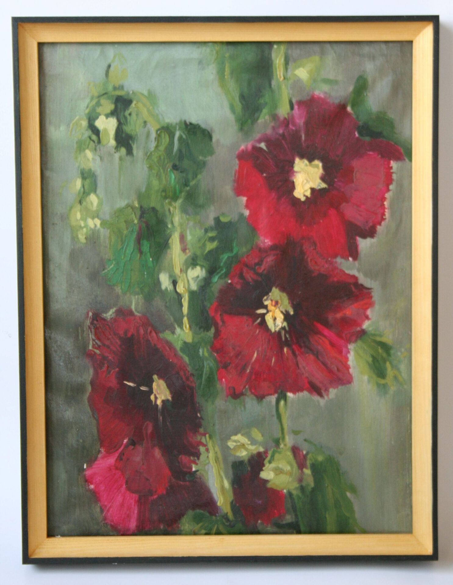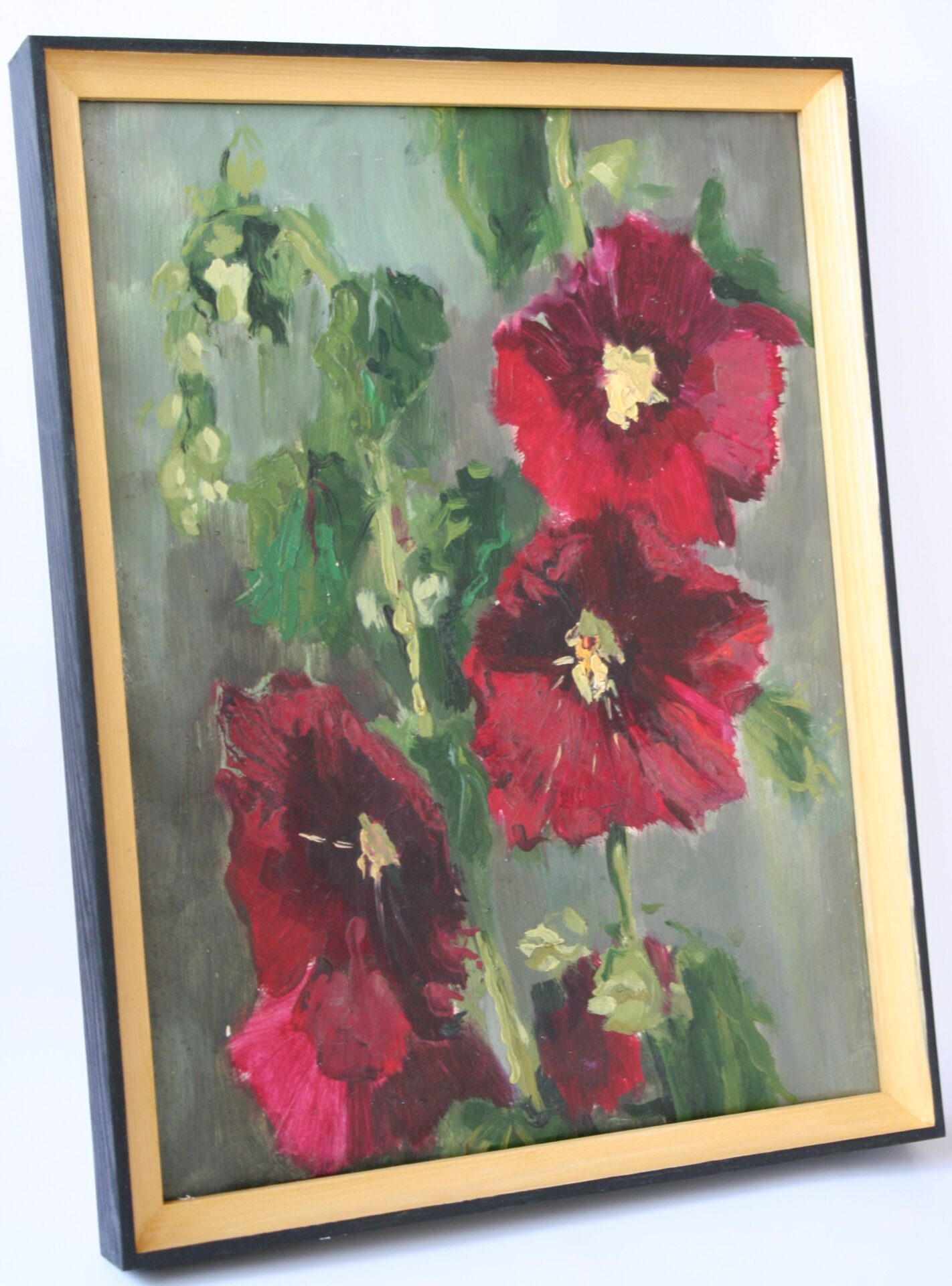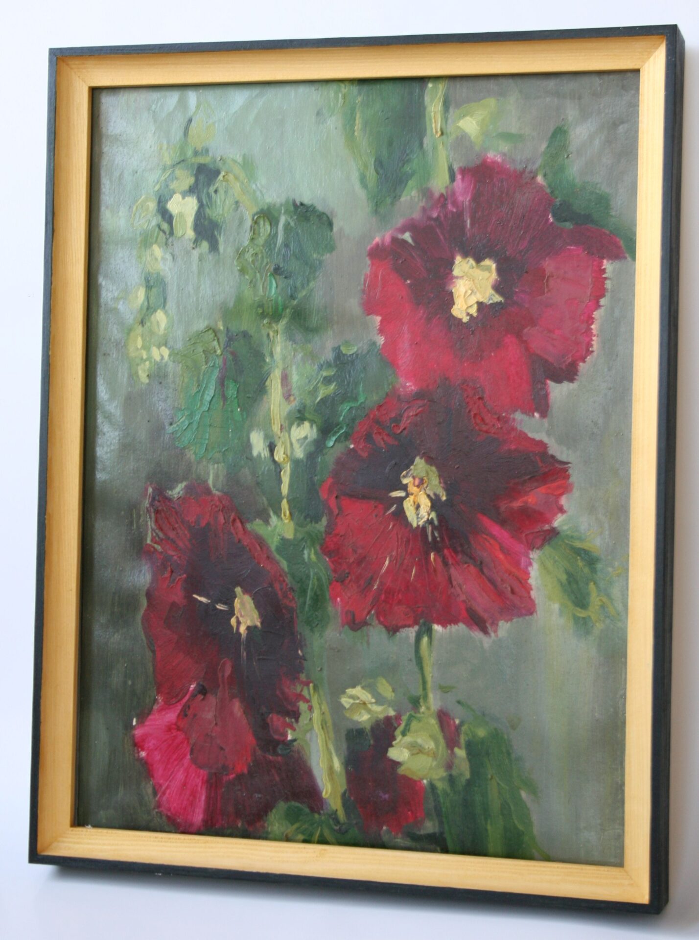 Obraz olejny na płótnie przedstawiający kwiaty. Obraz jest oprawiony w drewnianą ramę w kolorze starego złota i czerni. Rozmiar płótna 30cm x 40 cm, z ramą 34cm x 44cm.