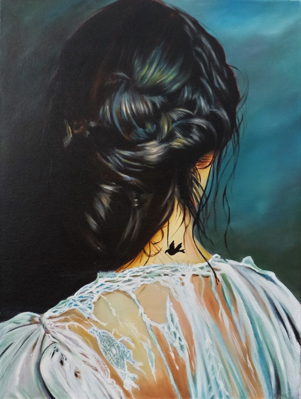Obraz figuratywny. Praca nie wymaga ramy. Obraz jest zabezpieczony werniksem błyszczącym oraz sygnowany z tyłu monogramem artysty. Obraz jest częścią cyklu „poszukiwanie”.