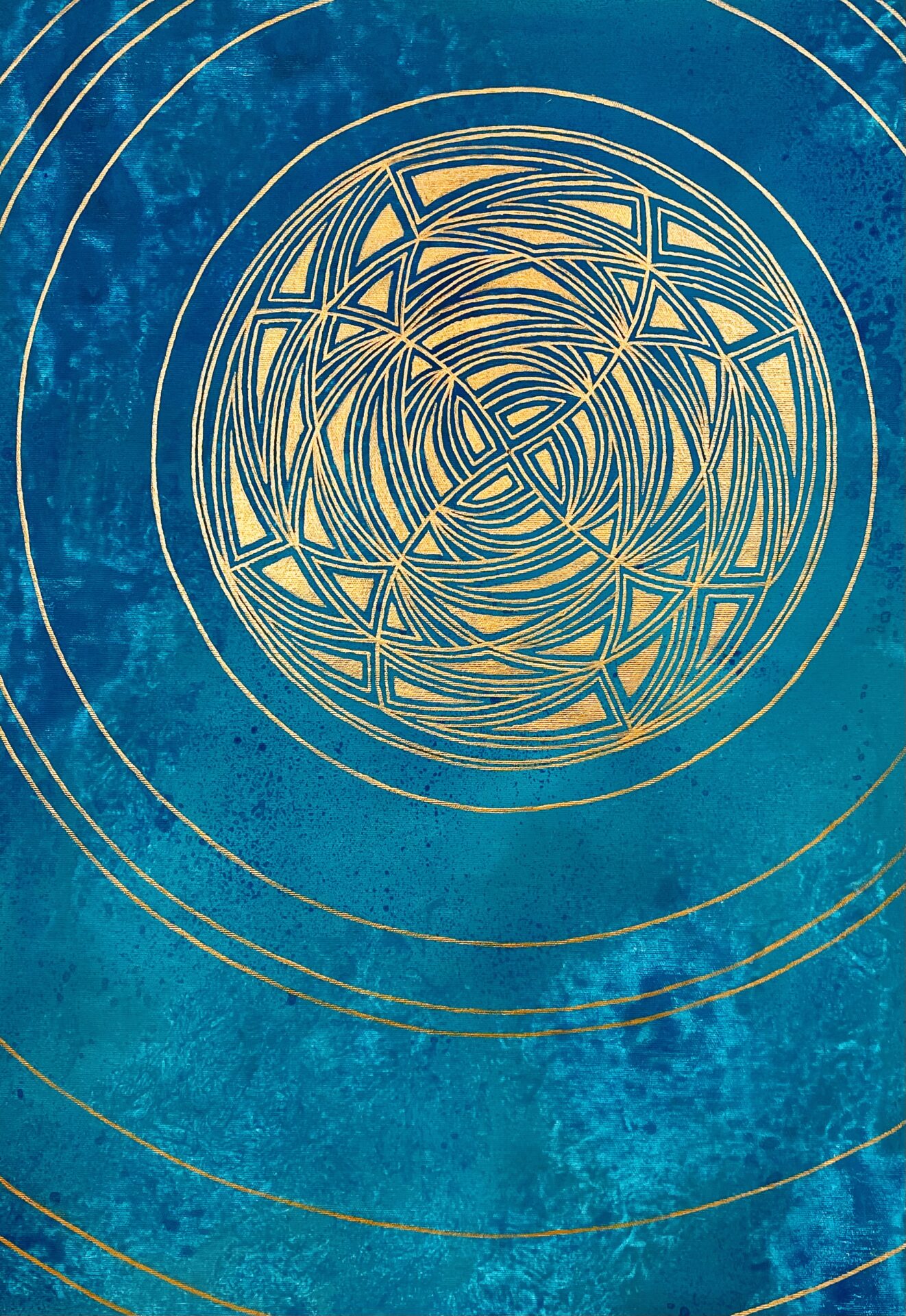 Mandala malowana farbami akrylowymi na płótnie , w kolorach turkusu i złota .