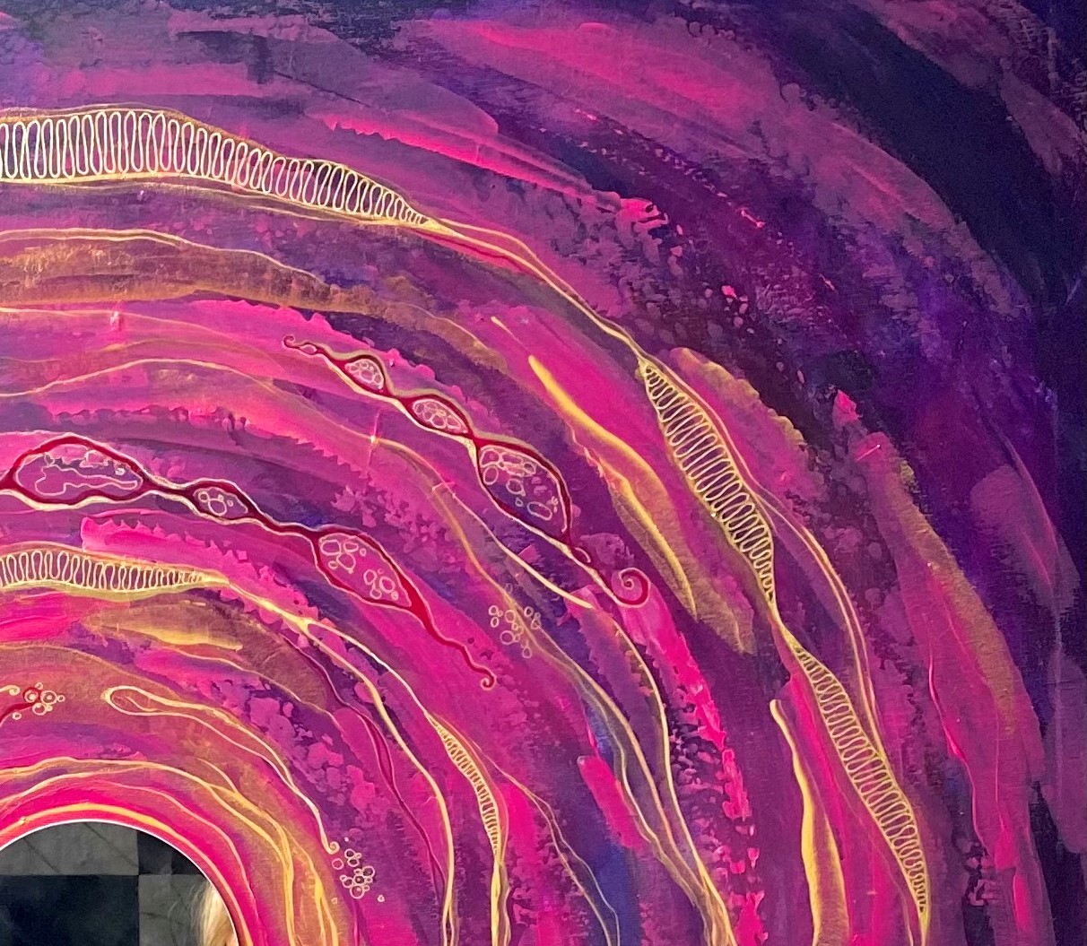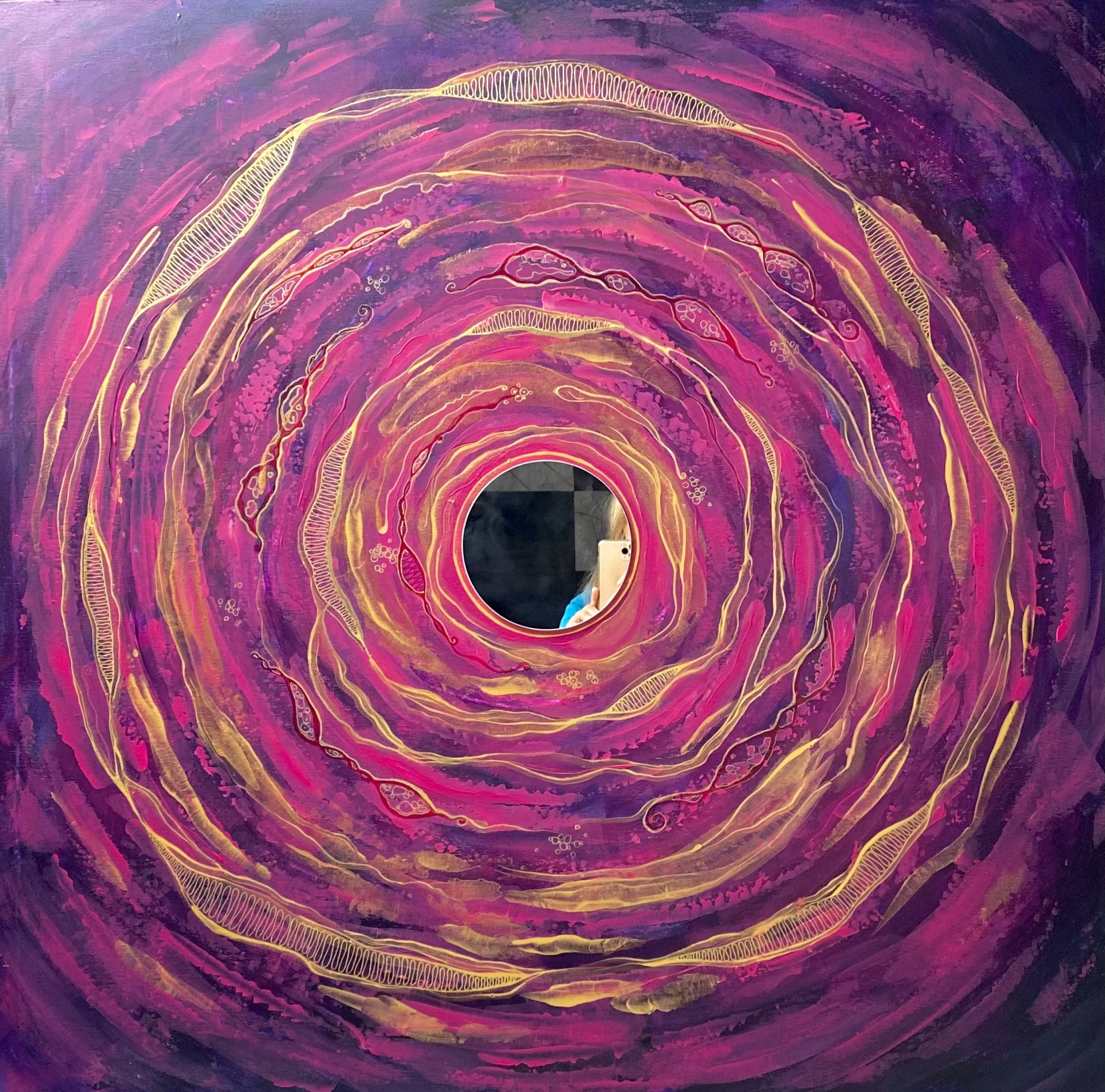 Mandala z lusterkiem w centrum, na fioletowo-złotym tle. Wymiary obrazu 100x100x4 cm. Boki zamalowane, nie wymaga dodatkowej oprawy.
