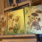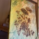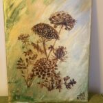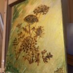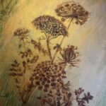 Obraz Marchew polna z Tryptyku polnego. Namalowany na złotym tle z refleksami ciemnej zieleni. Roślina namalowana w brązie. Obraz namalowany na lnianym płótnie naciągniętym na drewniany blejtram o wymiarach 40×30 cm. Użyto profesjonalnych farb akrylowych. Zabezpieczono werniksem satynowym. Obraz ma zamalowane boki w odcieniach obrazu i w zależności od położenia, oświetlenia zmienia barwy.