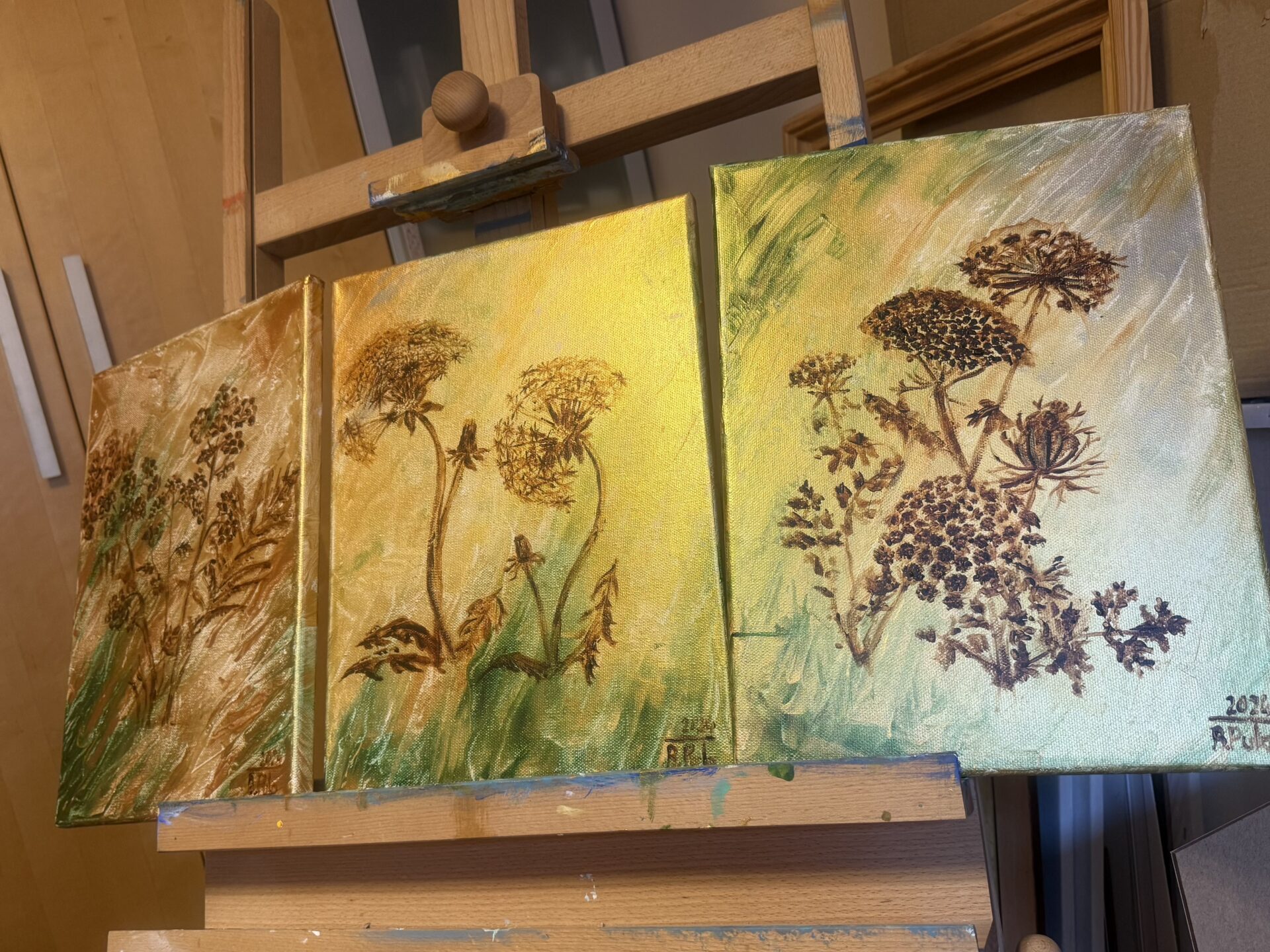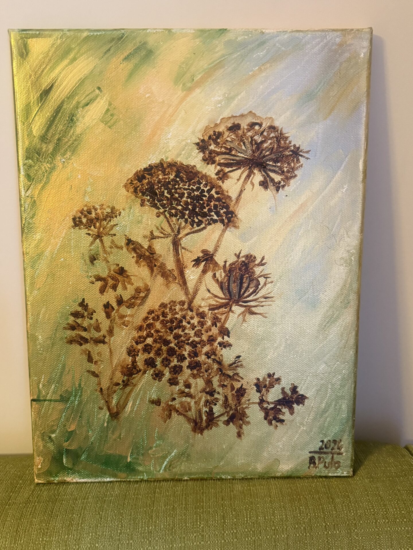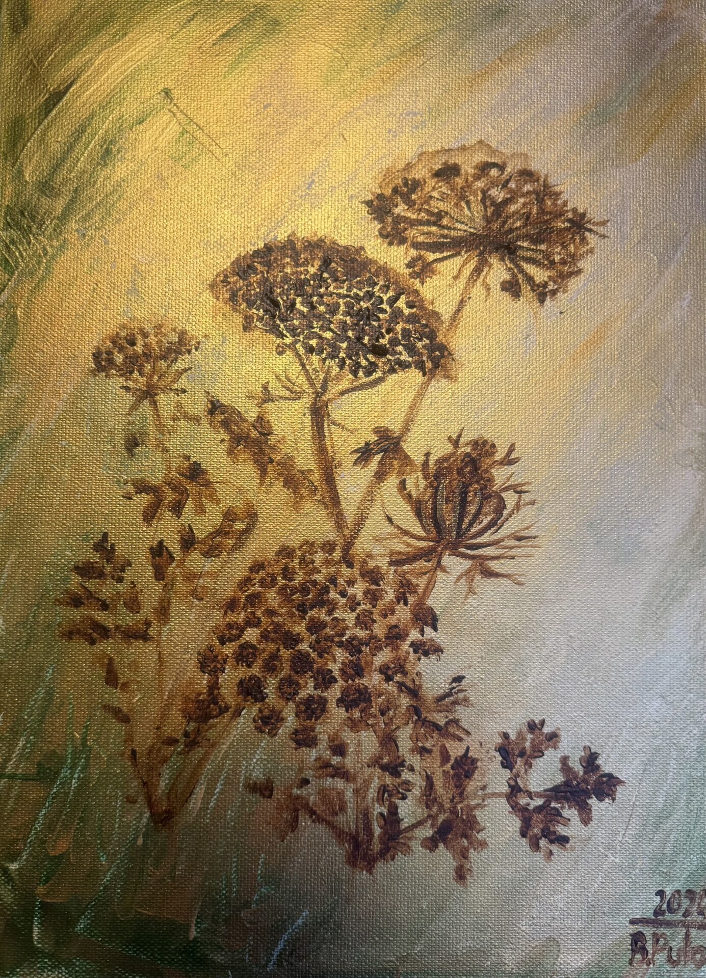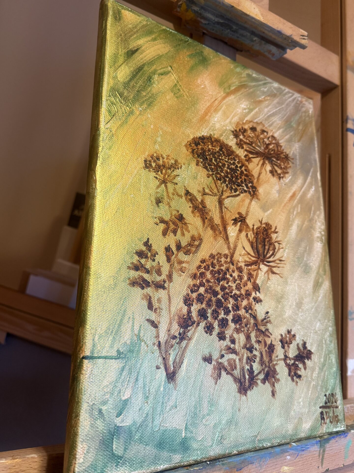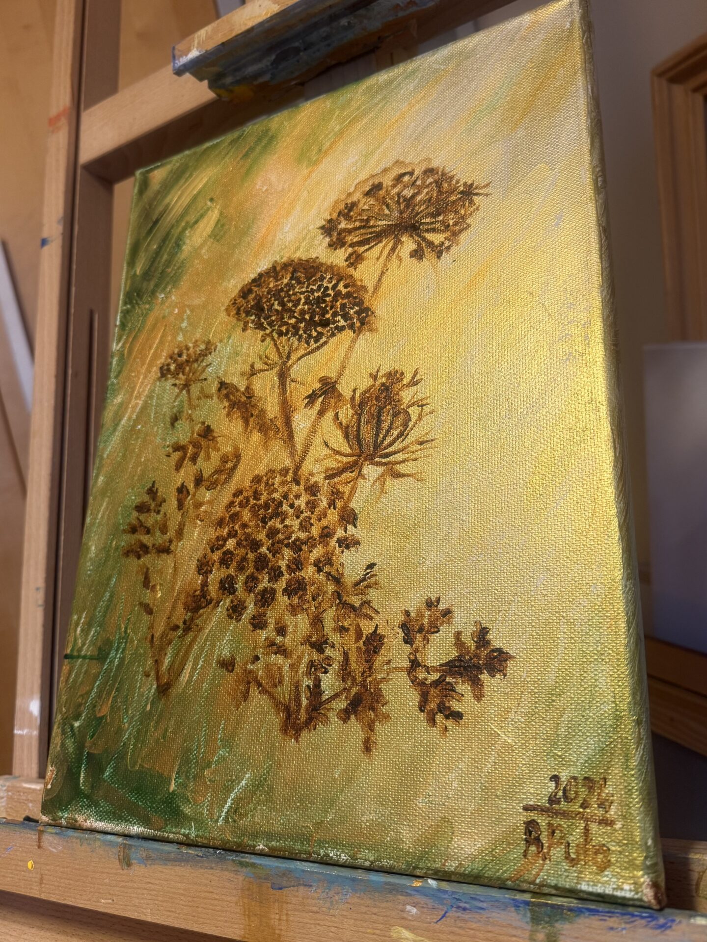 Obraz Marchew polna z Tryptyku polnego. Namalowany na złotym tle z refleksami ciemnej zieleni. Roślina namalowana w brązie. Obraz namalowany na lnianym płótnie naciągniętym na drewniany blejtram o wymiarach 40×30 cm. Użyto profesjonalnych farb akrylowych. Zabezpieczono werniksem satynowym. Obraz ma zamalowane boki w odcieniach obrazu i w zależności od położenia, oświetlenia zmienia barwy.