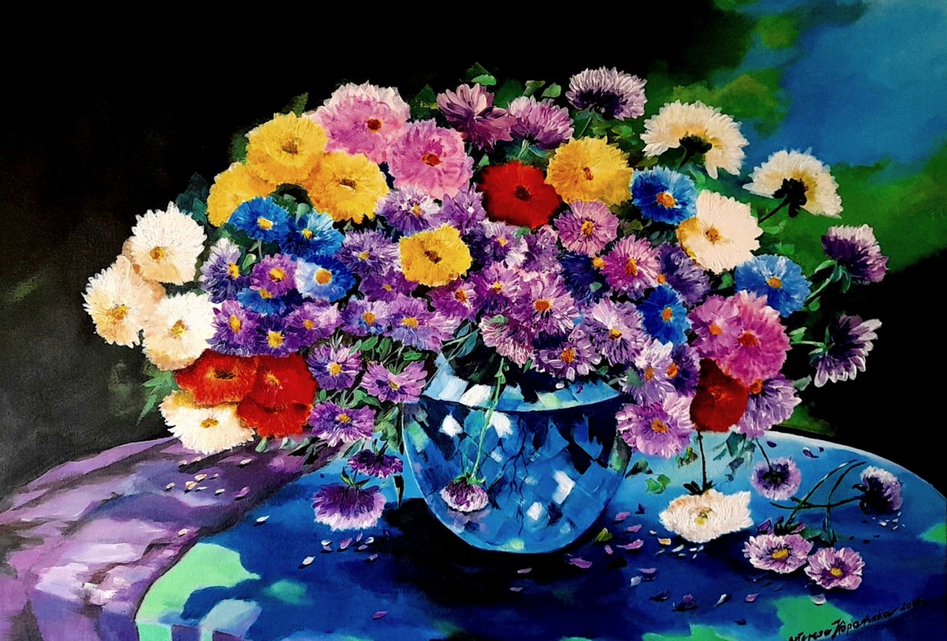 Obraz „Marcinki w kryształowym wazonie” Rok powstania 2023.Wymiary 70 x 50 cm. Obraz pokryty werniksem co zabezpiecza go przed zniszczeniem, tj. kurzem i innymi zjawiskami atmosferycznymi, Obraz jest ręcznie malowany farbami akrylowymi jako podkład do farb olejnych. Marcinki są malowane na płótnie najlepszej jakości farb. Sygnowany z przodu jak i na tylnej części płótna. Autor: Teresa Kopańska – artysta malarz. Obraz charakteryzuje się cudowną gamą kolorów co dzieło to pięknie ożywi każde pomieszczenie. Obraz nie posiada ram co nie przeszkadza zawieszeniu go na ścianie ponieważ ma zamalowane boki w kolorach całości obrazu.