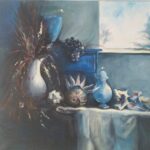 Obraz olejny, martwa natura w barwach niebieskich, malowany na płótnie, zawerniksowany o rozmiarach 50cmx50cm, malowany na podstawie znanego obrazu