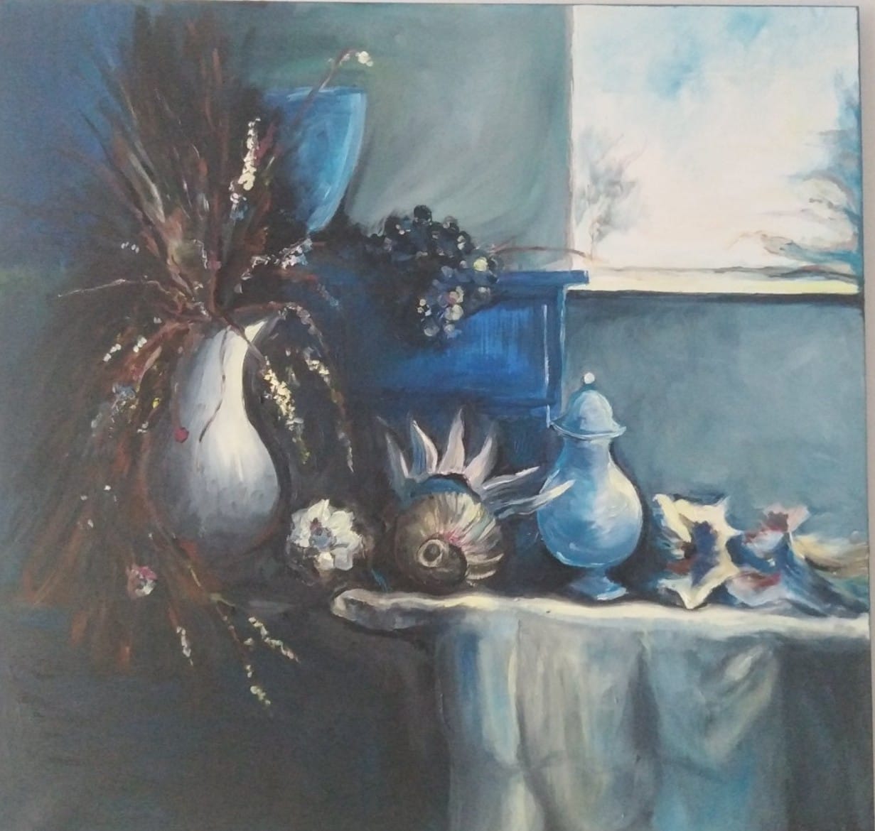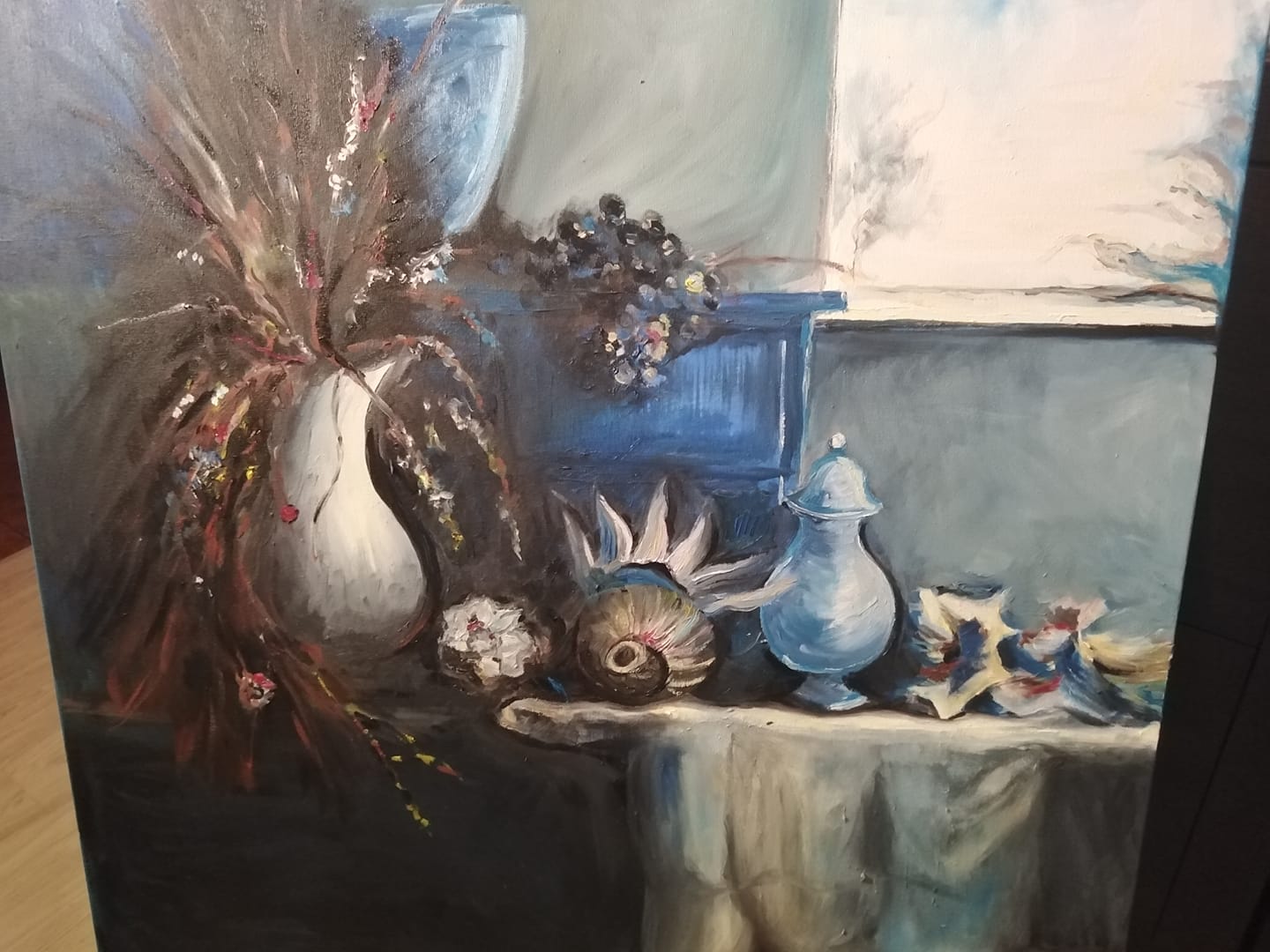 Obraz olejny, martwa natura w barwach niebieskich, malowany na płótnie, zawerniksowany o rozmiarach 50cmx50cm, malowany na podstawie znanego obrazu