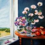 „Martwa natura z astrami” Obraz olej na płótnie. Wymiary: 40×40 cm. Rok powstania 2018. Obraz pokryty werniksem. Boki zamalowane w kolorze tła obrazu toteż nie wymaga natychmiastowej oprawy. Obraz nie ma ram Autor: Teresa Kopańska – artysta plastyk, malarz.