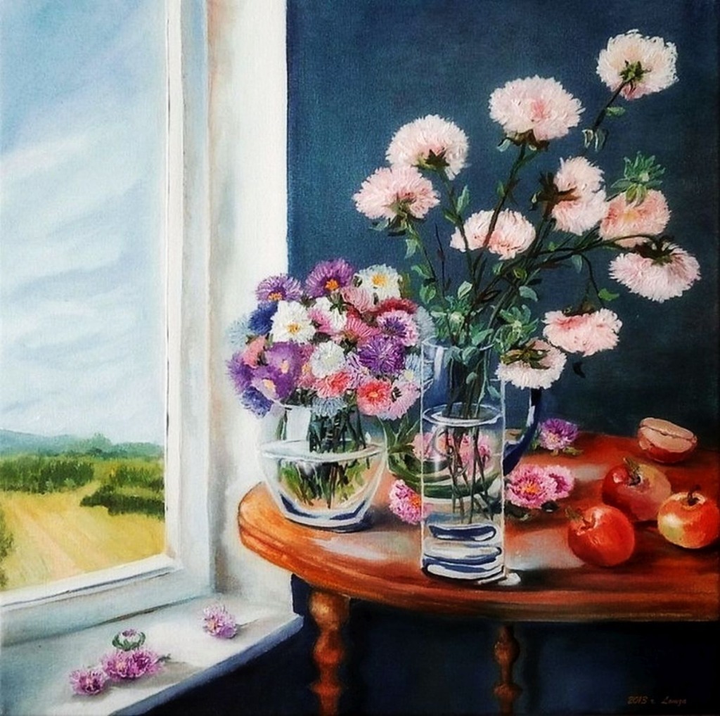 „Martwa natura z astrami” Obraz olej na płótnie. Wymiary: 40×40 cm. Rok powstania 2018. Obraz pokryty werniksem. Boki zamalowane w kolorze tła obrazu toteż nie wymaga natychmiastowej oprawy. Obraz nie ma ram Autor: Teresa Kopańska – artysta plastyk, malarz.