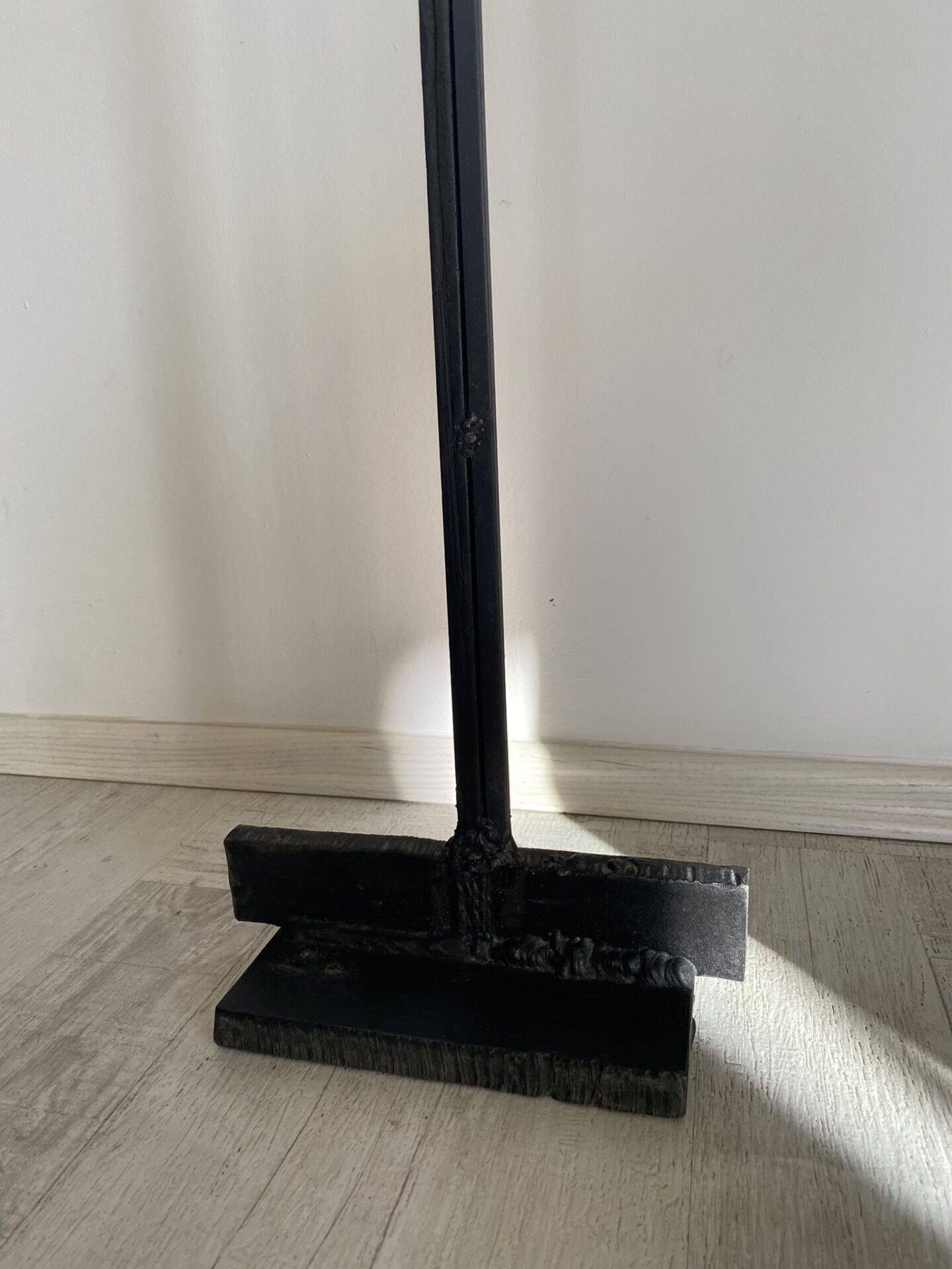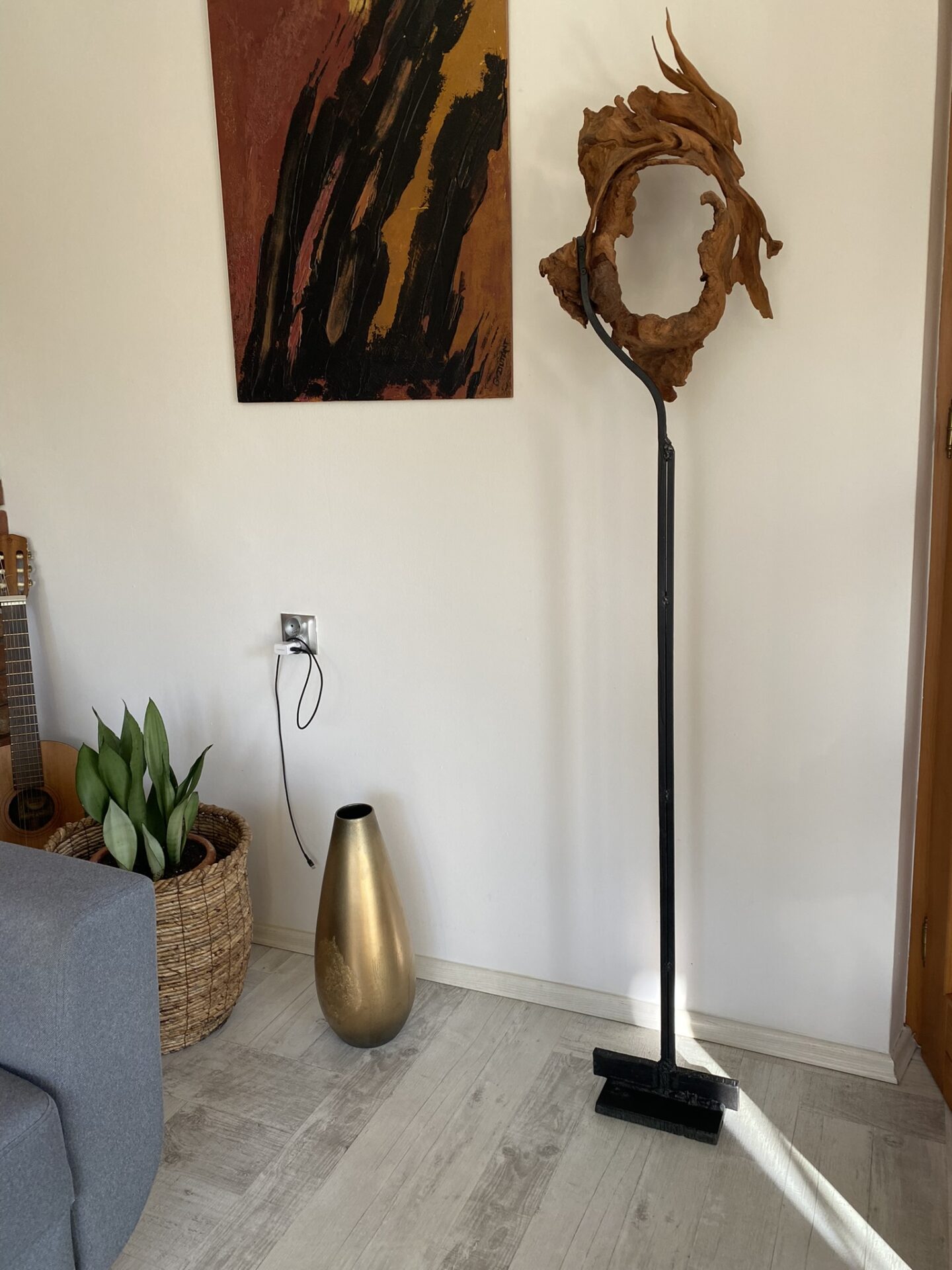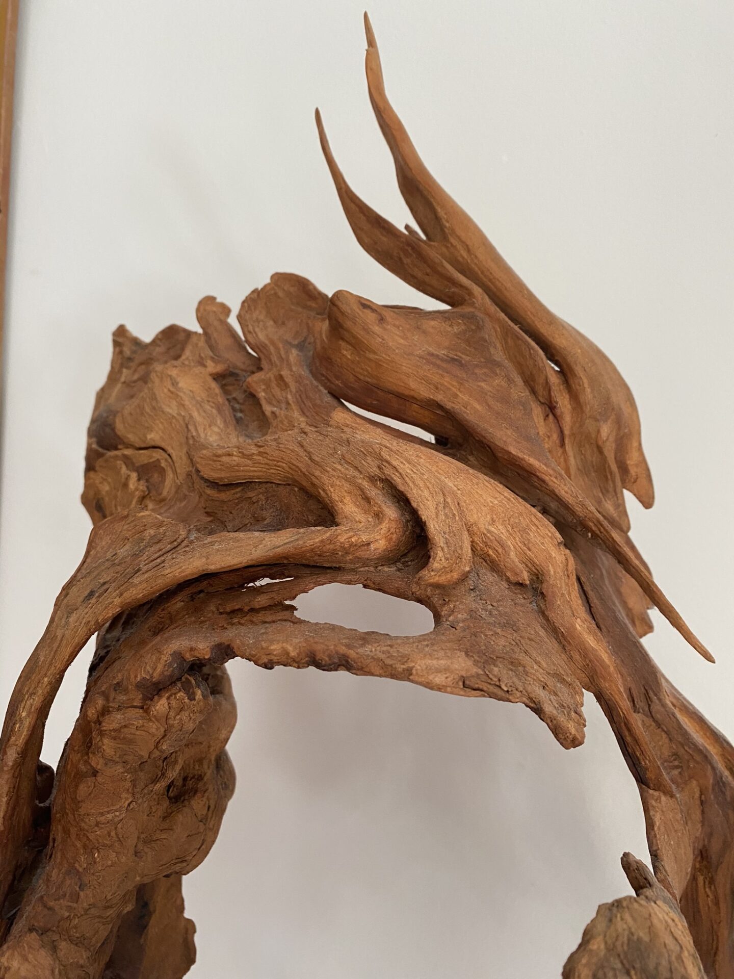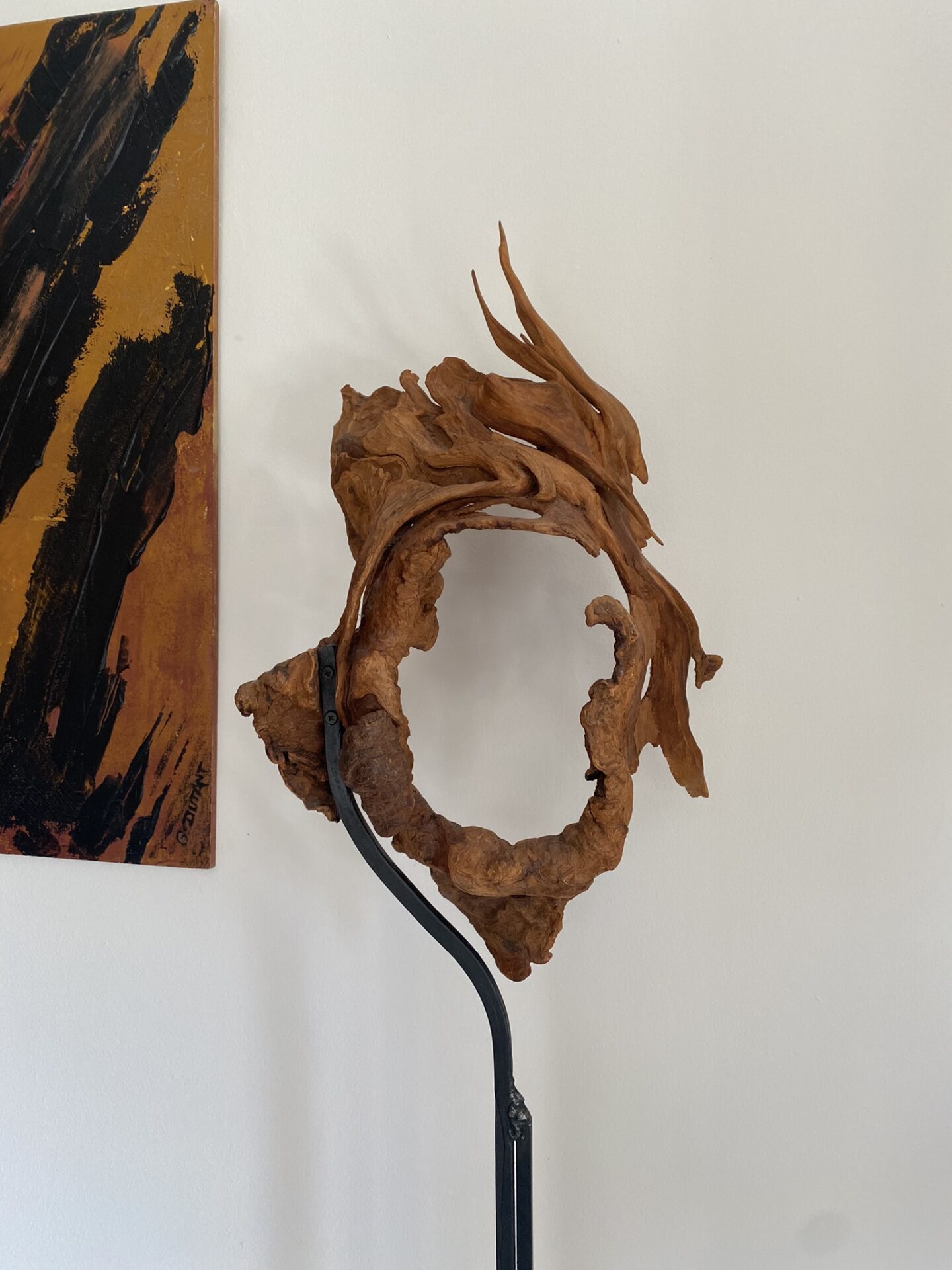 Nowoczesna rzeźba maska którą stanowi naturalny korzeń w połączeniu z metalem patynowanym