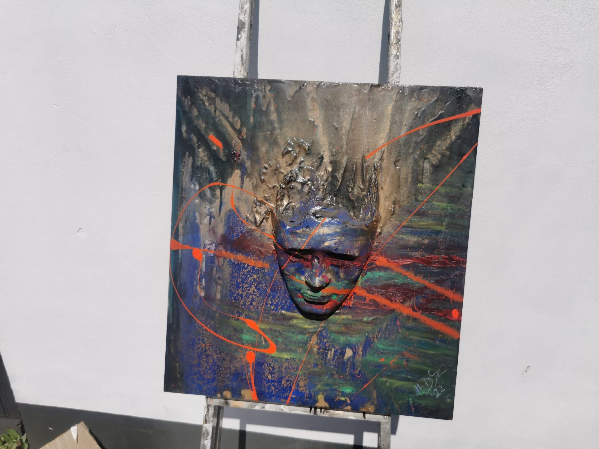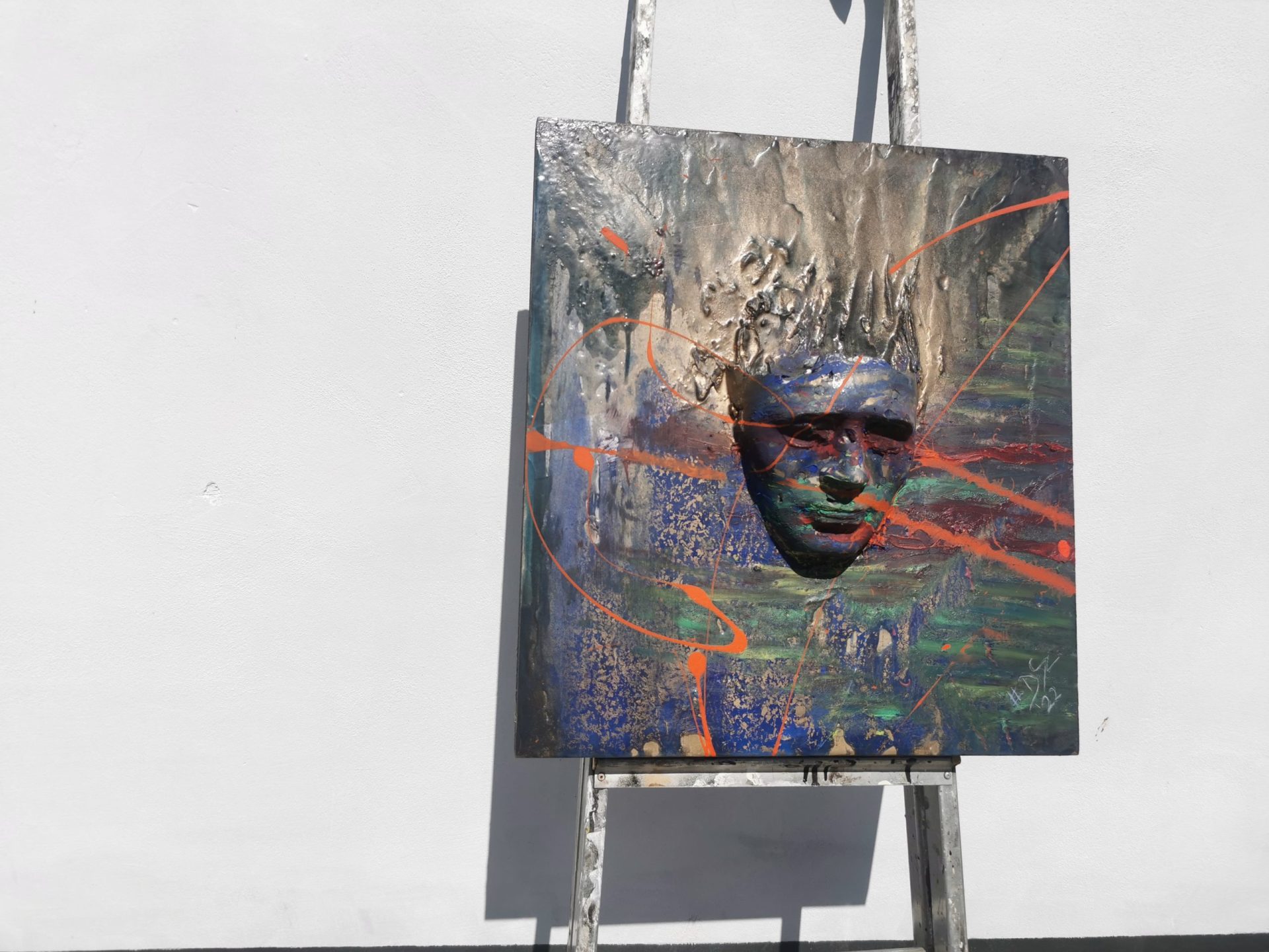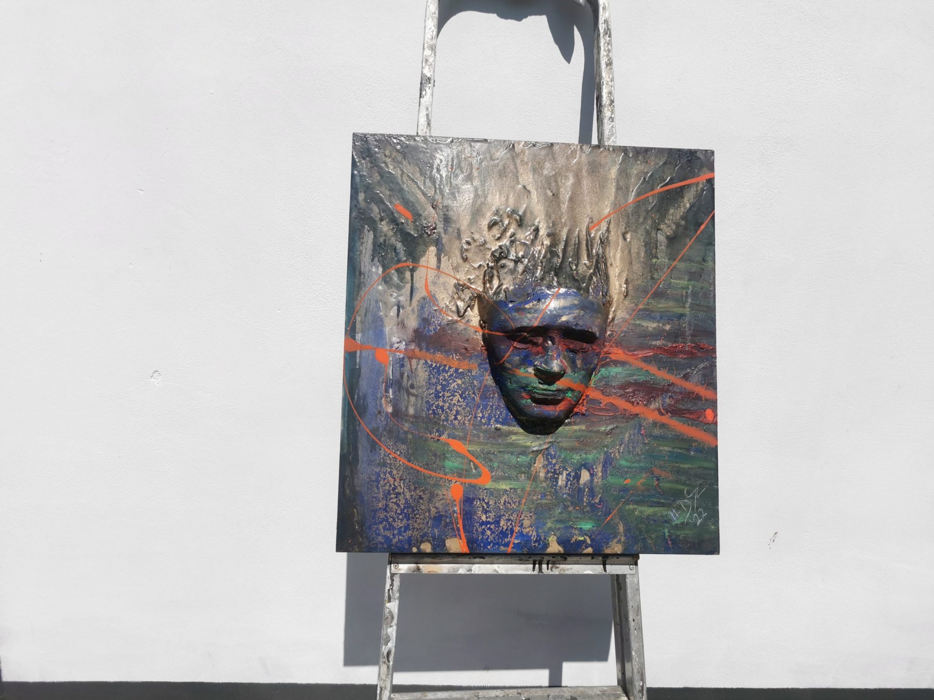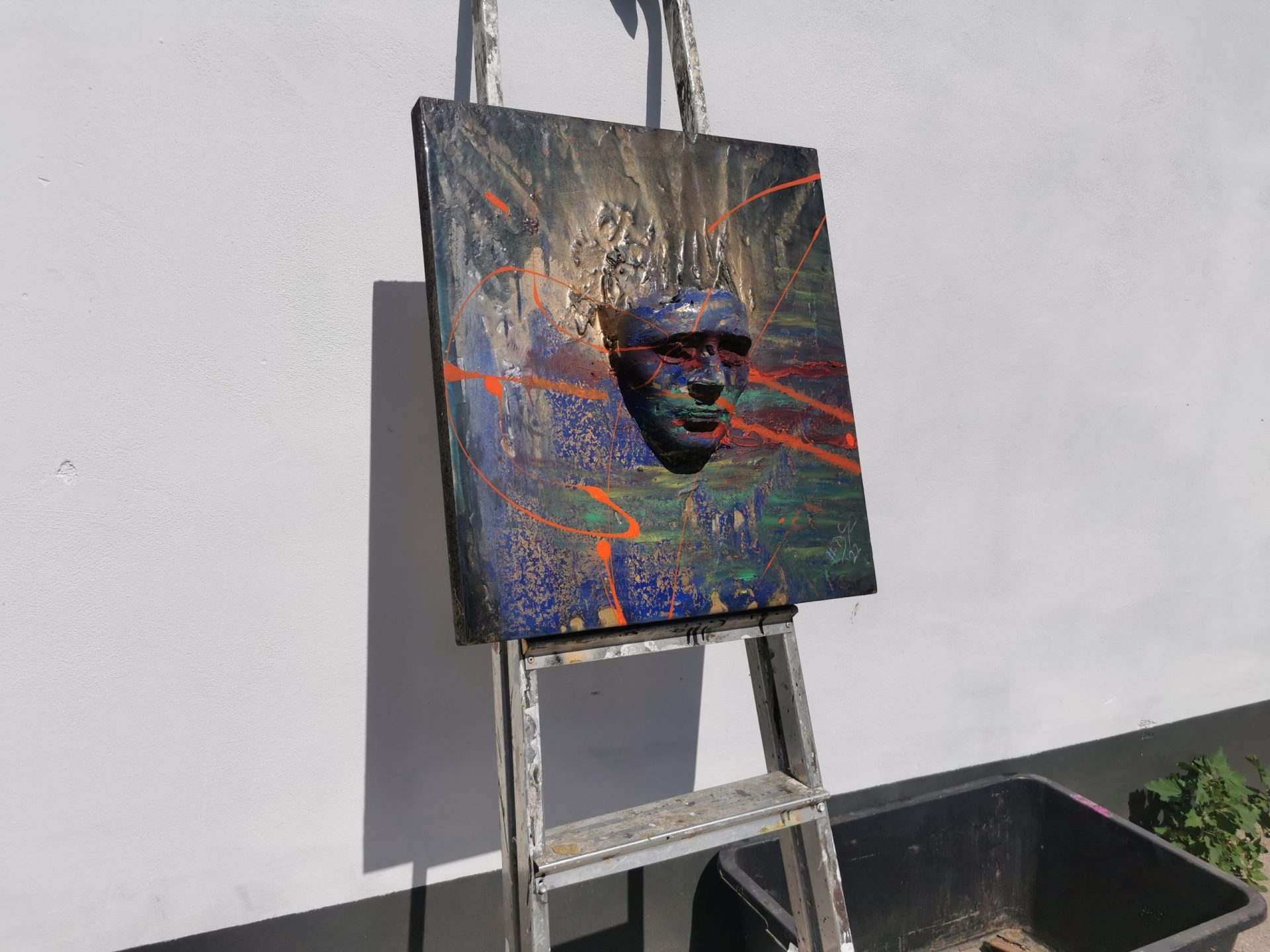 Praca o tytule #maska w rozmiarze 56×60 cm na płycie! / desce grubości 4 cm