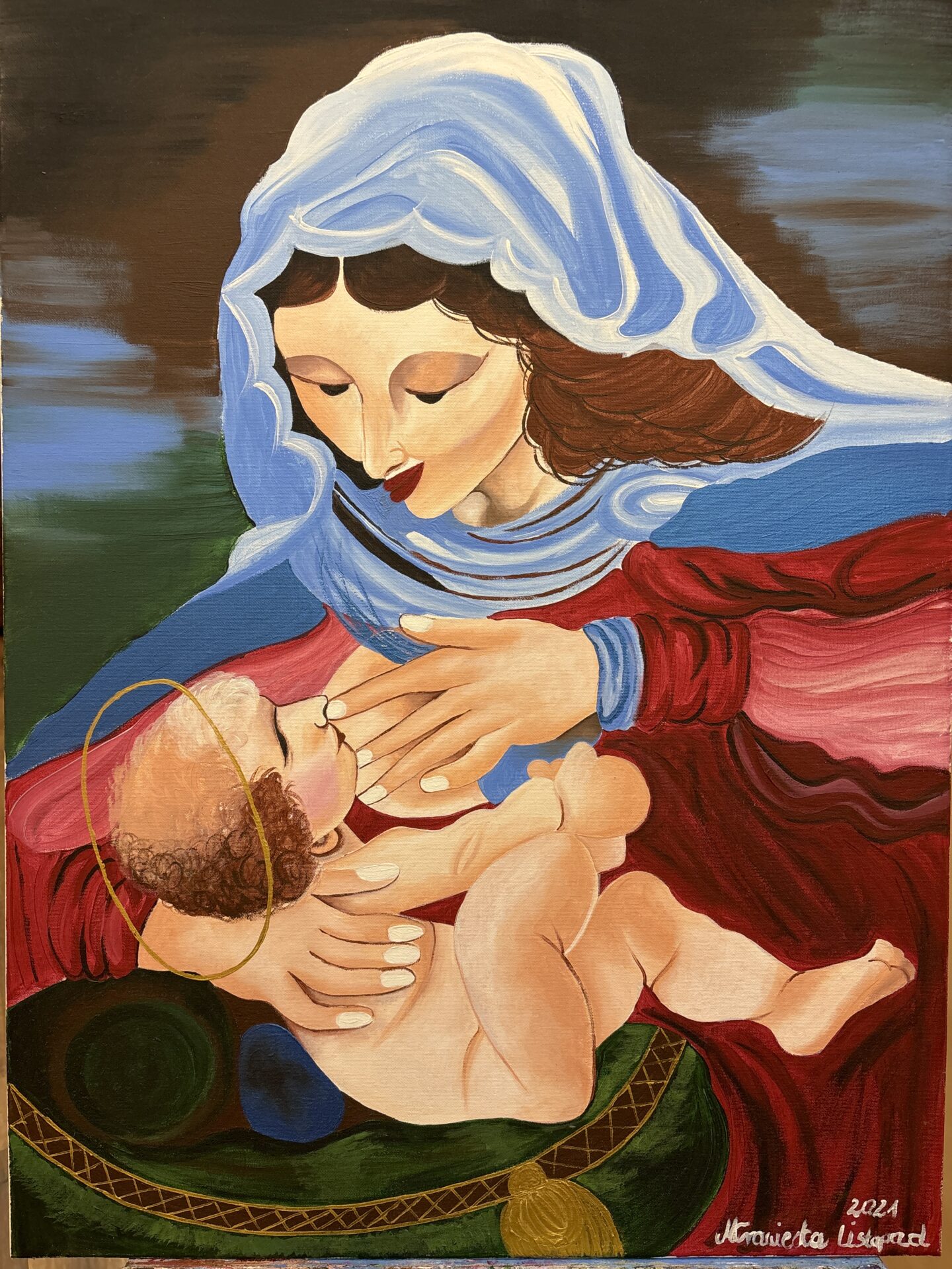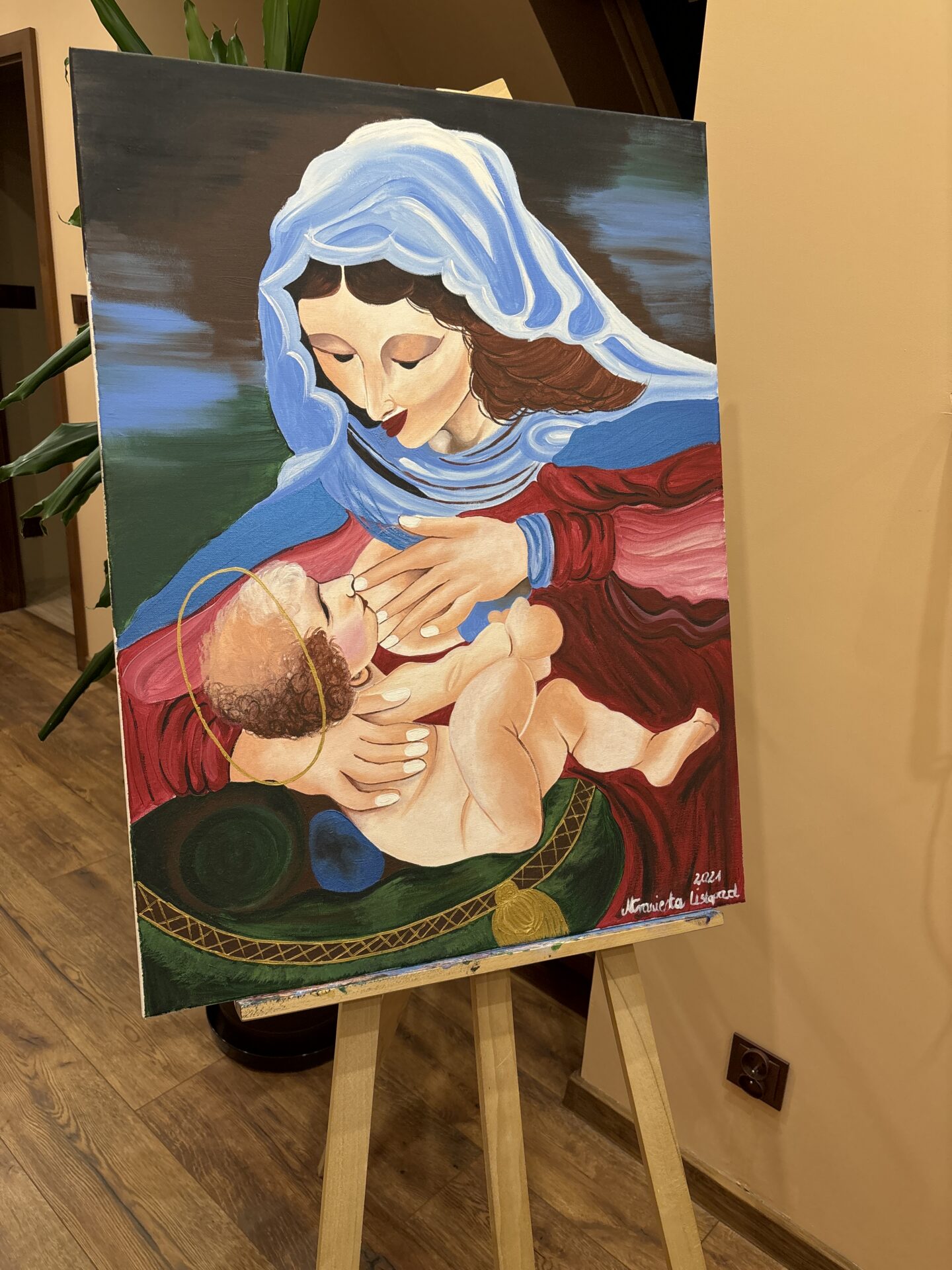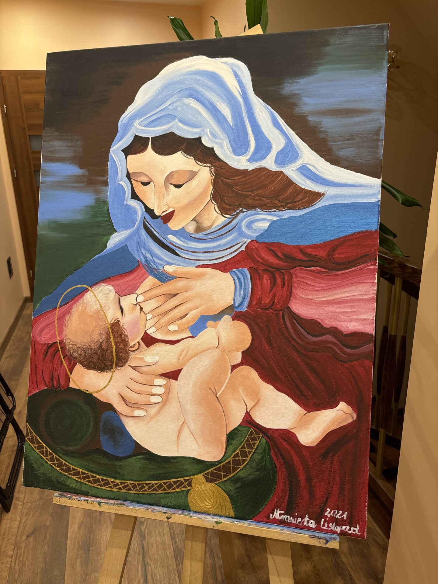 Obraz Matko Bożej karmiącej z Dzieciątkiem. Obraz malowany farbami akrylowymi na płótnie. W każdym domu w którym wisi obraz matki Boskiej karmiącej jest pomyślności i szczęście. Jest symbolem Macierzyństwa miłości i poświęcenia