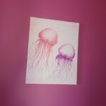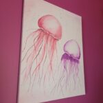 Przedstawia dwie meduzy. Są to piękne i tajemnicze organizmy, żyjące w odmętach oceanów. Obraz wprowadza w nostalgię i ukazuje lekkość oraz majestat morskich stworzeń.