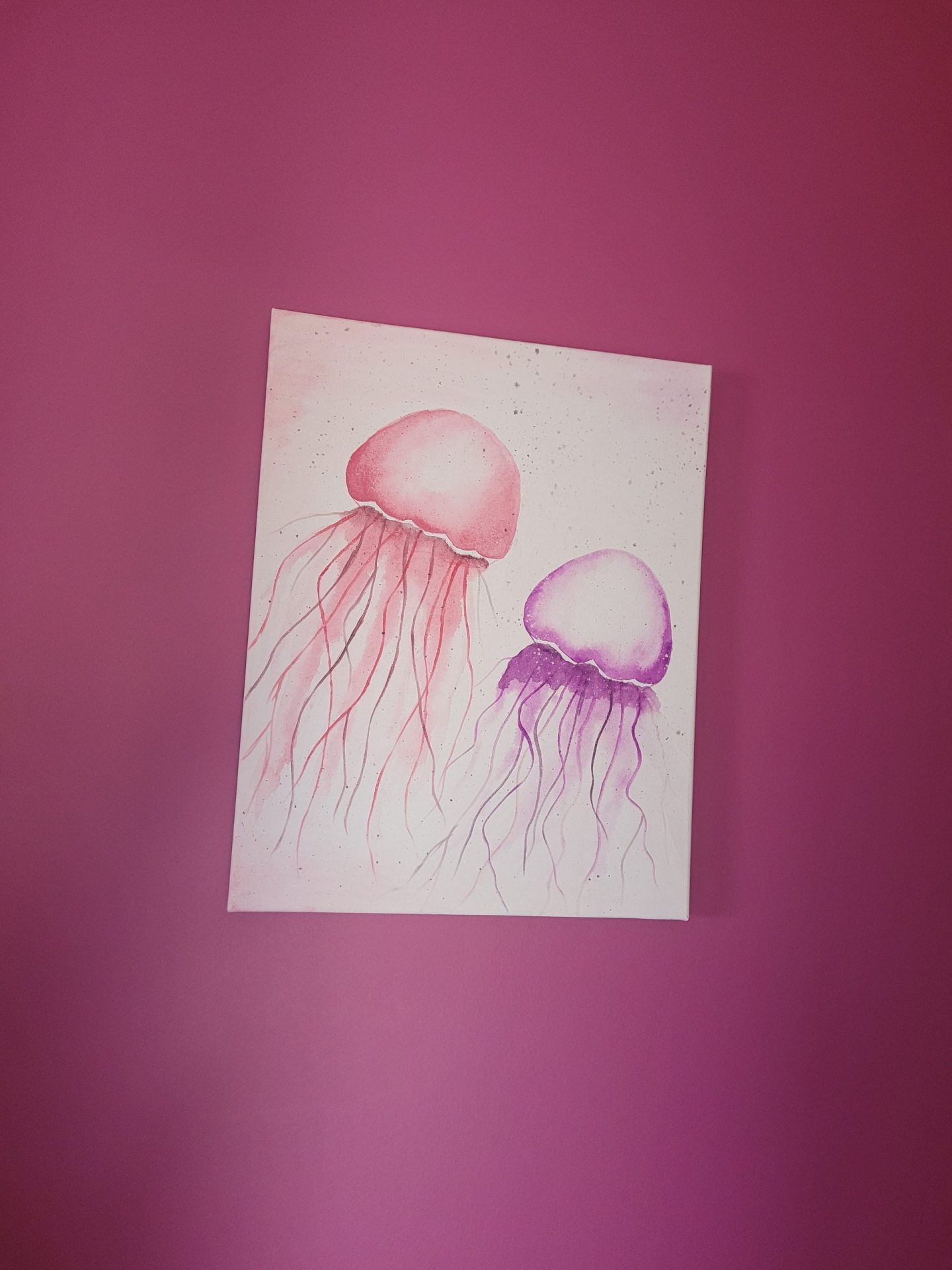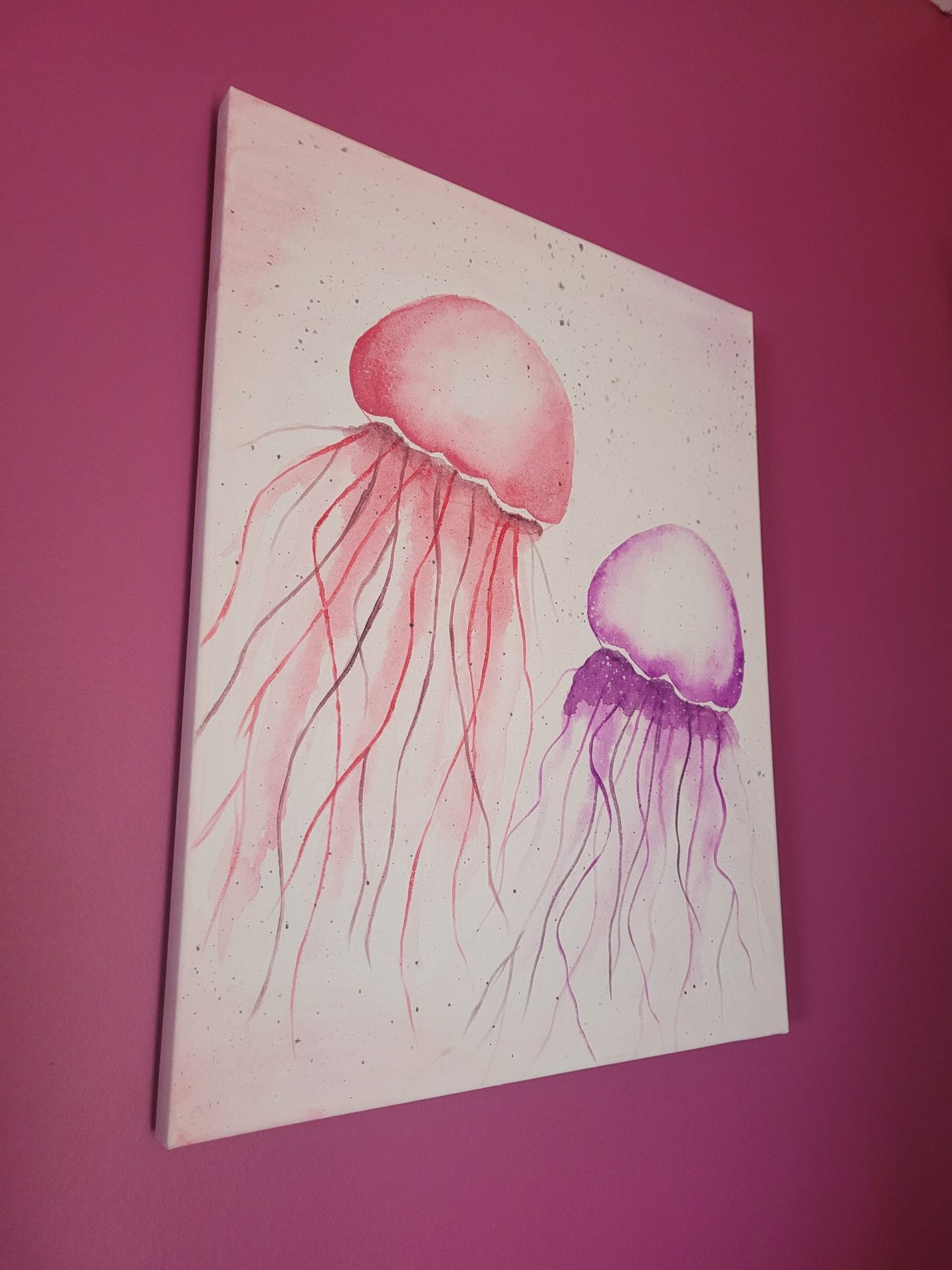 Przedstawia dwie meduzy. Są to piękne i tajemnicze organizmy, żyjące w odmętach oceanów. Obraz wprowadza w nostalgię i ukazuje lekkość oraz majestat morskich stworzeń.