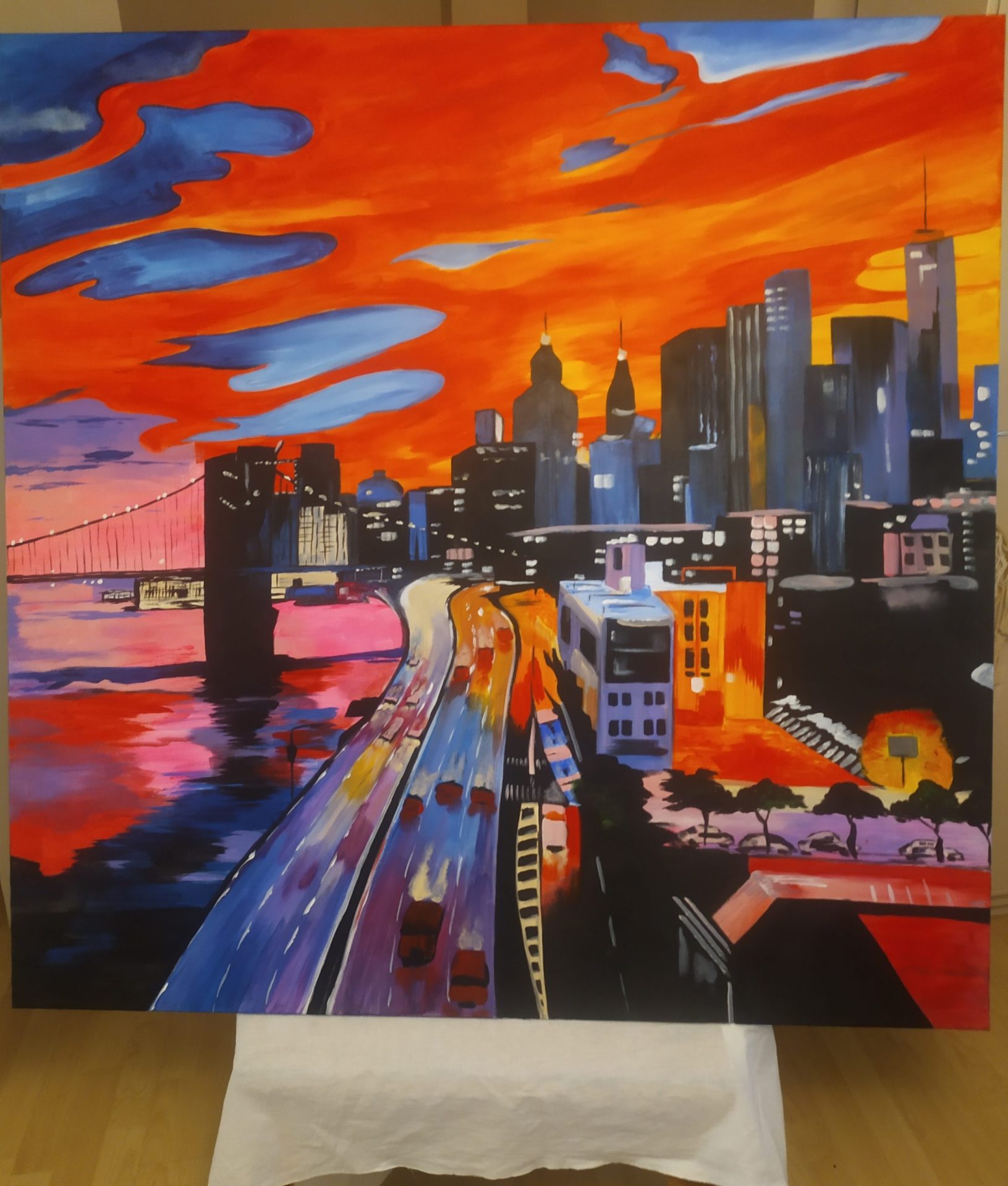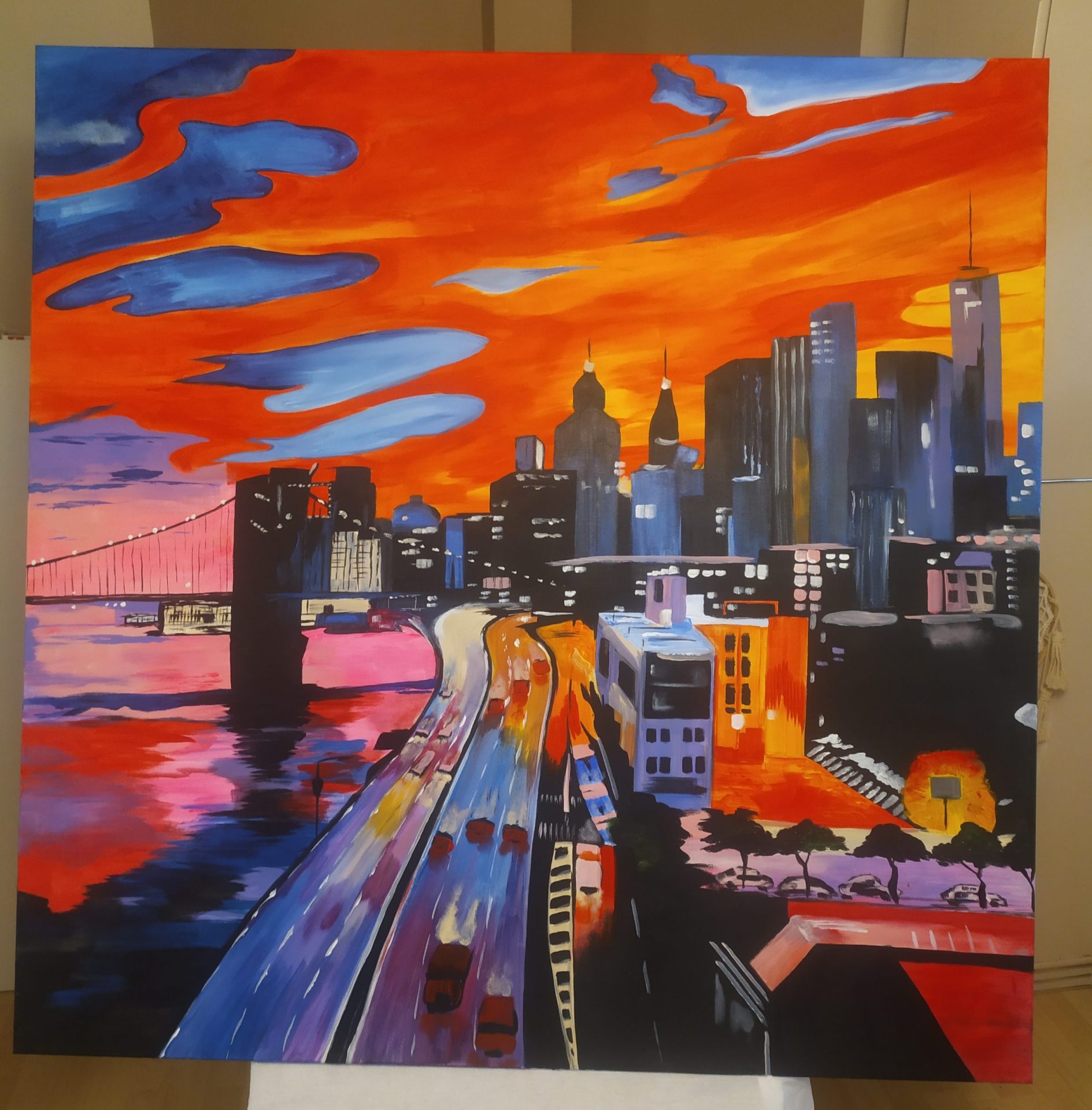 Obraz namalowany na płótnie akrylami, pokryty werniksem 120/120. NYC o zachodzie słońca.Kolorowy, żywy