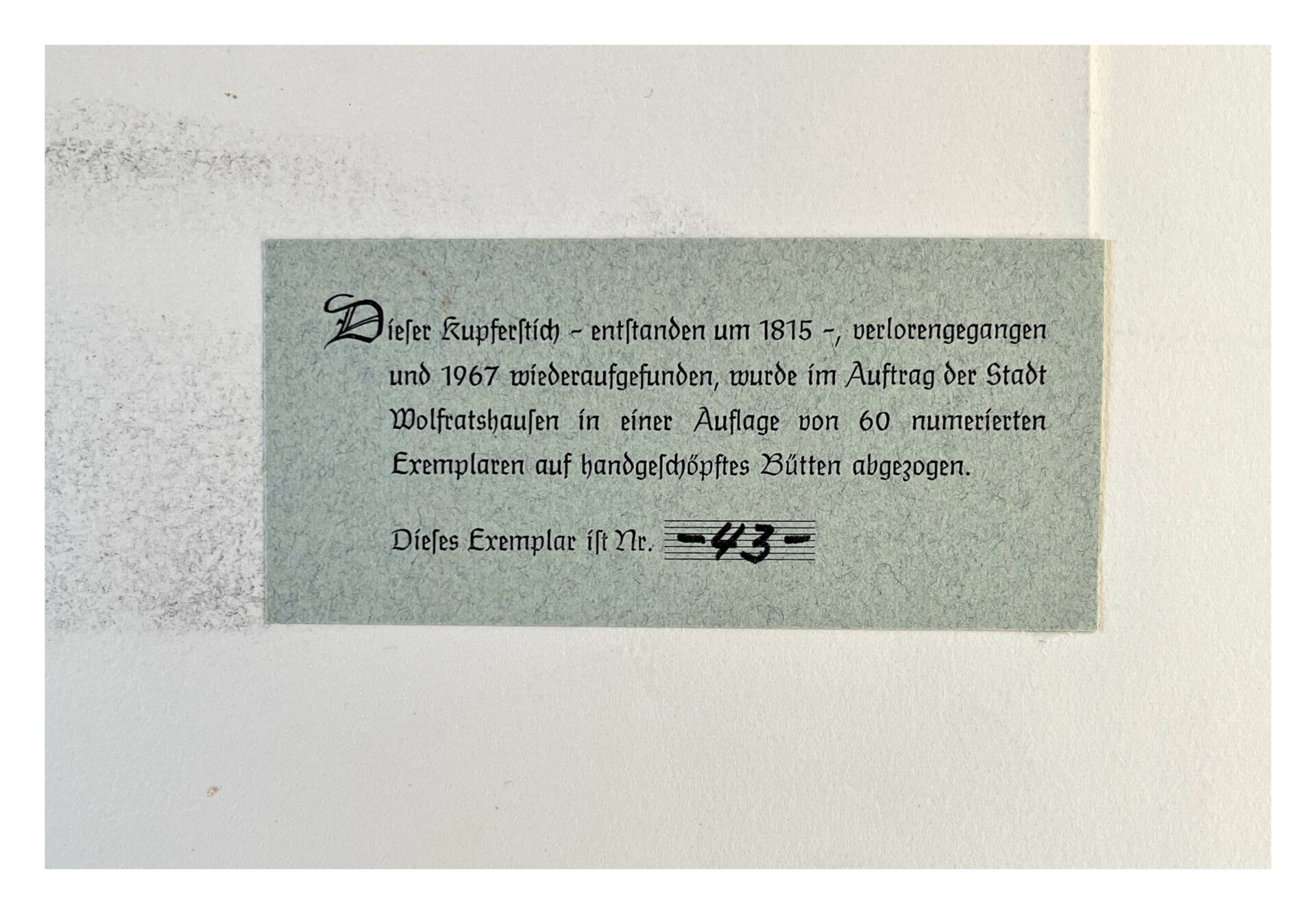 Ten miedzioryt, wykonany około 1815 r., zaginął i został ponownie odnaleziony w 1967 r. i został wydrukowany na papierze czerpanym w nakładzie 60 numerowanych egzemplarzy na zlecenie miasta Wolfratshausen.Ten egzemplarz ma numer 43-