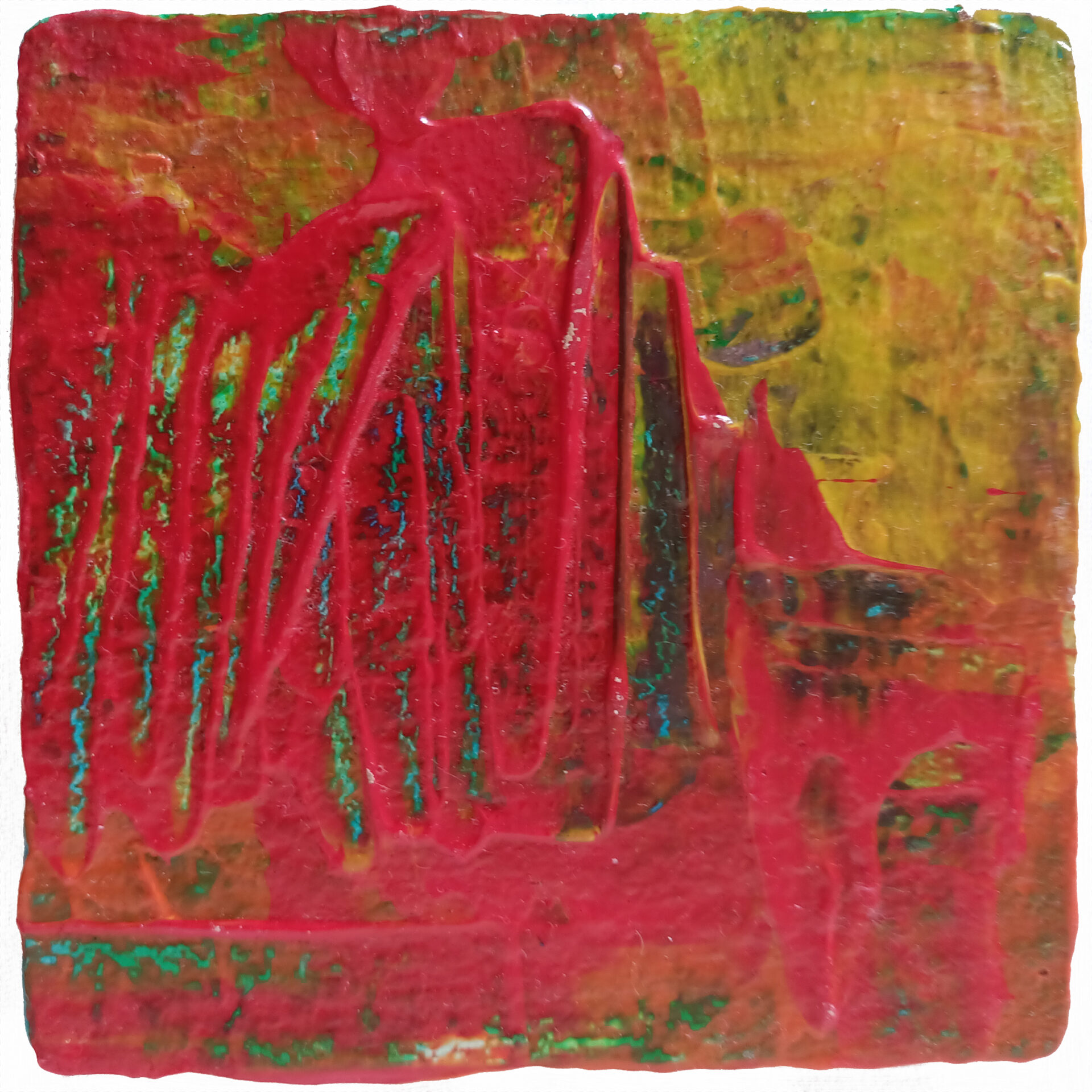 Miniaturowa abstrakcja w kolorach czerwieni, pomarańczu, żółci i zieleni, namalowana wysokiej jakości farbami akrylowymi na płytce z korka. Obraz zawerniksowany.