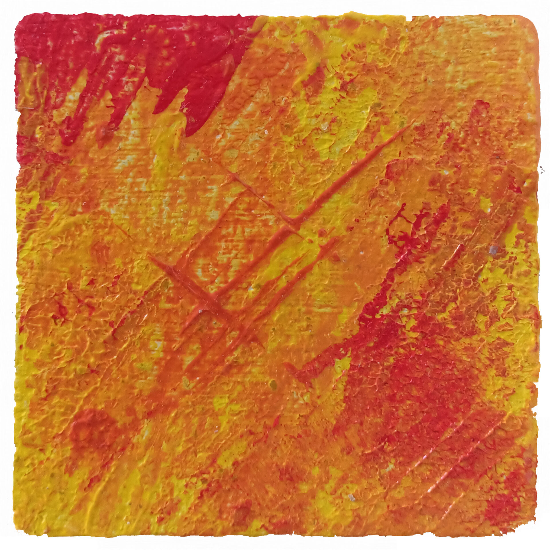 Miniaturowa abstrakcja w kolorach czerwieni, pomarańczu i żółci, namalowana wysokiej jakości farbami akrylowymi na płytce z korka. Obraz zawerniksowany.