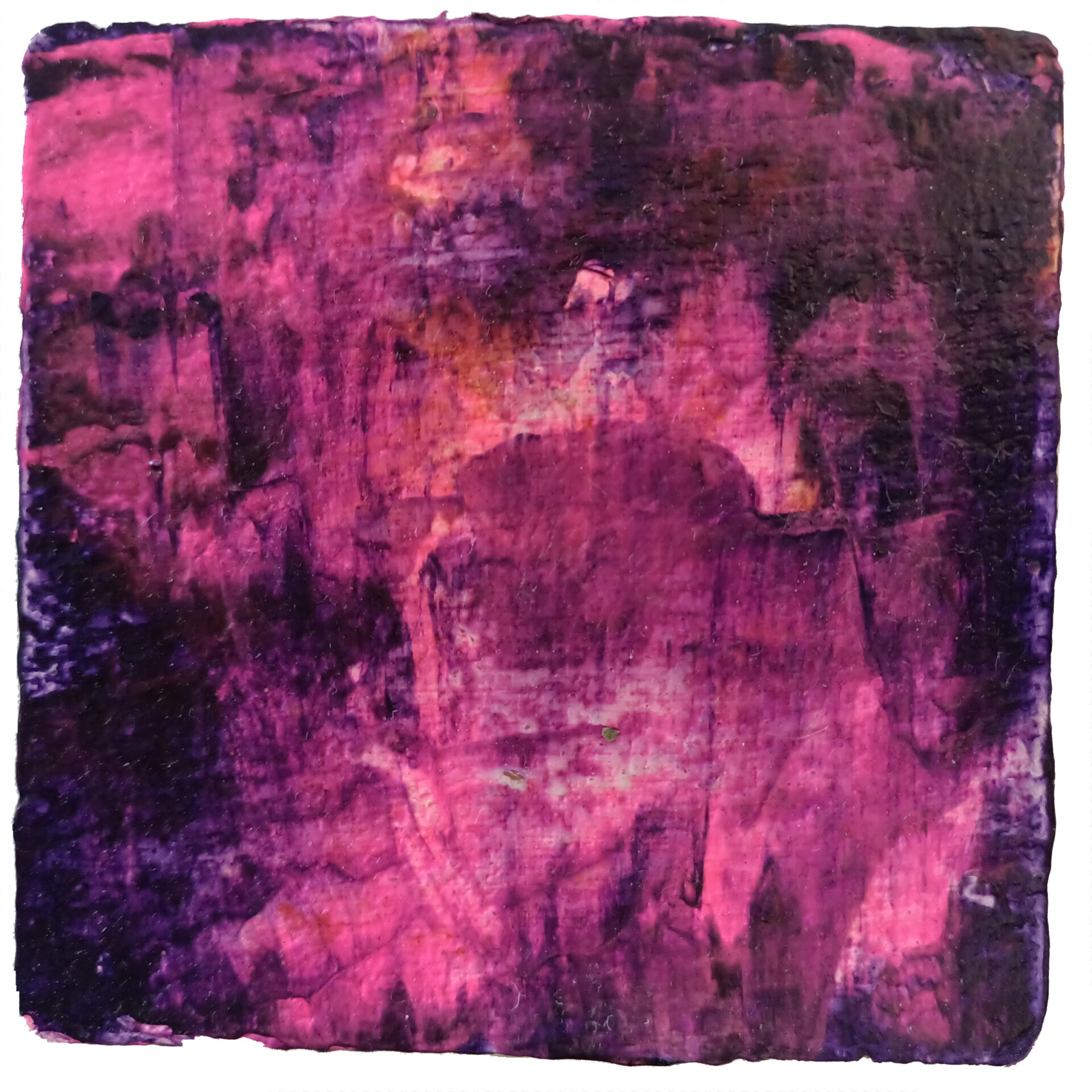 Miniaturowa abstrakcja w kolorach czerni, granatu, fioletu i różu, namalowana wysokiej jakości farbami akrylowymi na płytce z korka. Obraz zawerniksowany.
