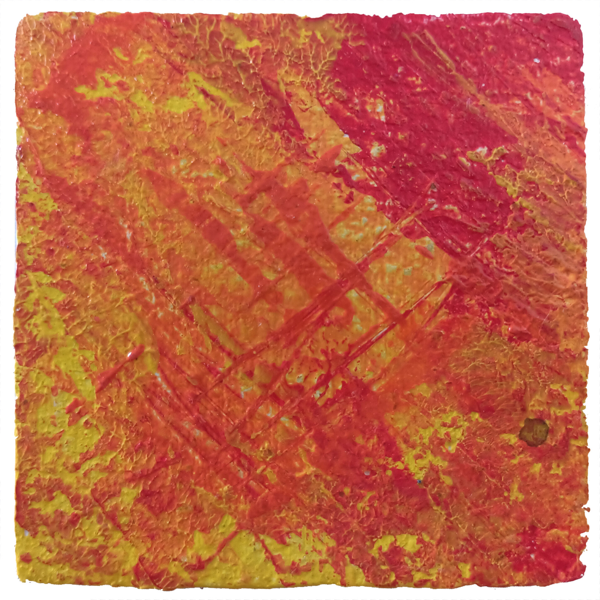 Miniaturowa abstrakcja w kolorach czerwieni, pomarańczu i żółci, namalowana wysokiej jakości farbami akrylowymi na płytce z korka. Obraz zawerniksowany.