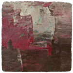 Miniaturowa abstrakcja w kolorach bieli, zieleni, brązu i bordo, namalowana wysokiej jakości farbami akrylowymi na płytce z korka. Obraz zawerniksowany.