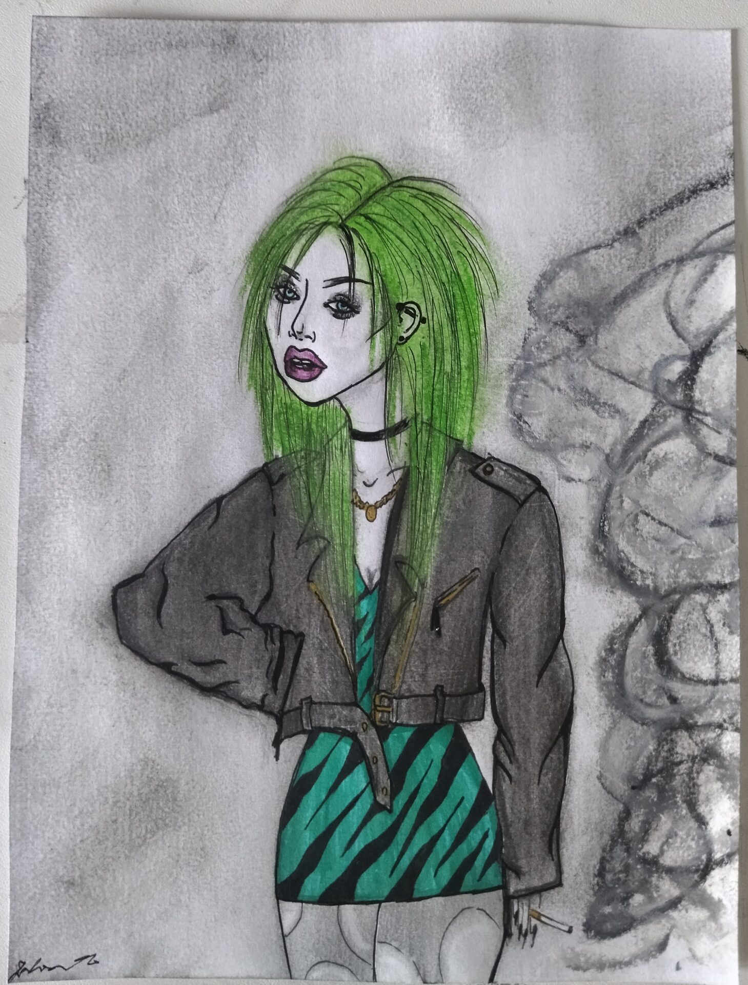 Luźna grafika przedstawiająca pankówe palącą papierosa narysowana węglami i cienkopisami